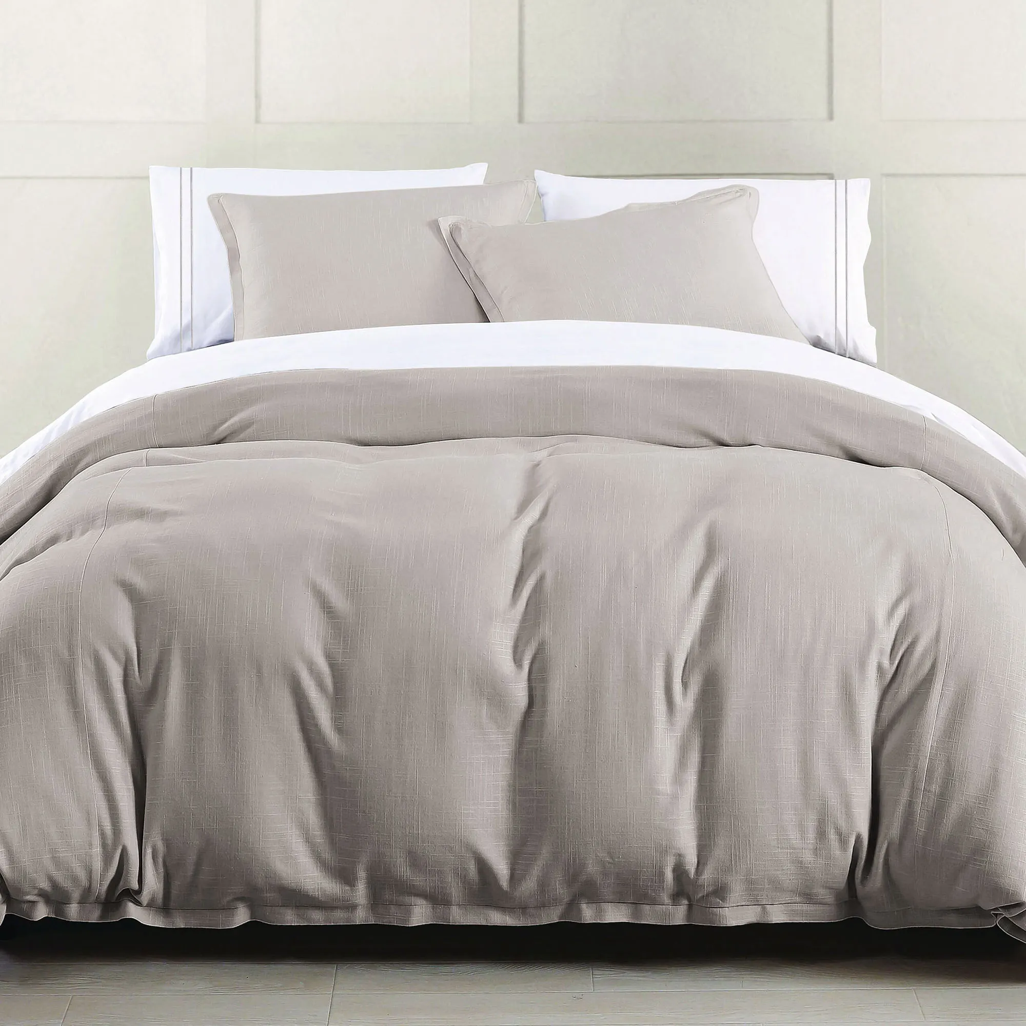 • Light taupe woven bedding