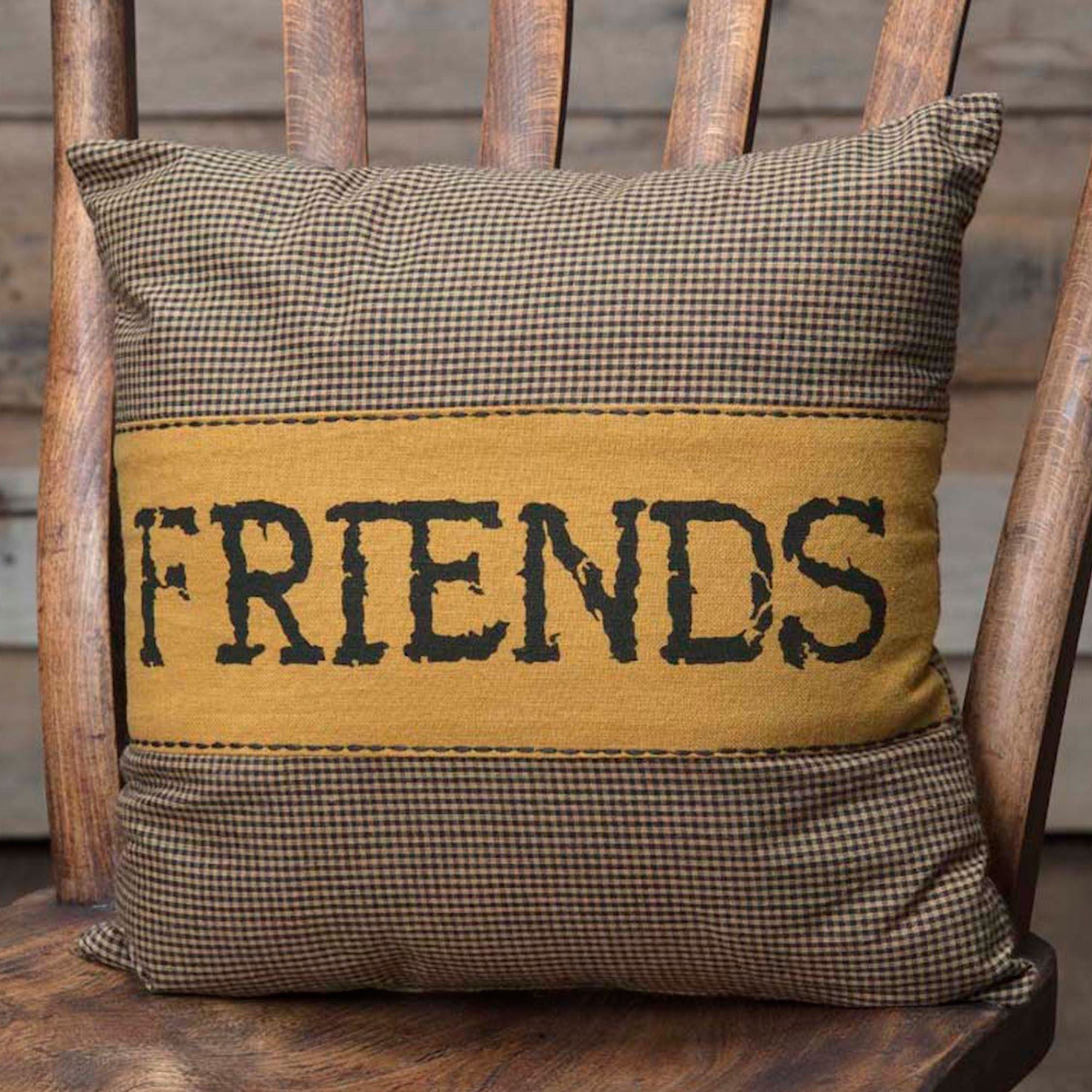 Pillows have tailored edges. Spot clean. Friends Square is black and tan gingham with a dark gold center printed with "FRIENDS;" reverses to gingham. Plaid Square is black, burgundy, and dark gold plaid; button back closure.