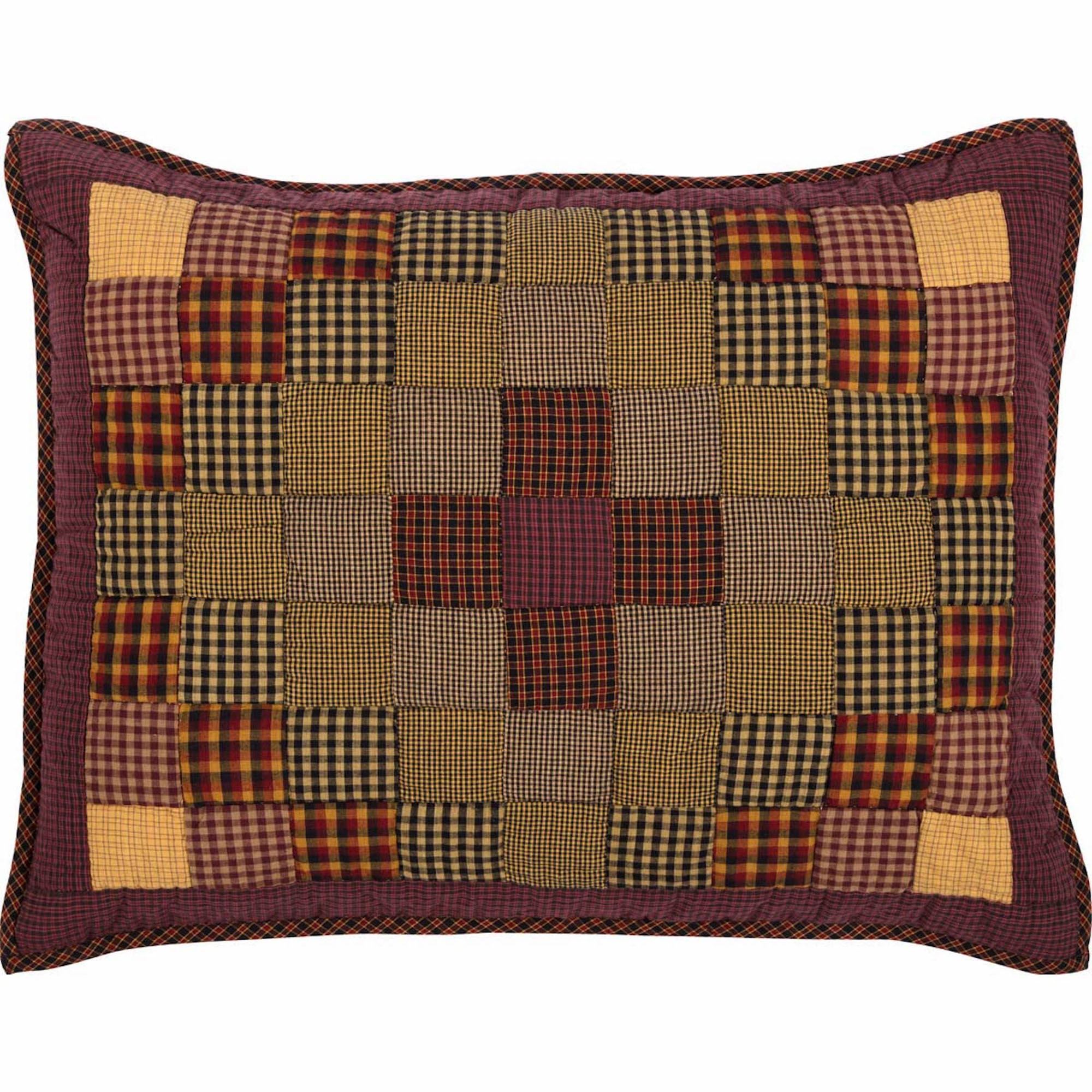 Dream of days long past with the charming comfort of the Heritage Farms Bedding. Hand-quilted and machine-pieced, the timeless patchwork cotton ensemble features various plaid motif blocks in shades of brick, cordovan, goldenrod, buff, light taupe, tan, black, burgundy, and dark gold. Due to the handmade nature of this product, minor variations may occur.