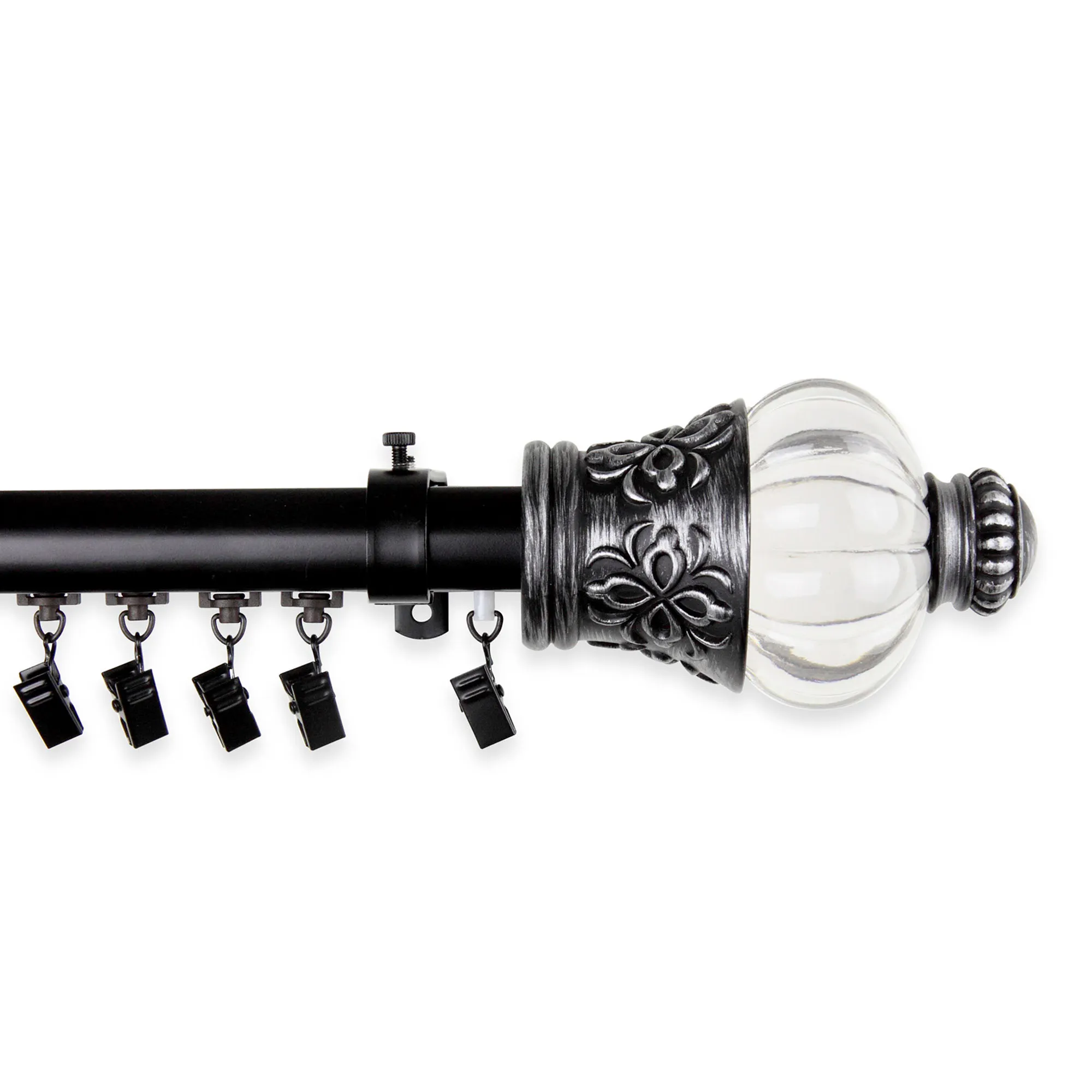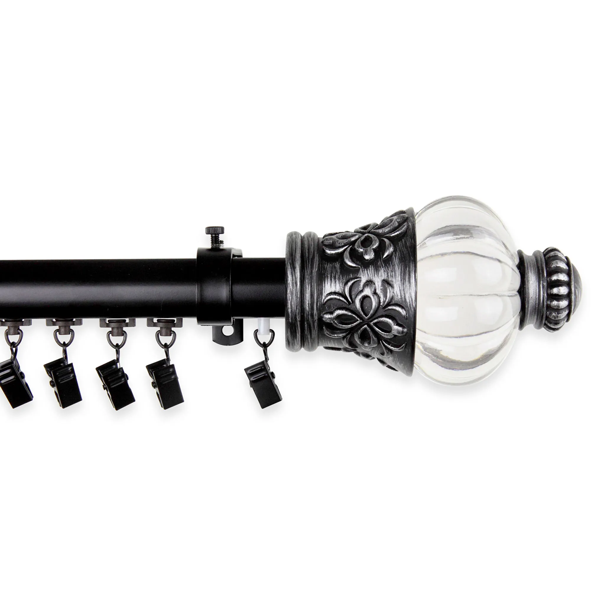 The Heritage Traverse Rod Set charms your view with traditional detailing. The 1.5" dia. steel rod has two decorative transparent resin finials with fluting, a shaped crown accent, and floral medallions. Black has brushed silver accents and a clear design. Cocoa has an amber-hued design. Each finial measures 3.25"dia.x5"L. The cordless, hand-drawn, smooth-glide curtain rod features pre-attached clips that can be used with your pinch-pleat or rod-pocket panels for a grand look. Indoor use only. Capable of a center-open or one-way draw, the rod set includes one adjustable traverse rod with sliders, two finials, brackets that project 3.875", and mounting hardware. The 28"-48" has 2 brackets and 10 sliders. The 48"-86" has 3 brackets and 20 sliders. The 86"-120" has 4 brackets and 30 sliders. The 110"-156" has 4 brackets and 40 sliders.