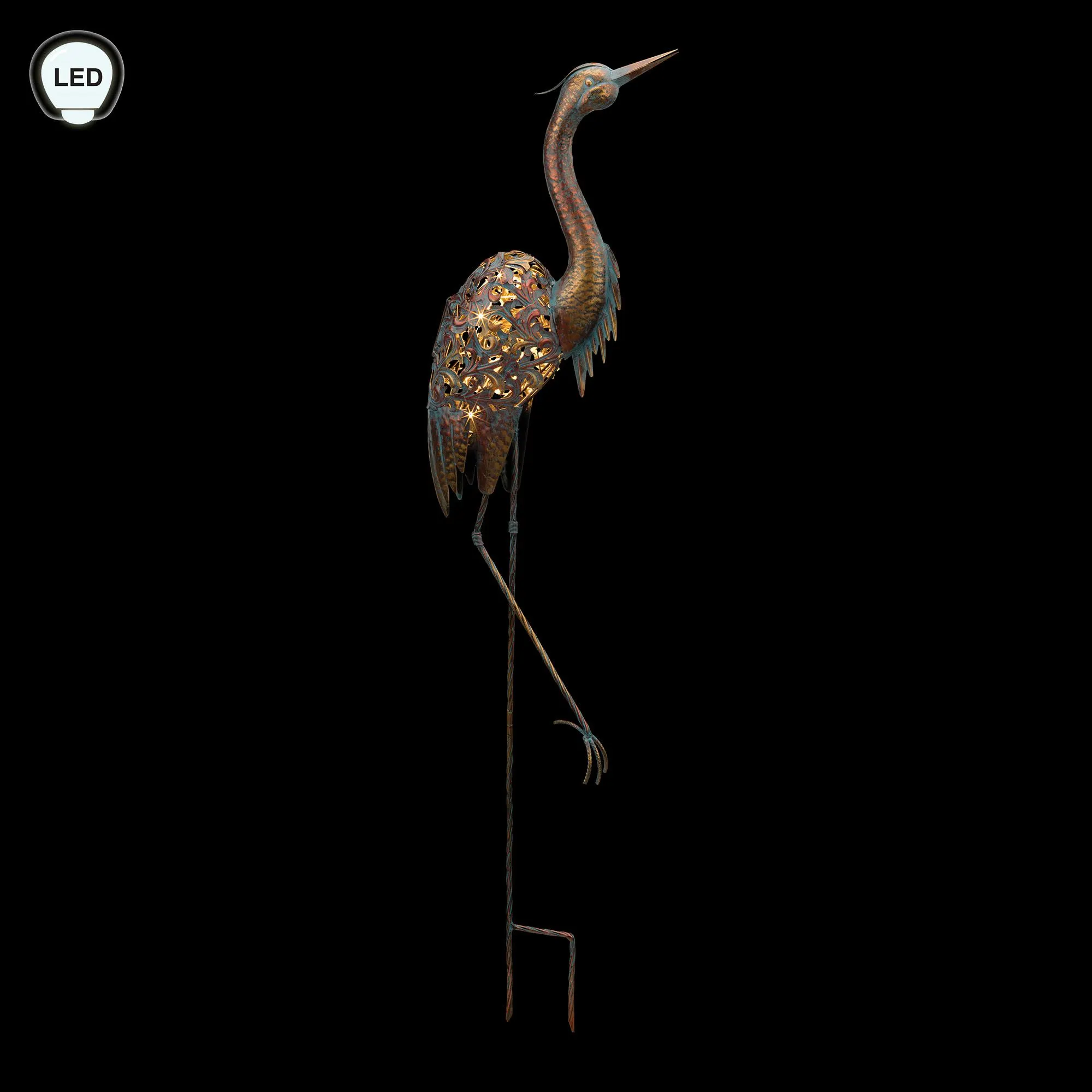 Glimpse the beautiful sight of a Heron at Night with this charming lighted outdoor sculpture. Handcrafted from metal, the realistic design features a wonderful handpainted copper patina powder-coat finish throughout the magnificent body and detailed open scrollwork wings. The interior LED lights shine to create a dynamic display; requires the one included AA rechargeable, replaceable battery that provides 6-8 continuous hours of light at night. The solar panels are waterproof. A pronged stake provides a stable foundation. For outdoor year-round use. Overall, the lighted heron sculpture measures 11.5"Wx4.5"Dx46"H.