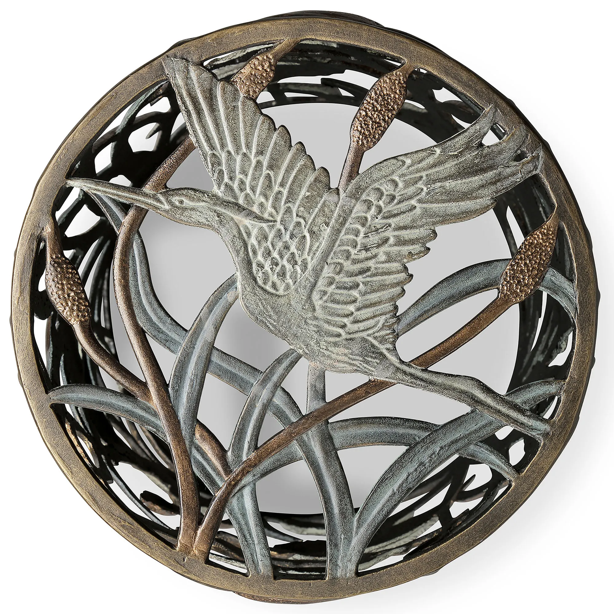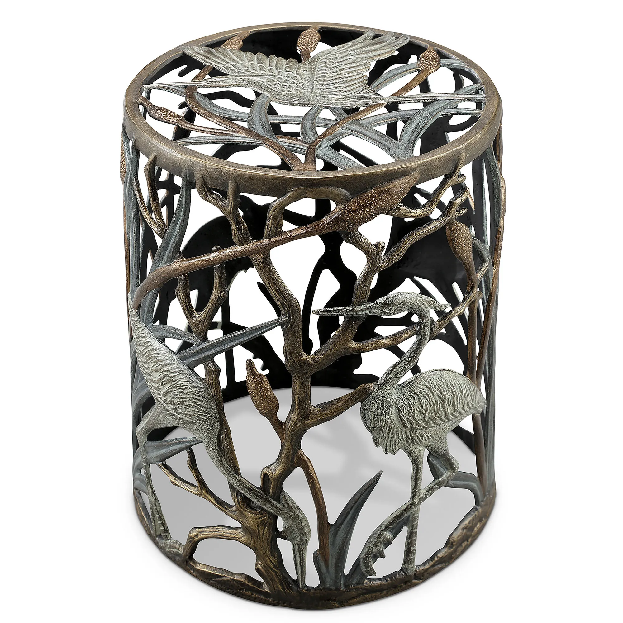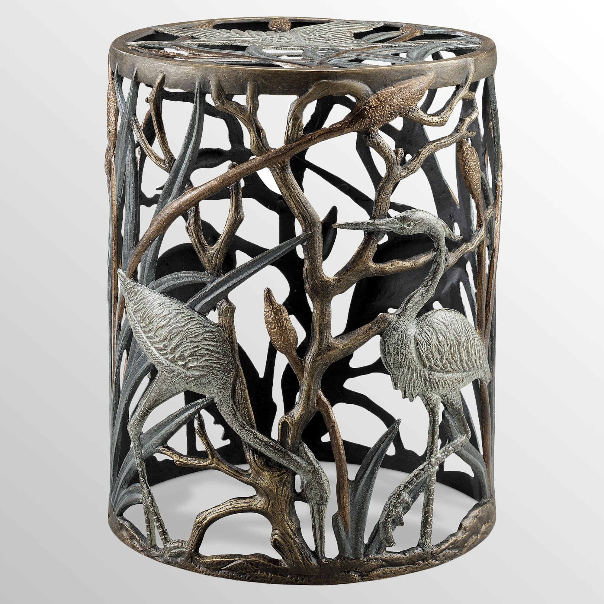 A beautiful Heron Flock pauses to take in your surroundings from this garden stool accent table. Perfect indoors or outdoors year round, the multifunctional furnishing is hand-cast from aluminum in an openwork, sculptural style. Detailed with bronze, gold, and gray washes, the table sides feature herons standing among the branches, while the tabletop showcases a heron flying over the cattails. Overall, the round accent table measures 12.5"dia.x16.5"H.
