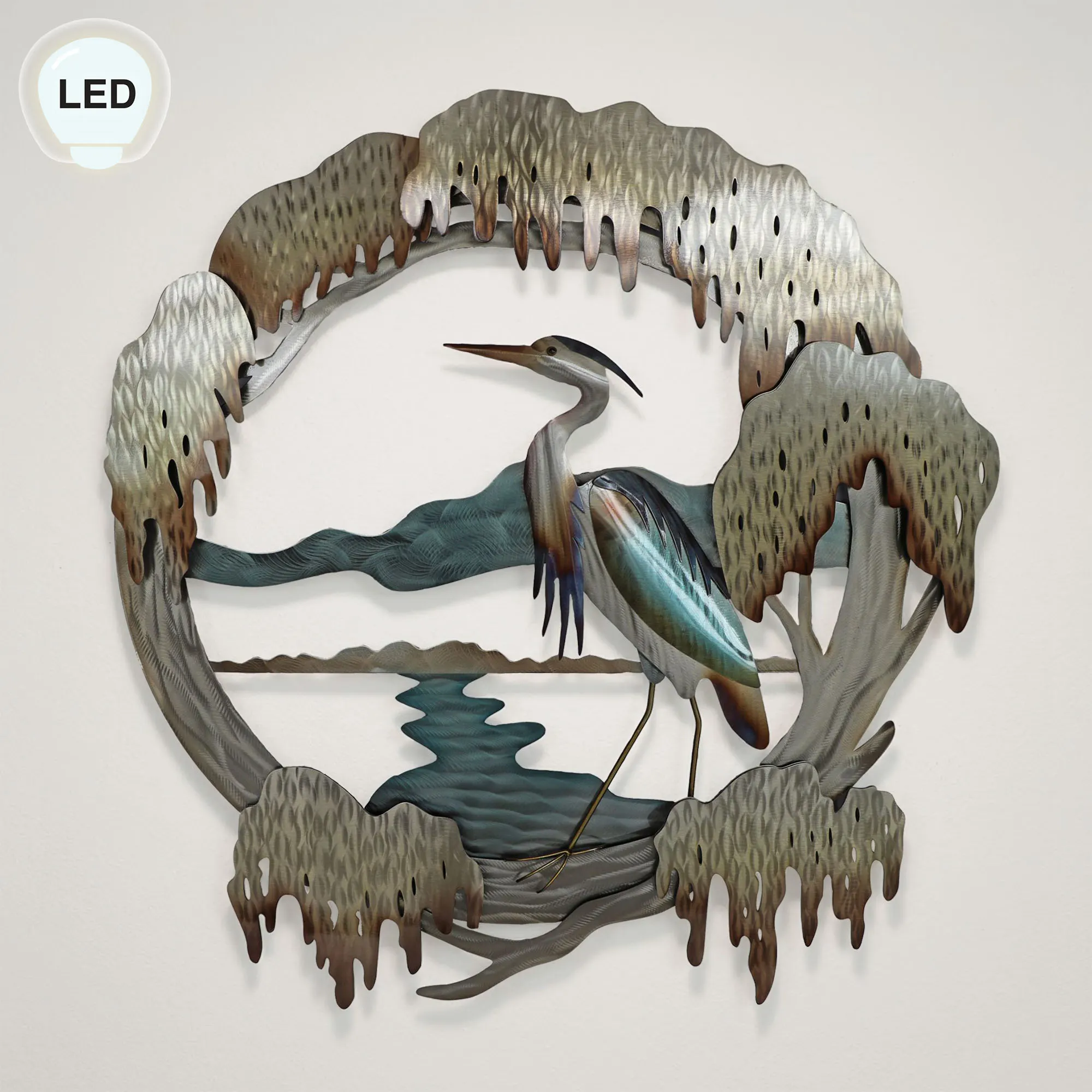 Heron in Cypress LED Lighted Indoor Outdoor Handcrafted Metal Wall Sculpture