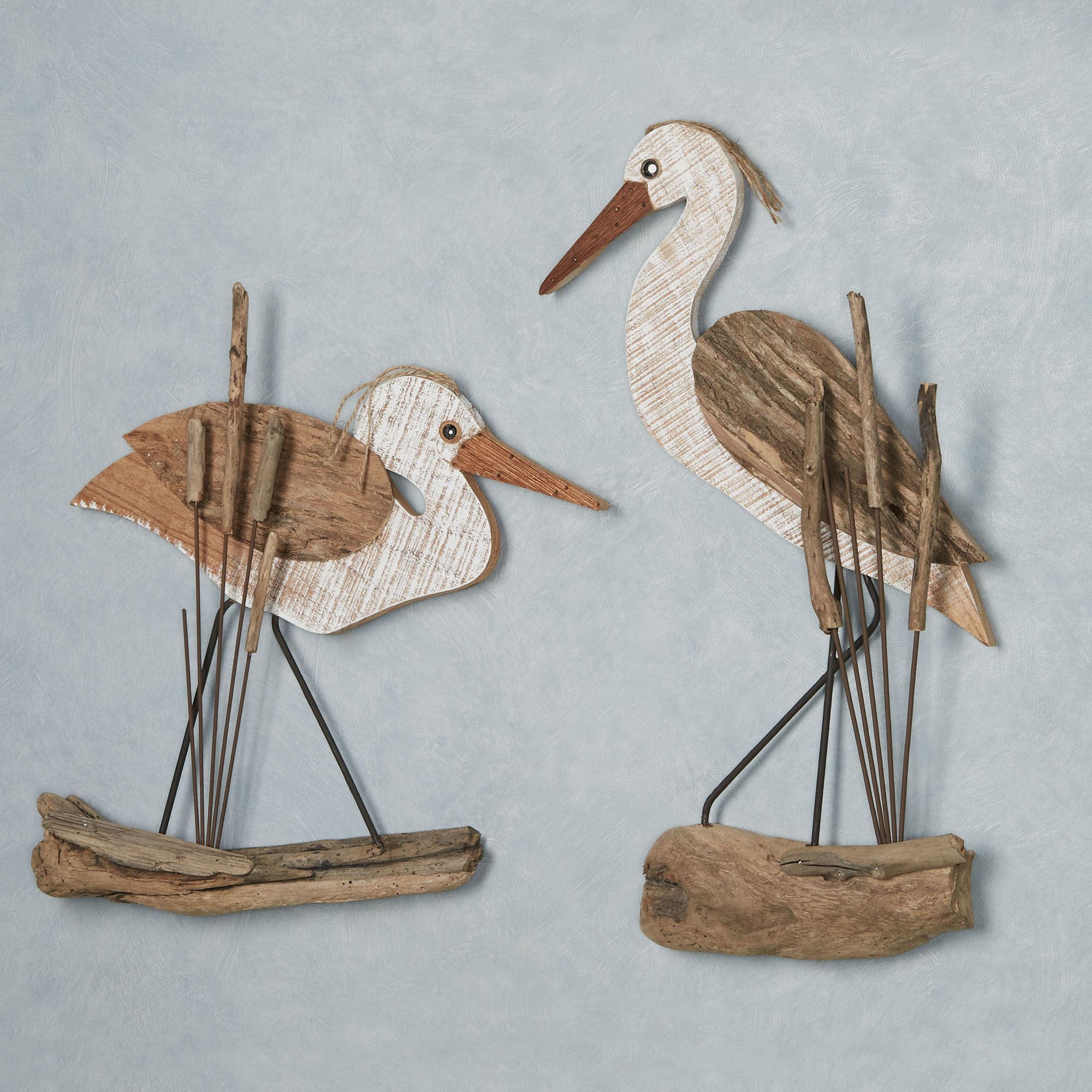 Nestled along the water's edge, these Herons live the coastal high life. Designed by artist Joanne Ferrara, this handcrafted wall art set is made from found objects such as pallet wood and driftwood hand-finished in whitewash and natural hues. With metal legs, each heron stands on driftwood next to cattails. Due to the handcrafted nature and found materials, variations will occur. Crouched heron is 16"Wx2"Dx19"H; standing heron is 13"Wx2"Dx24"H.