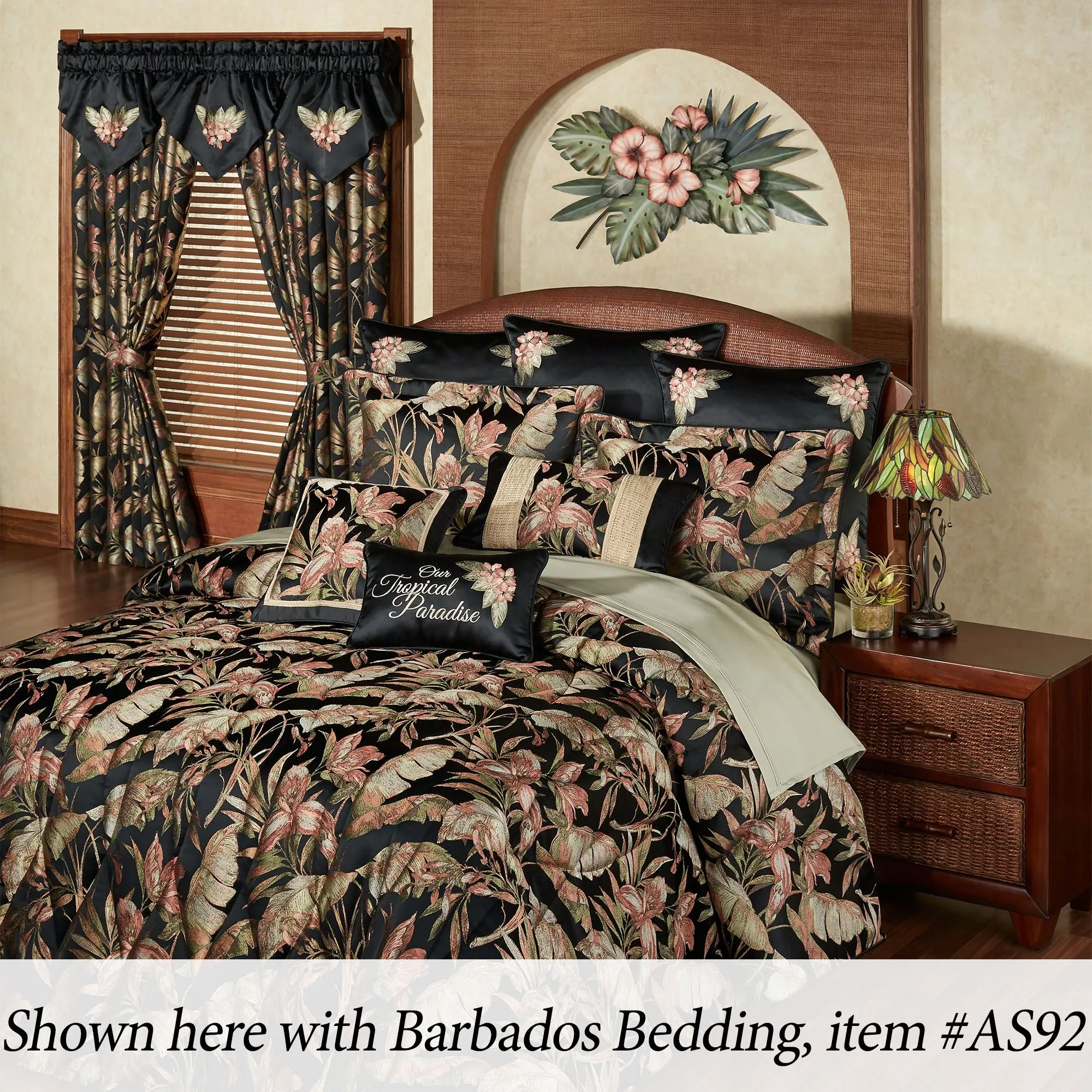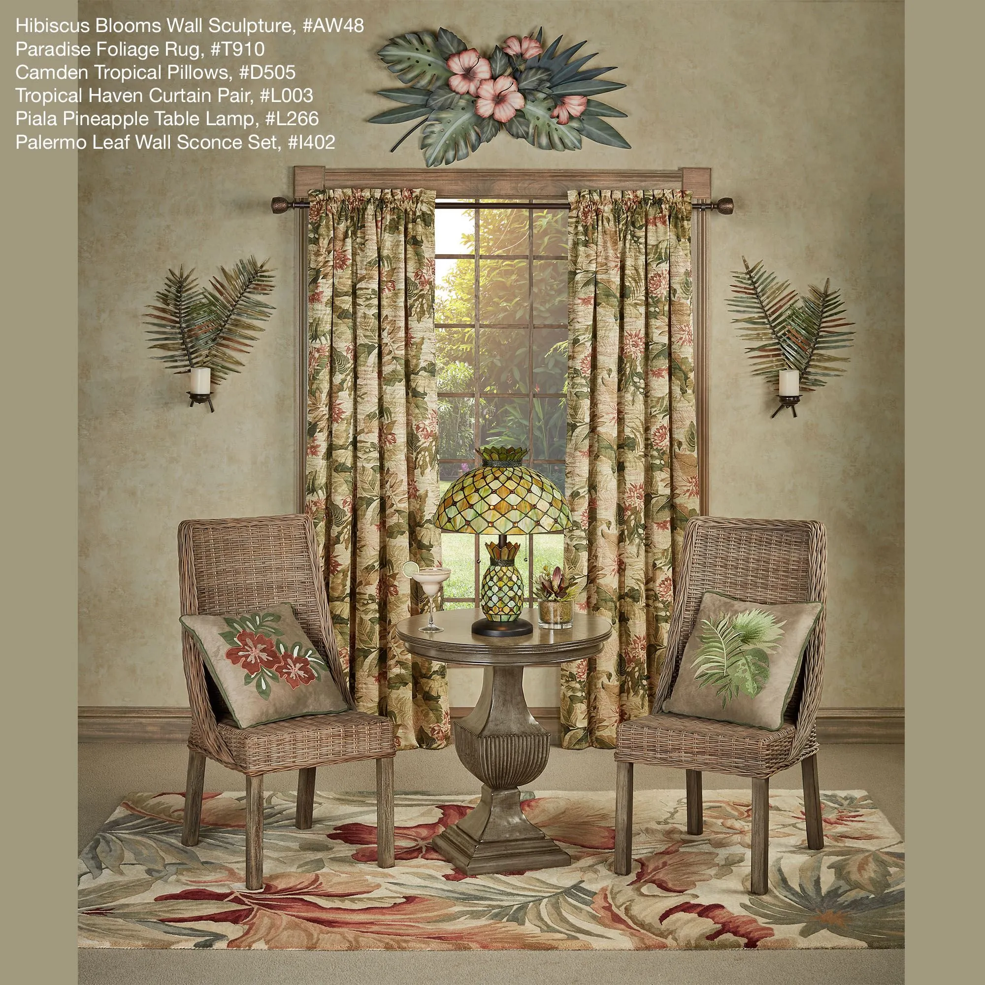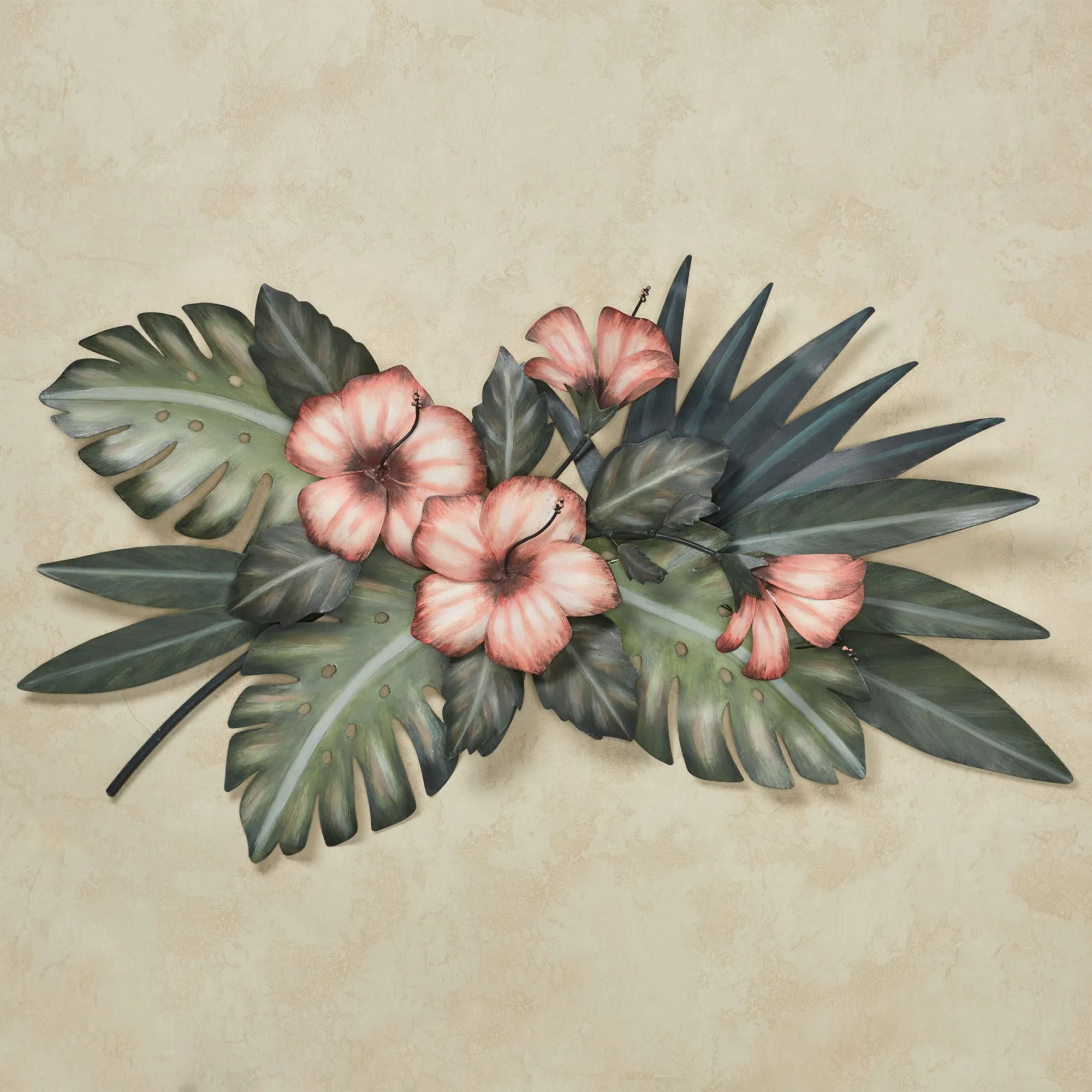 Hibiscus Blooms among the green tropical foliage, creating an alluring, exotic arrangement. Designed by artist Joanne Ferrara, the handcrafted metal wall sculpture features coral blossoms, monstera leaves, and palm fronds; all handpainted in lovely natural shades. Perfect for your indoor space, covered porch, or enclosed patio, the tropical wall sculpture measures 40"Wx4"Dx23"H.