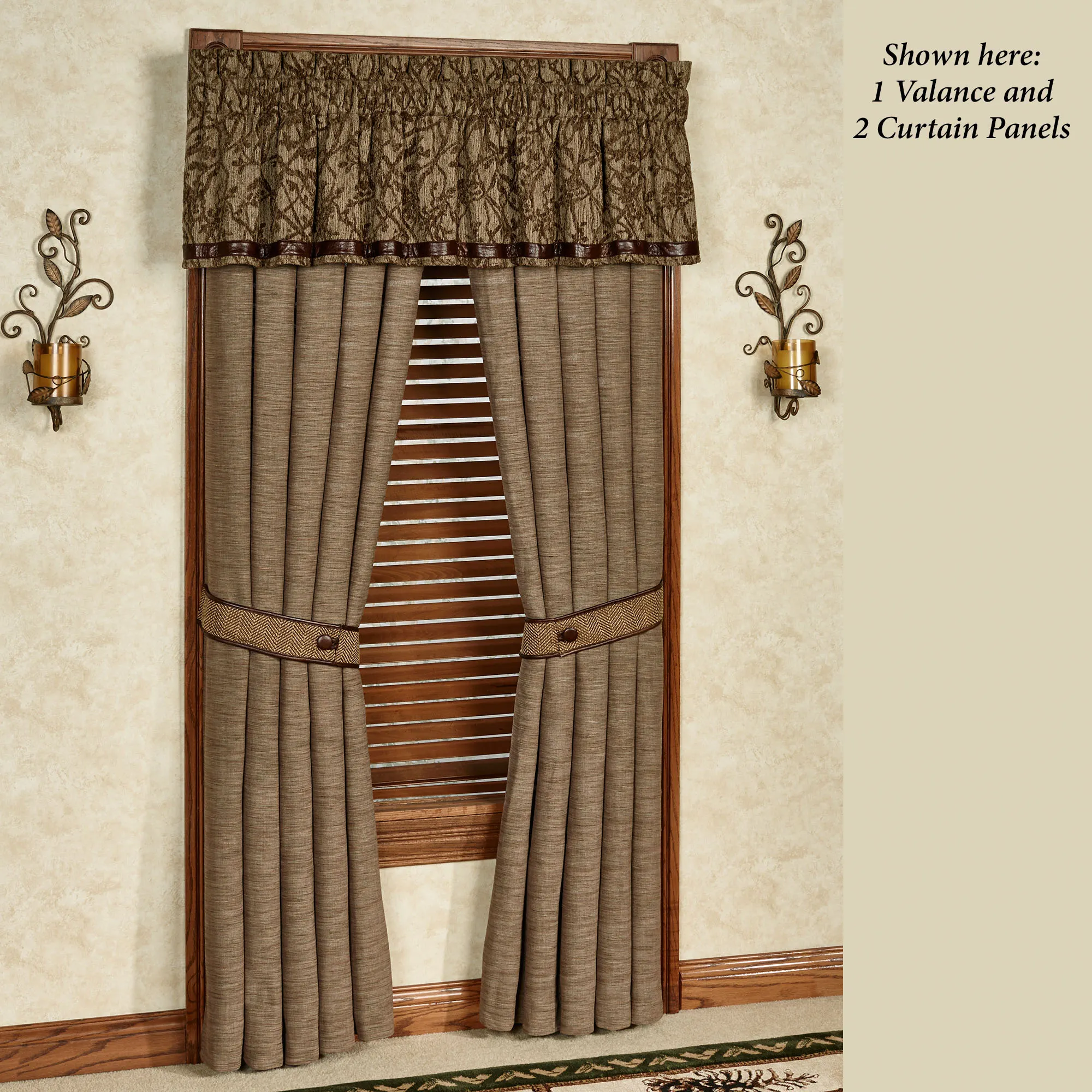 Tailored Window Treatment: Each Curtain Panel is woven slubbed sage and has a 3.5" rod pocket; tieback is included. Valance has the chenille leaf and branch design accented with faux leather at the bottom; rod pocket is 3".