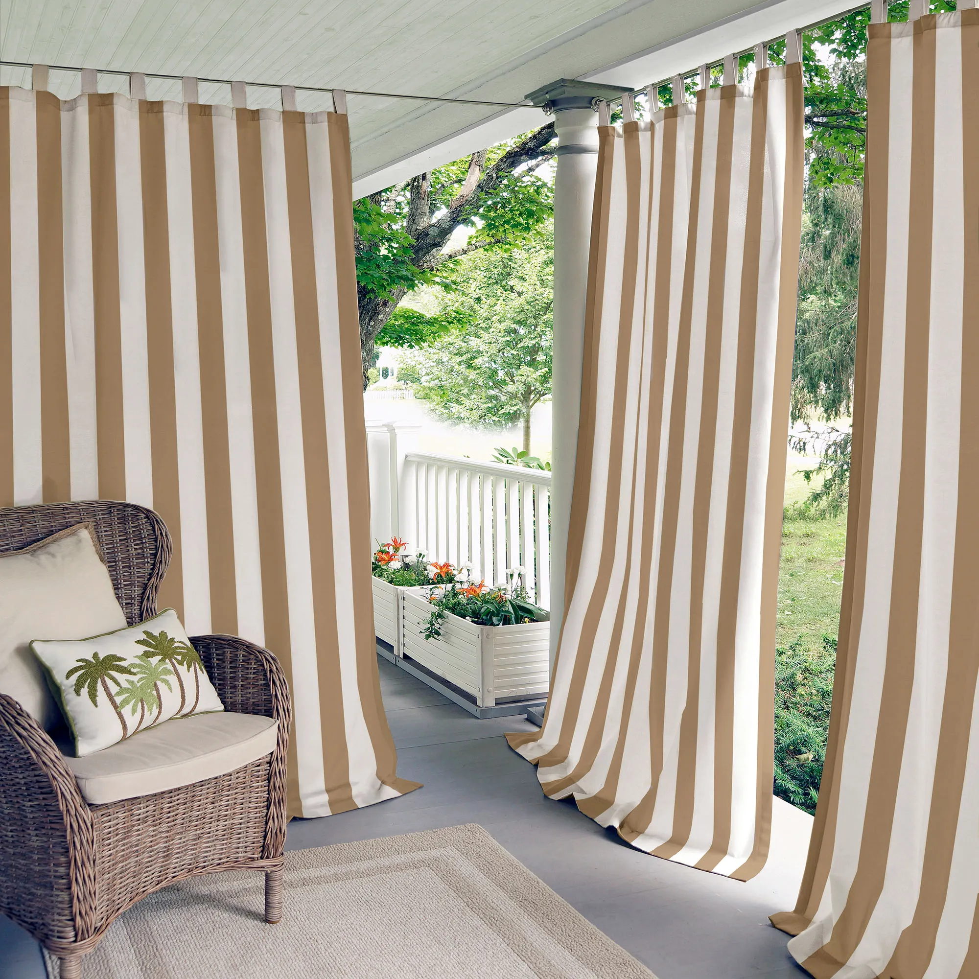 The Highland Stripe Light Brown Tab-Top Curtain Panel adds a classic look to your home or covered patio. Made of durable polyester, this indoor/outdoor accent has a light brown stripe pattern and is mildew-, fade-, and stain-resistant. Water-repellent panel has 50+ UV protection and 4.5"L tab tops with hook and loop closures. Backing is solid white. Panels are sold individually; each is 50"W. Washable. Imported.