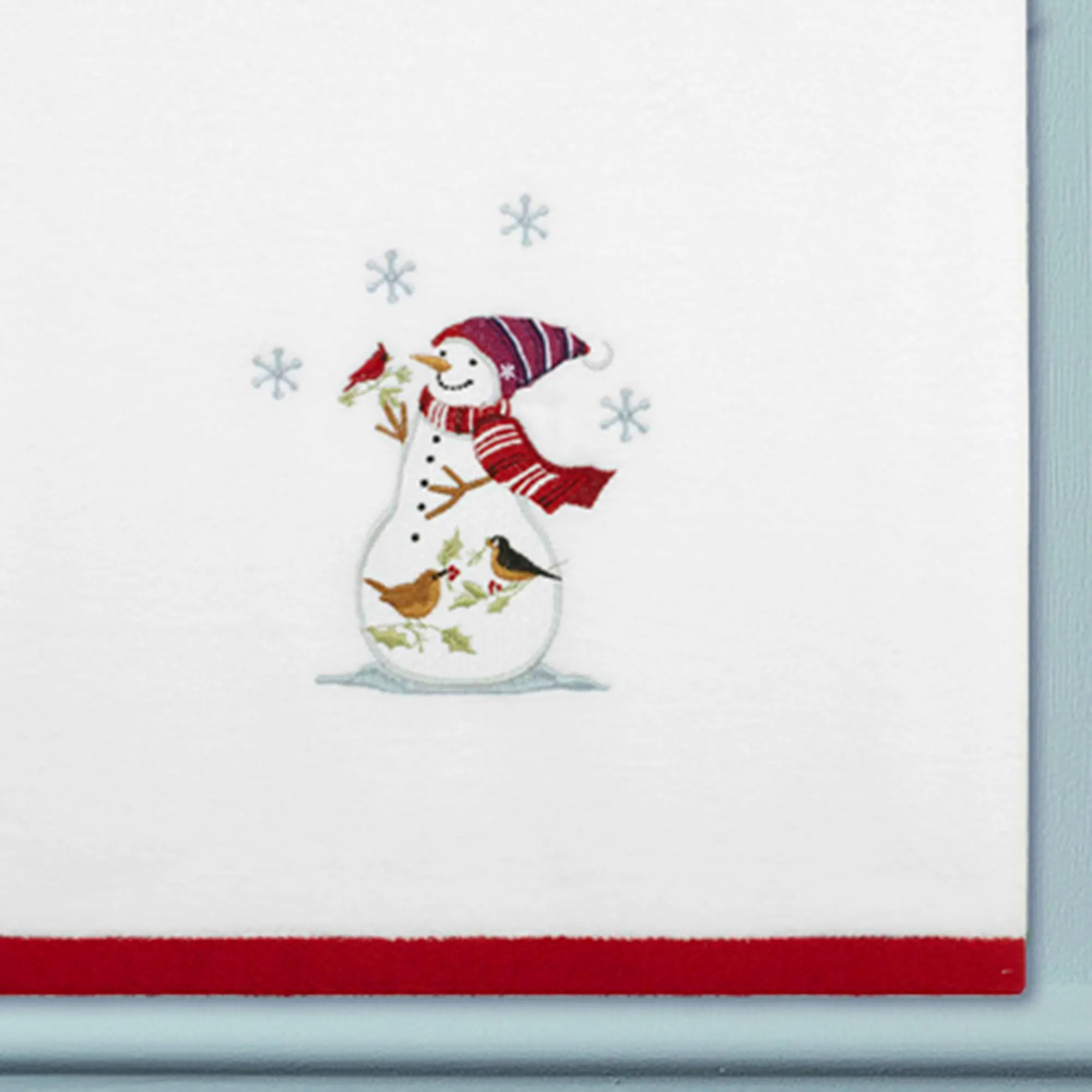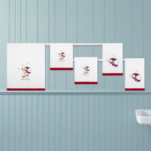 Decorate your daily routine with Holiday Cheer and festive whimsy. Complete with a red hem, these white cotton towels feature classic embroidered winter snowmen with red and black striped scarves and hats. Bath and hand towels have a snowman joined by a red cardinal, robin, and wren. Fingertip towels feature the smiling snowman head. The five-piece towel set includes one bath towel, 27"x50"; two hand towels, 16"x30" each; and two fingertip towels, 12"x18" each. Machine washable. Imported.