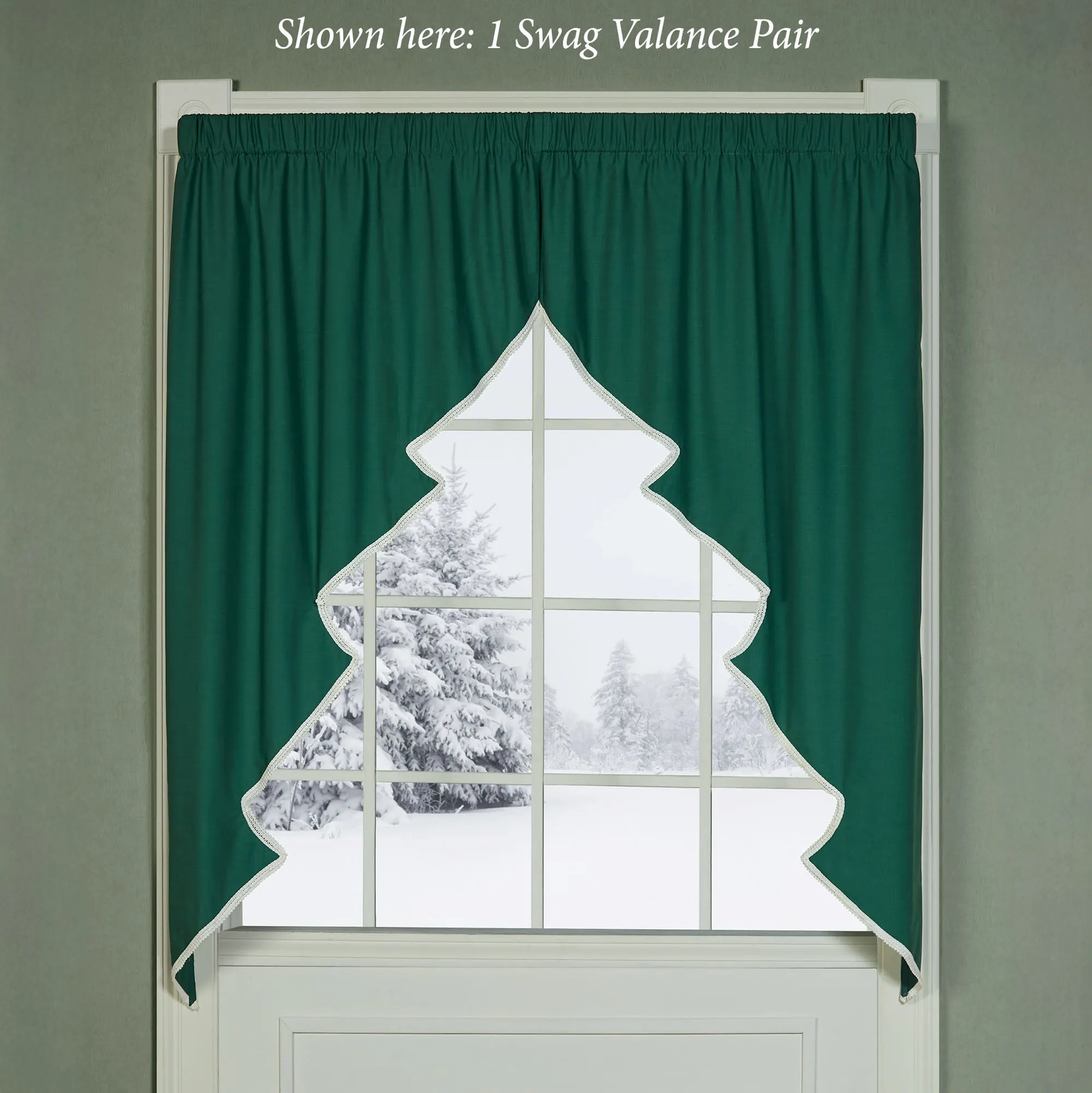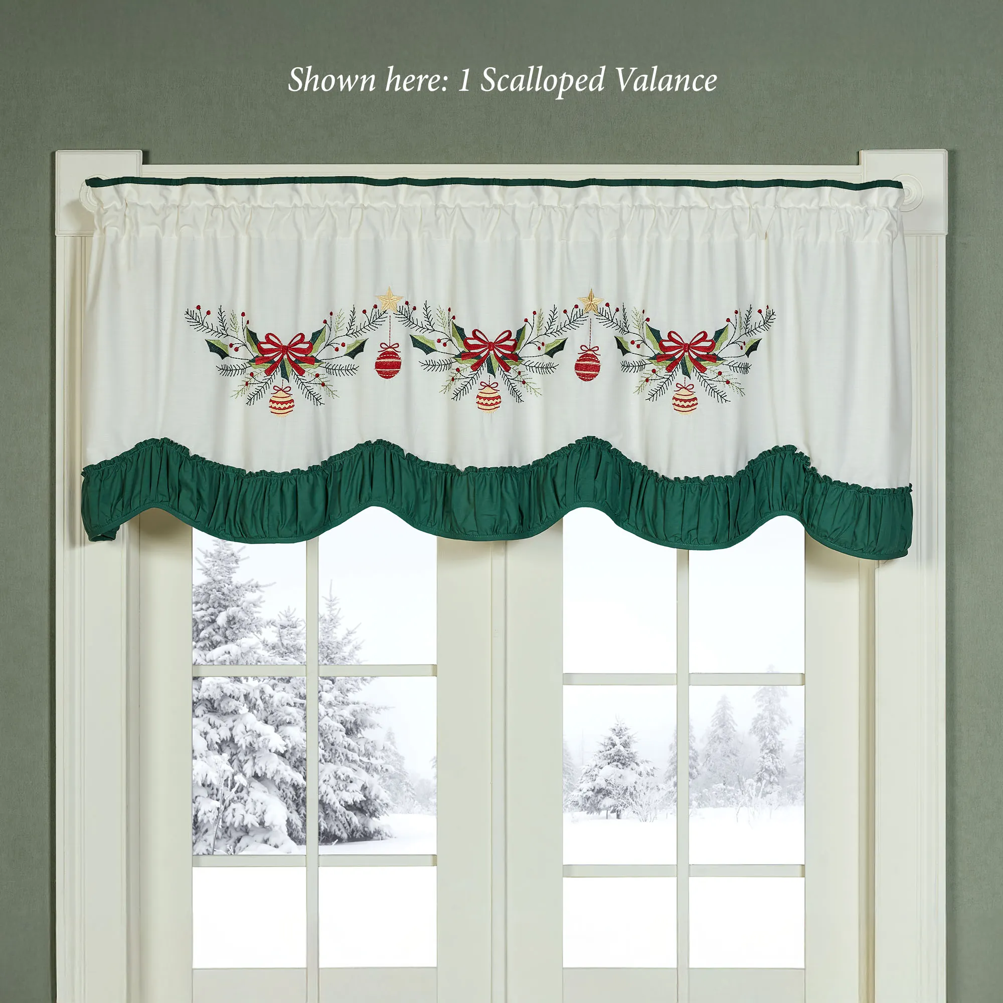 Lined Window Treatment has 3" rod pockets. The Scalloped Valance has embroidered ribbon and swag designs, green binding, and a shirred green bottom. The Swag Valance Pair is solid green with ivory pom-pom trim.