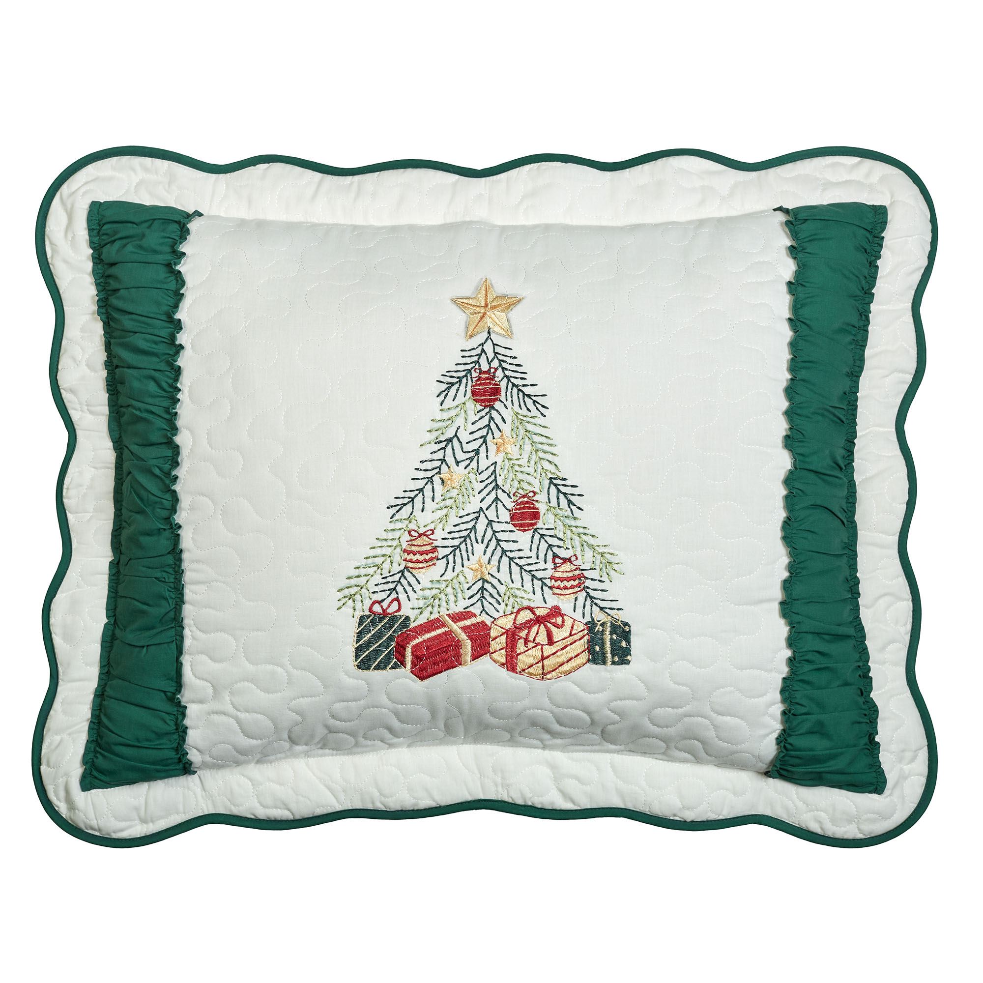 The scalloped, flanged Sham has an embroidered Christmas tree design, green shirred accents, vermicelli quilting, bound ends, and a French back closure. Choose Standard/Queen or King.
