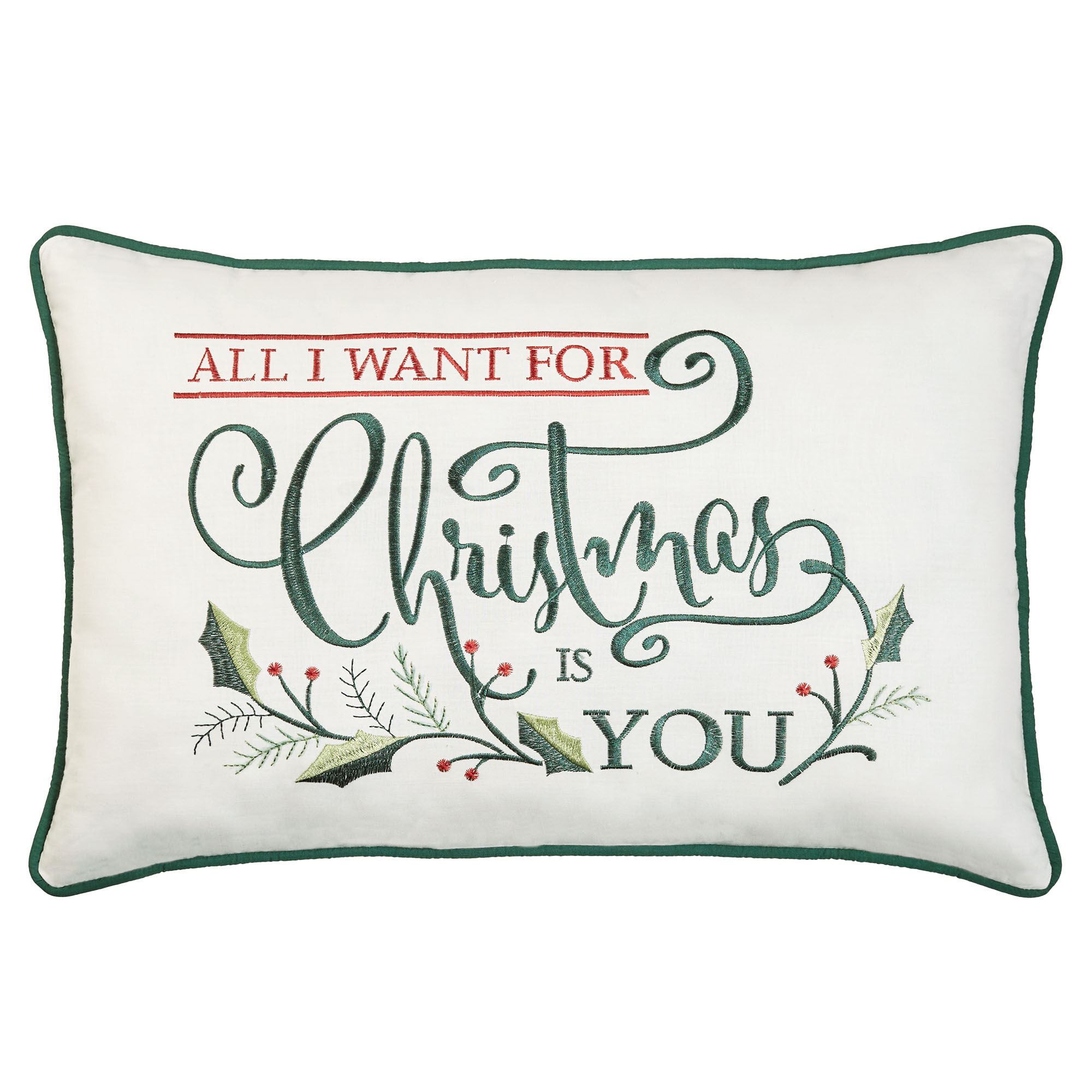 Pillows: Spot clean. The shaped Christmas Tree is green velvet with felt layers and jingle bell accents. The piped Rectangle has the embroidered words "All I Want For Christmas Is You," holly leaves, and berries on ivory.