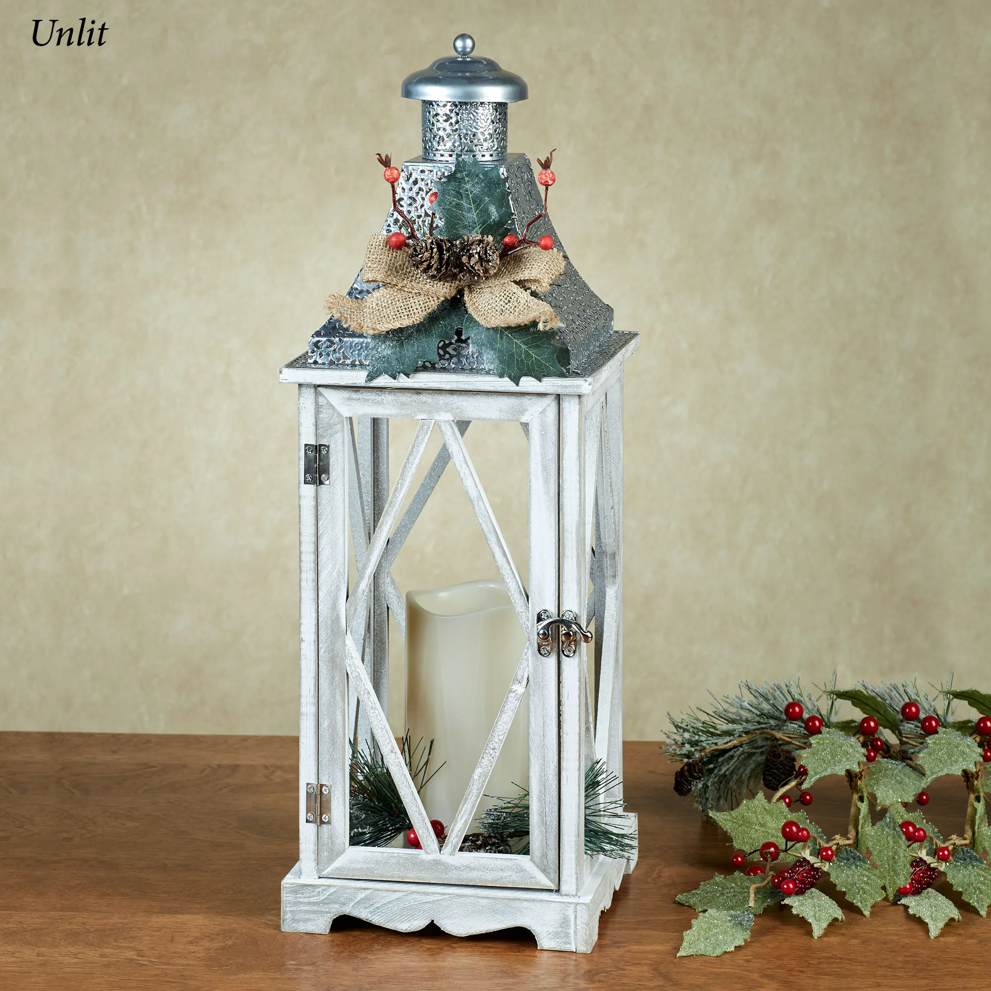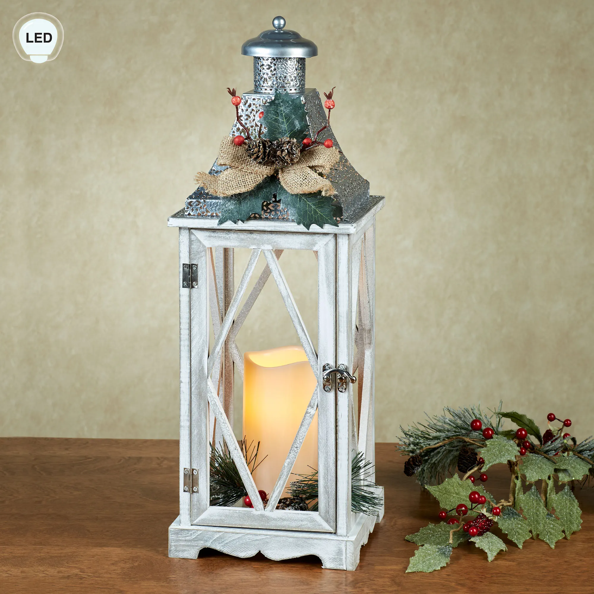 Charm your home with the Holiday LED Lantern. With a weathered white hue, the wood lantern features an openwork design topped with decoratively patterned silver metal, green holly leaves, a burlap bow, pine cones, and red berries. The lantern's center has an ivory resin LED flameless candle that emits a soft glow beside the faux pine bough and red berry ring. Requires three of your AAA batteries and operates via an on/off/six-hour timer switch on the lantern bottom. Indoor use only. With the ring down, the lantern measures 7"sq.x20.5"H overall.