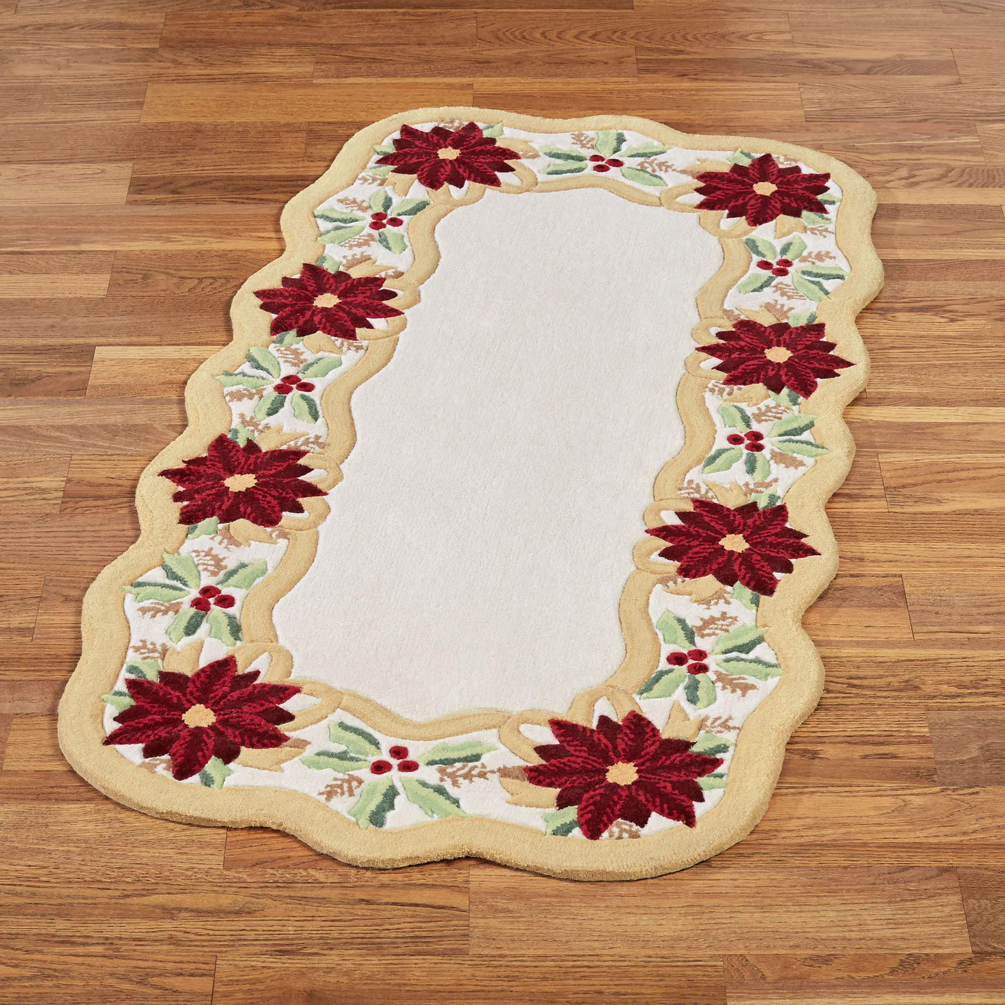Transform a room with the festive Holiday Poinsettia Rug Runner. Hand-tufted and handcarved, the .75" thick polyester rug features an ivory field bordered in a golden ribbon motif frame with light and dark sage holly, light and dark ruby poinsettias, and golden sprigs. Gold scalloped edges finish the design. Backing is cloth-covered latex. We recommend professional cleaning by a rug cleaner. Imported.