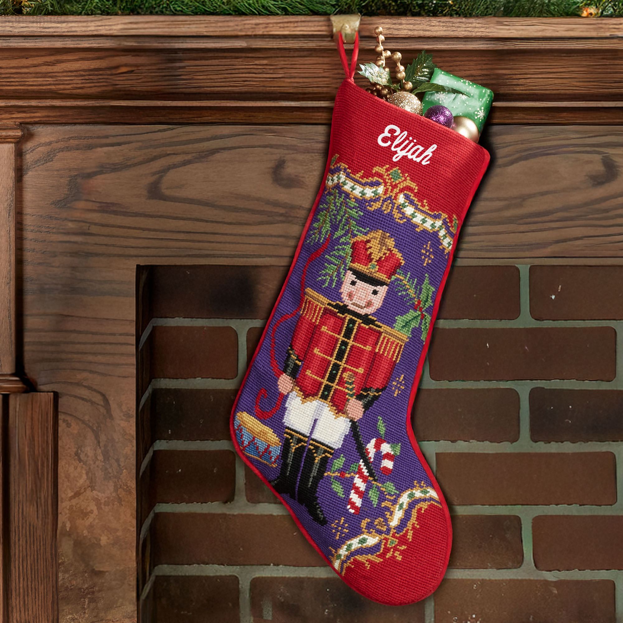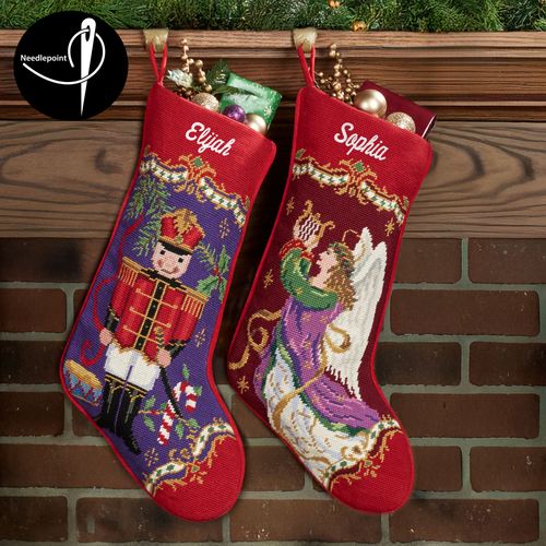 The Holiday Reflections Needlepoint Christmas Stockings spark joyously festive memories. Handmade from red cotton velvet and canvas, each stocking features a charming needlepoint wool design, traditional scroll accents, a starry background, piped edges, and a loop for hanging. Toy Soldier has a drum and candy cane. Angel plays a harp. Personalization is available, as shown, for FREE! Click on the burgundy "i" icon below the item name for more information. Stockings are sold individually; each measures 7.5"Wx17"L. Dry clean only. Imported.