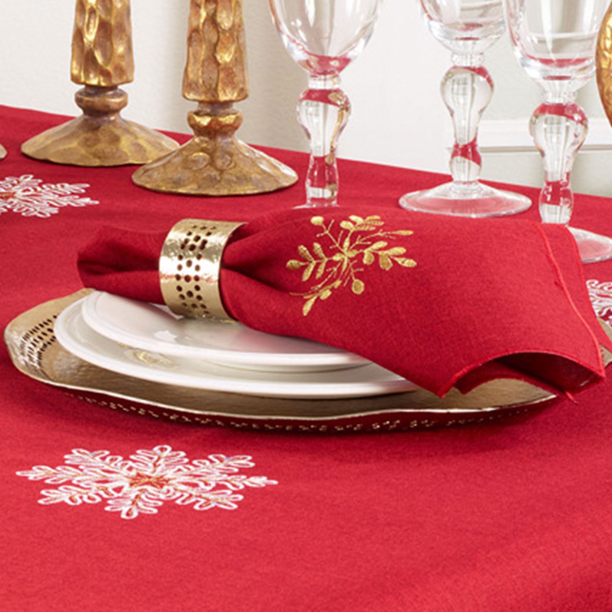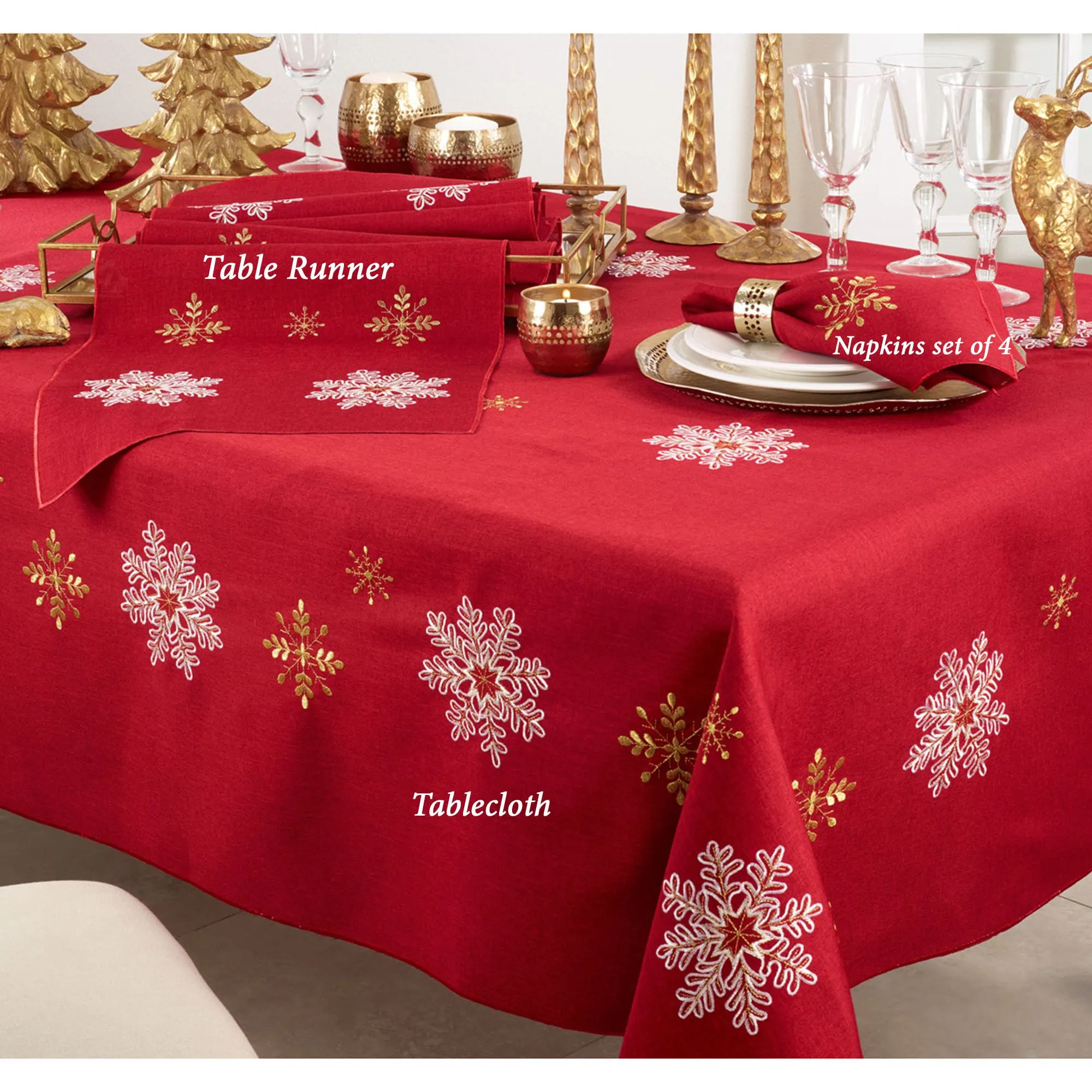 The enchanting Holiday Snowflakes Table Linens turn any dining area into a winter wonderland. These polyester table linens have gold and white snowflake embroidery on red. Choose Oblong Tablecloth, Table Runner, or Napkin Set of 4. Oblong Tablecloth is 70"W. Table Runner is 16"W. Napkins are 20" sq. Machine wash. Imported.