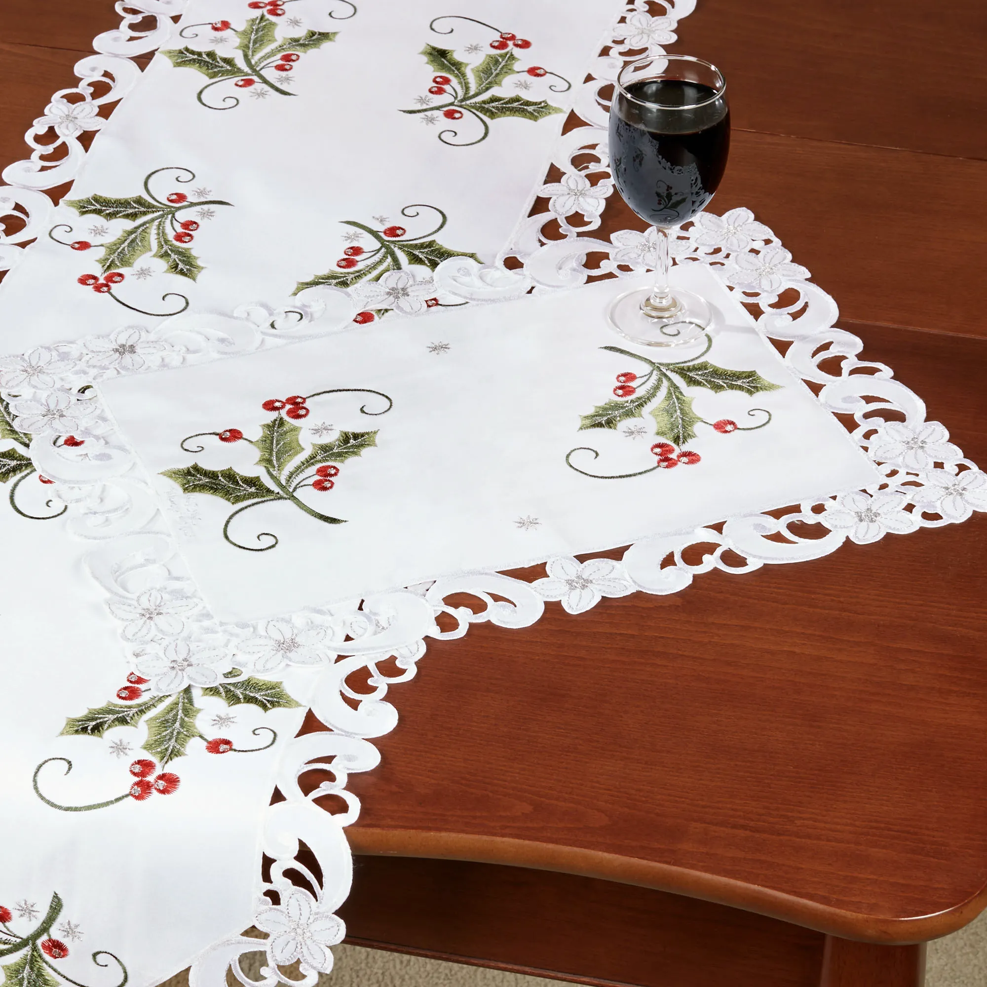 Holly and Lace are the perfect combination for an extravagant holiday display. This polyester placemat set features embroidered holly leaves and berries on white and open cutwork motifs beautifully cut by hand. Accent colors include red, green, and silver. Placemats are each approx. 20"x14"; sold as a four-piece set. Machine wash. Imported. Sorry, the table runner is no longer available.