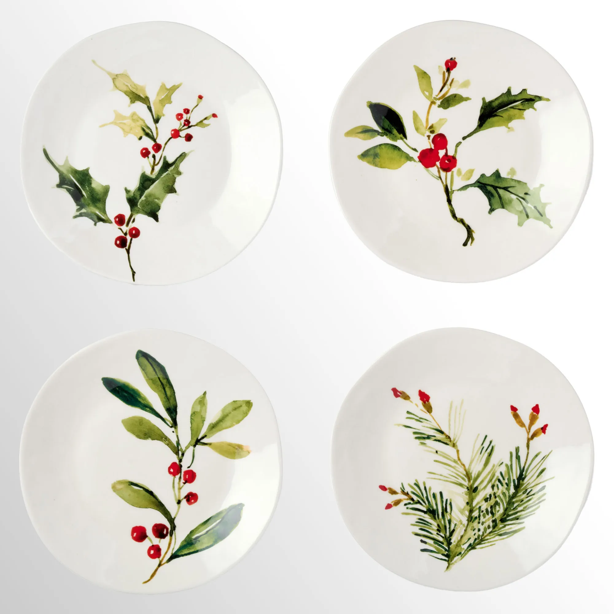 Holly and Vines Ceramic Christmas Holiday Dessert Plate Set of 4
