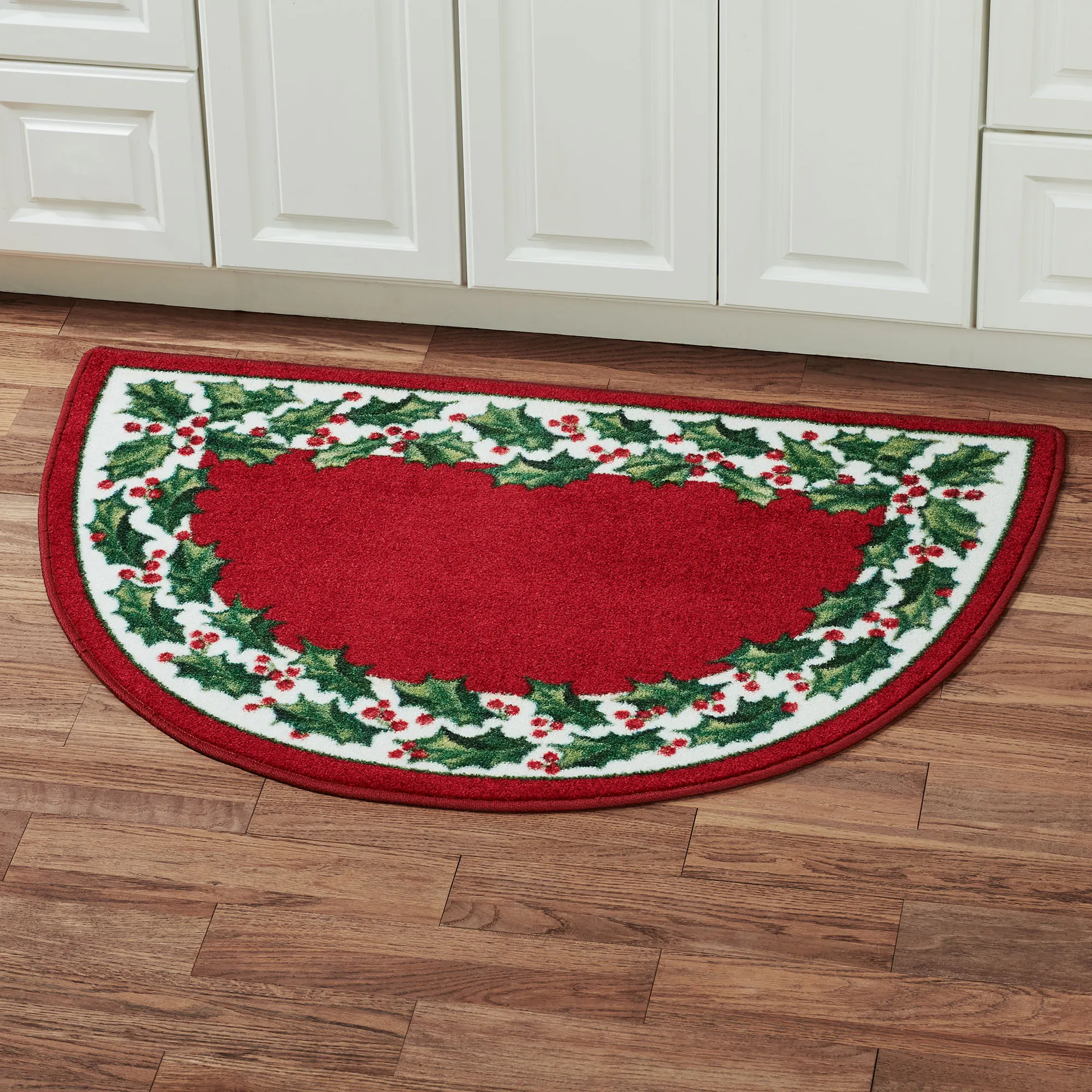 Deck your floor with holly leaves, red berries, and a solid red center with the Holly Berry Slice Rug. This power-loomed nylon Christmas slice area rug, .375" thick, features printed motifs along with a green and red border. The holiday slice rug measures 46"x32" (3'10"x2'8"). We recommend professional cleaning by a rug cleaner.