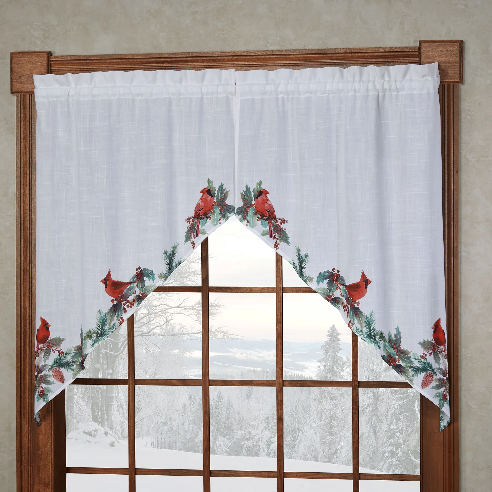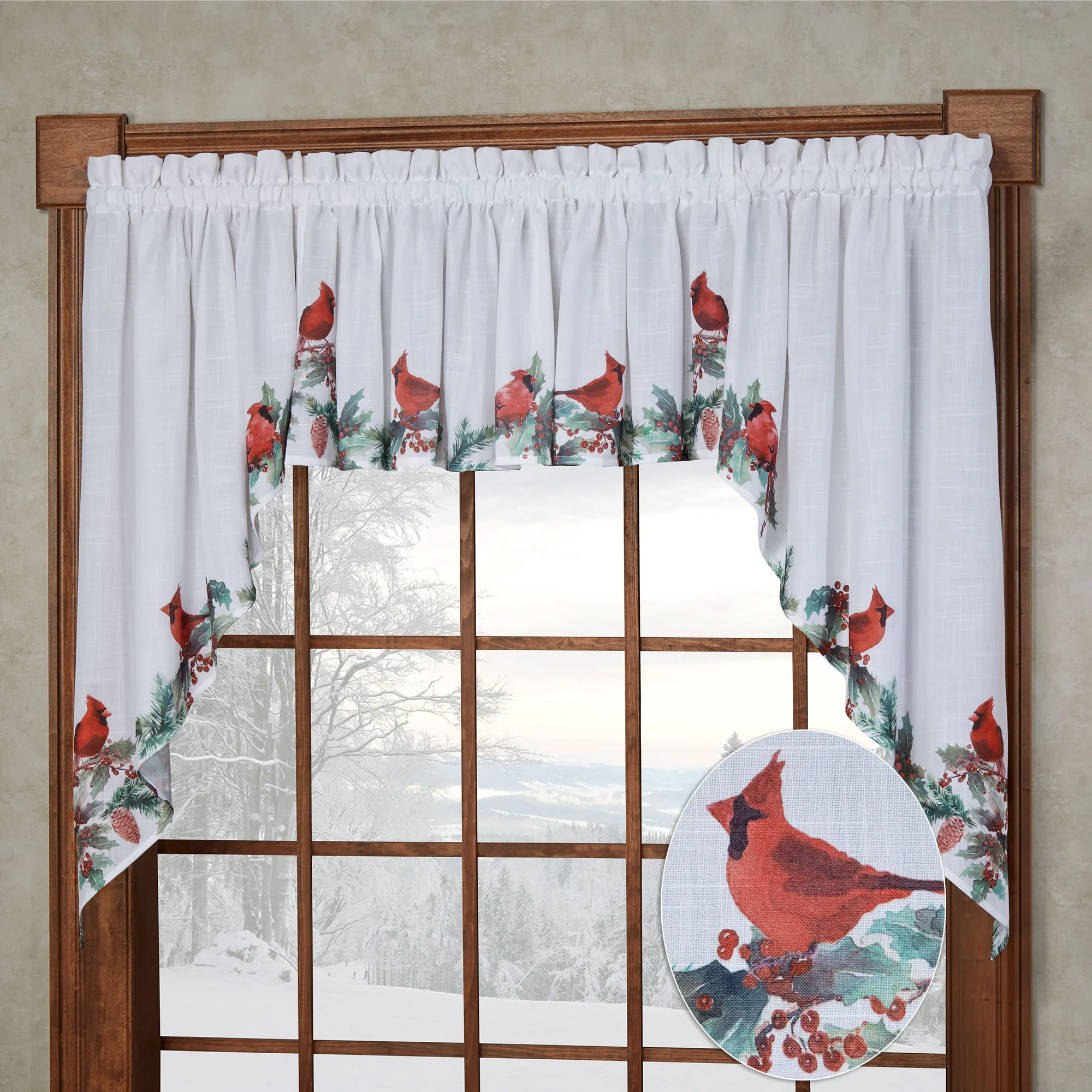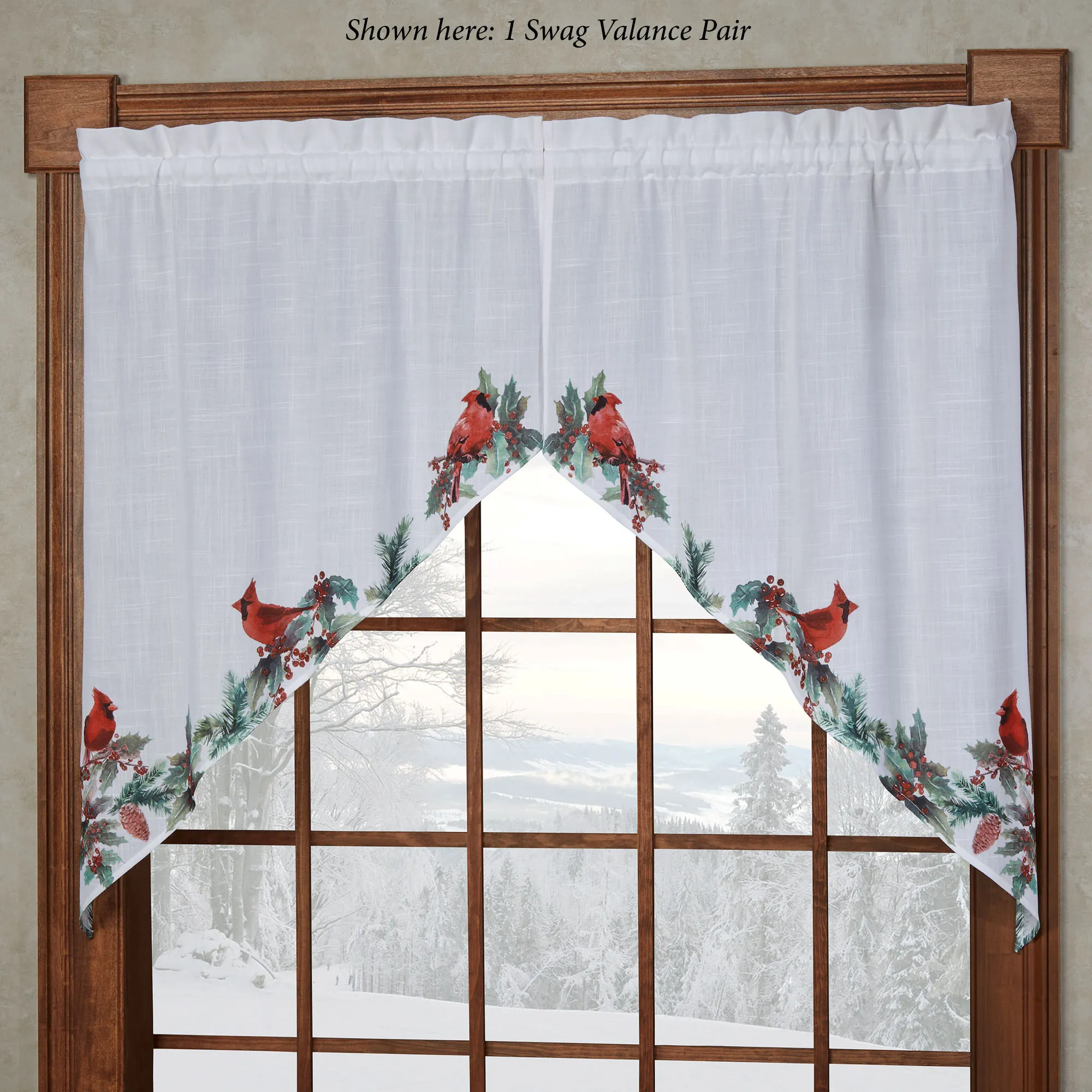 The Holly Cardinals will happily take sanctuary inside your home versus the winter wonderland outside your window. In a printed watercolor style, red cardinals perch among the green holly, red berries, and pine cones along the tailored bottom edges of these white woven polyester window treatments. Swag Valance Pair is 58"Wx38"L. Tailored Valance is 58"Wx14"L. Rod pocket is 1.5". Machine washable. Imported.