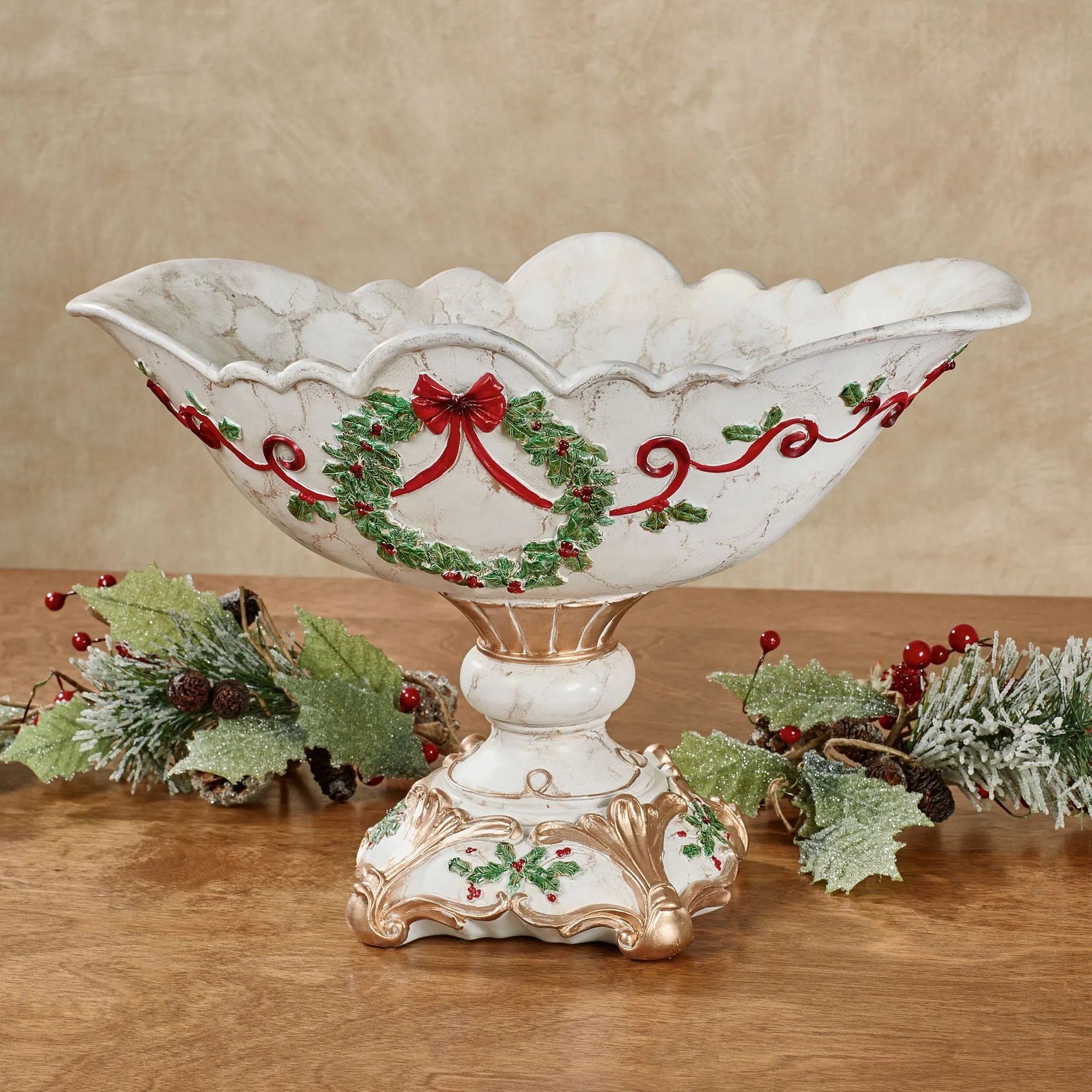 Wreath designs and gold swirl and leaf motifs make this centerpiece bowl a Holly Delight in your holiday display. Made of smooth resin, this ivory accent has subtle gold marble-like detailing, green holly leaves, and red berries and ribbons. Edges are scalloped. For decorative use only. Holiday centerpiece bowl measures 14"Wx9"Dx9.5"H.