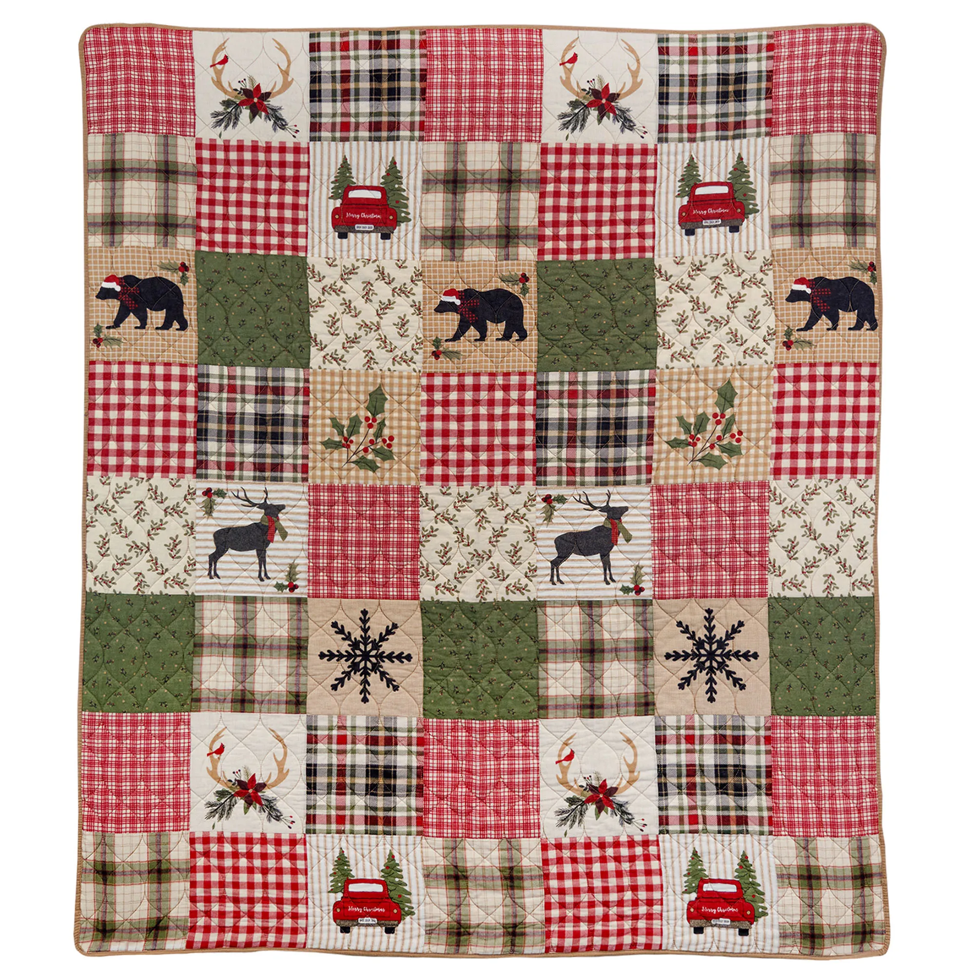 Holiday icons and nature-inspired designs create the rustic look of the Holly Forest Bedding from Your Lifestyle(R) by Donna Sharp(R). The Mini Quilt Set includes a quilt and sham(s). This pre-washed and preshrunk cotton bedding features patchwork-like prints featuring deer, bear, antlers, poinsettia flowers, plaid designs, trucks with trees, and snowflakes. Colors include shades of sage, red, ivory, black, white, and tan. The lightweight quilt has wavy quilting and a solid tan backing with wavy quilting. Quilt fill is cotton/polyester. Machine washable. Imported.