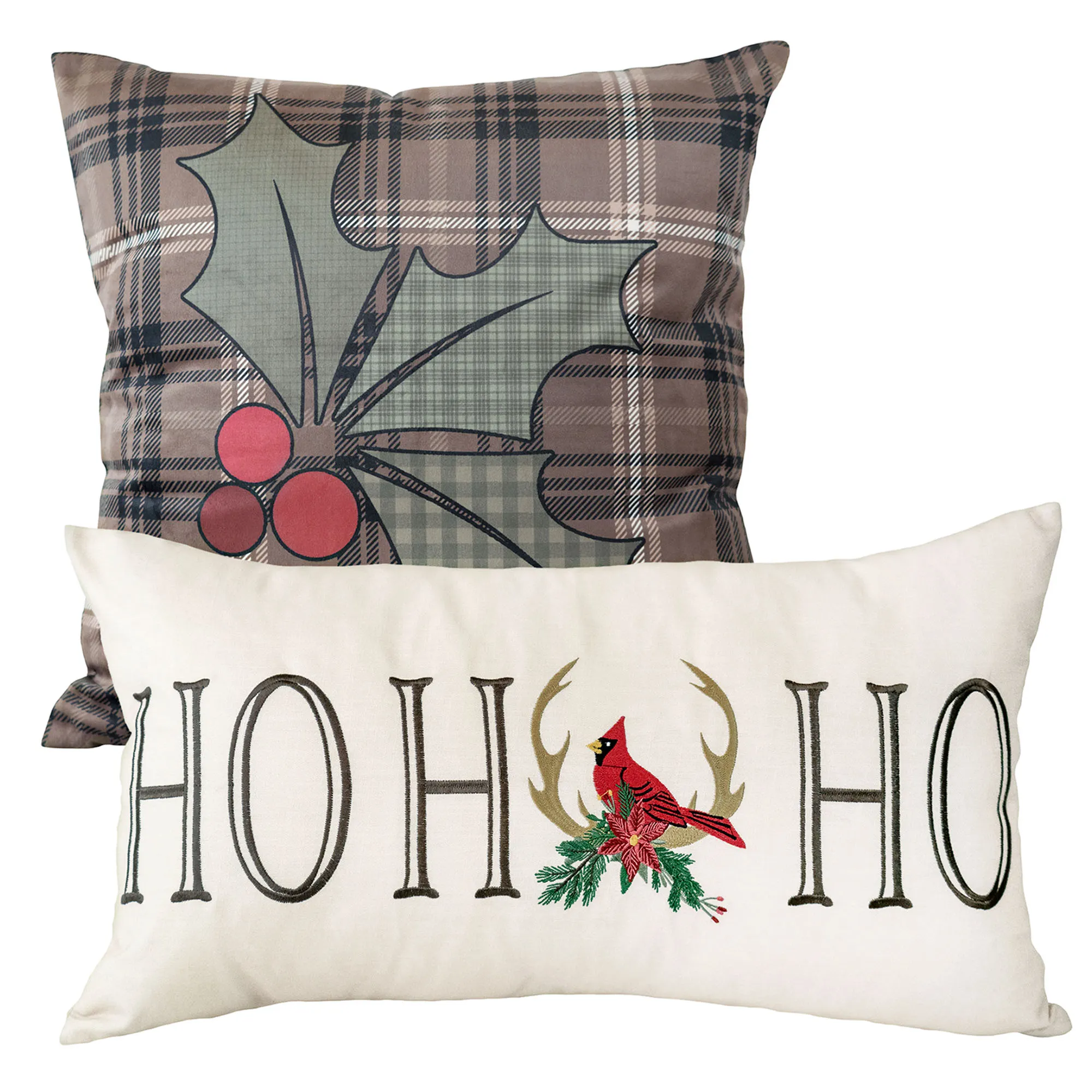 The polyester Pillow Set of Two includes one square pillow and one rectangle pillow. The tailored square pillow has a holly leaf and berry print on plaid. The rectangle pillow has embroidery with the words "Ho Ho Ho" along with antlers, a poinsettia flower, and a cardinal on an ivory background. Pillow fill is polyester. Spot clean.