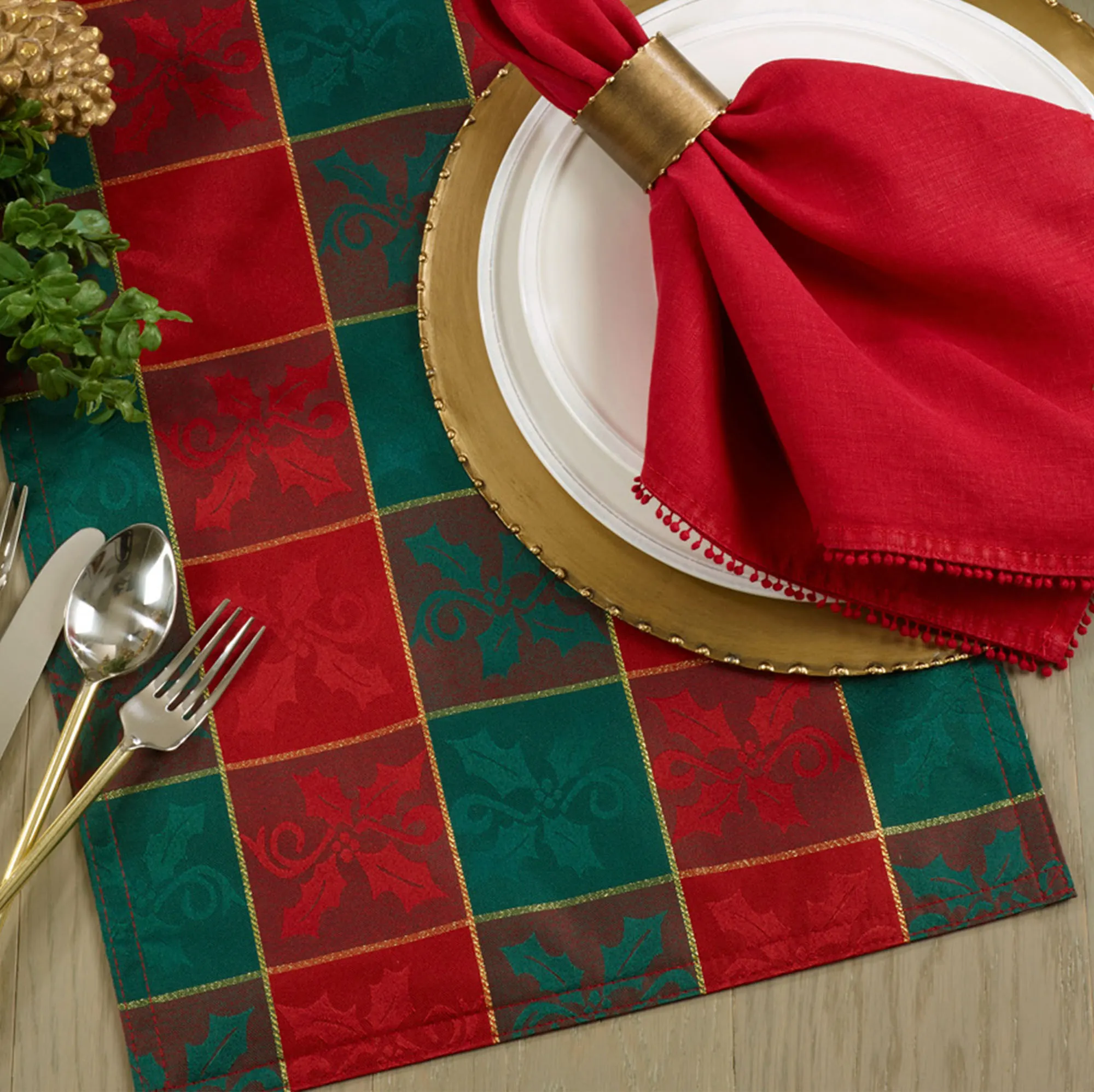The Holly Plaid Holiday Table Linens are polyester. Imported.