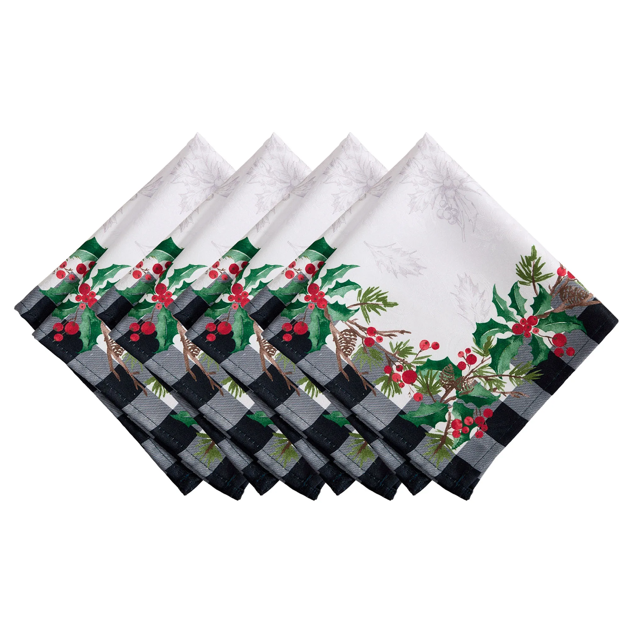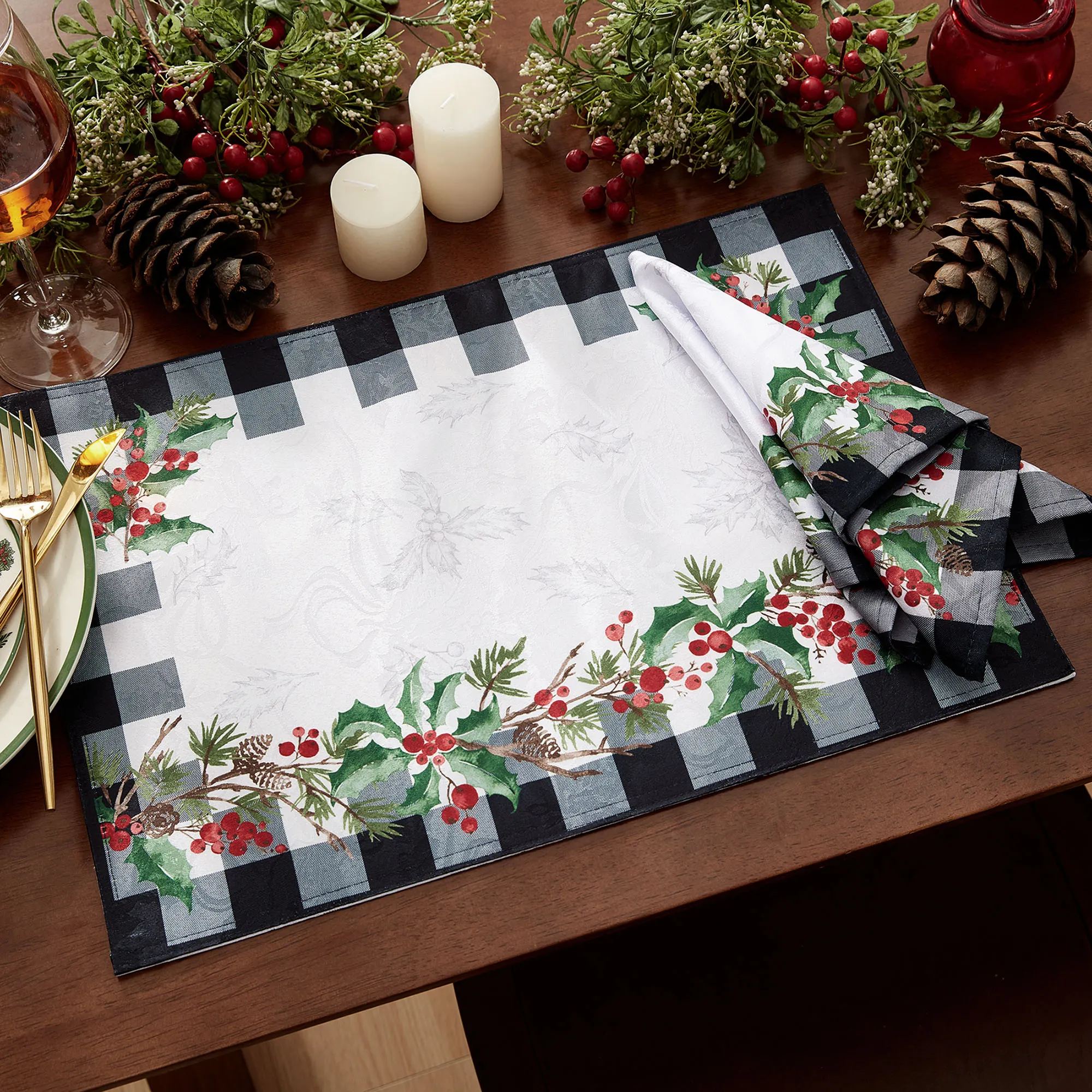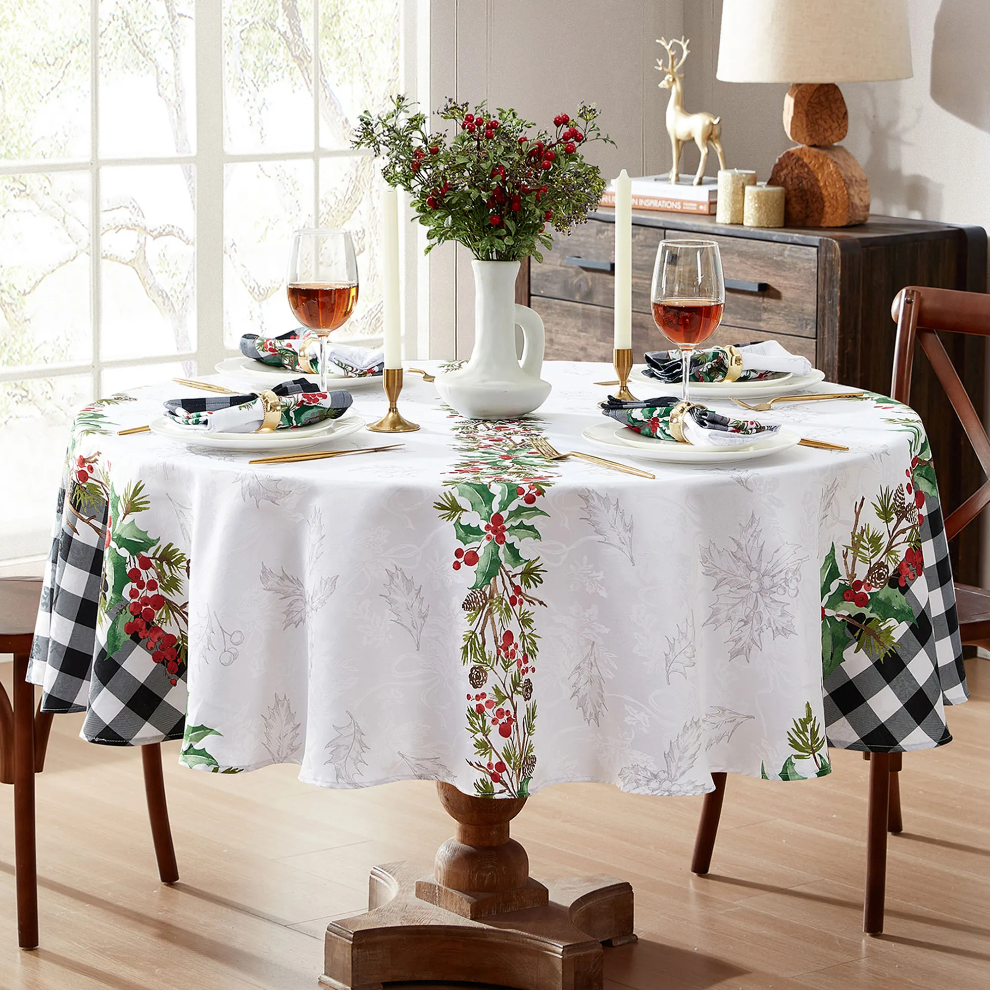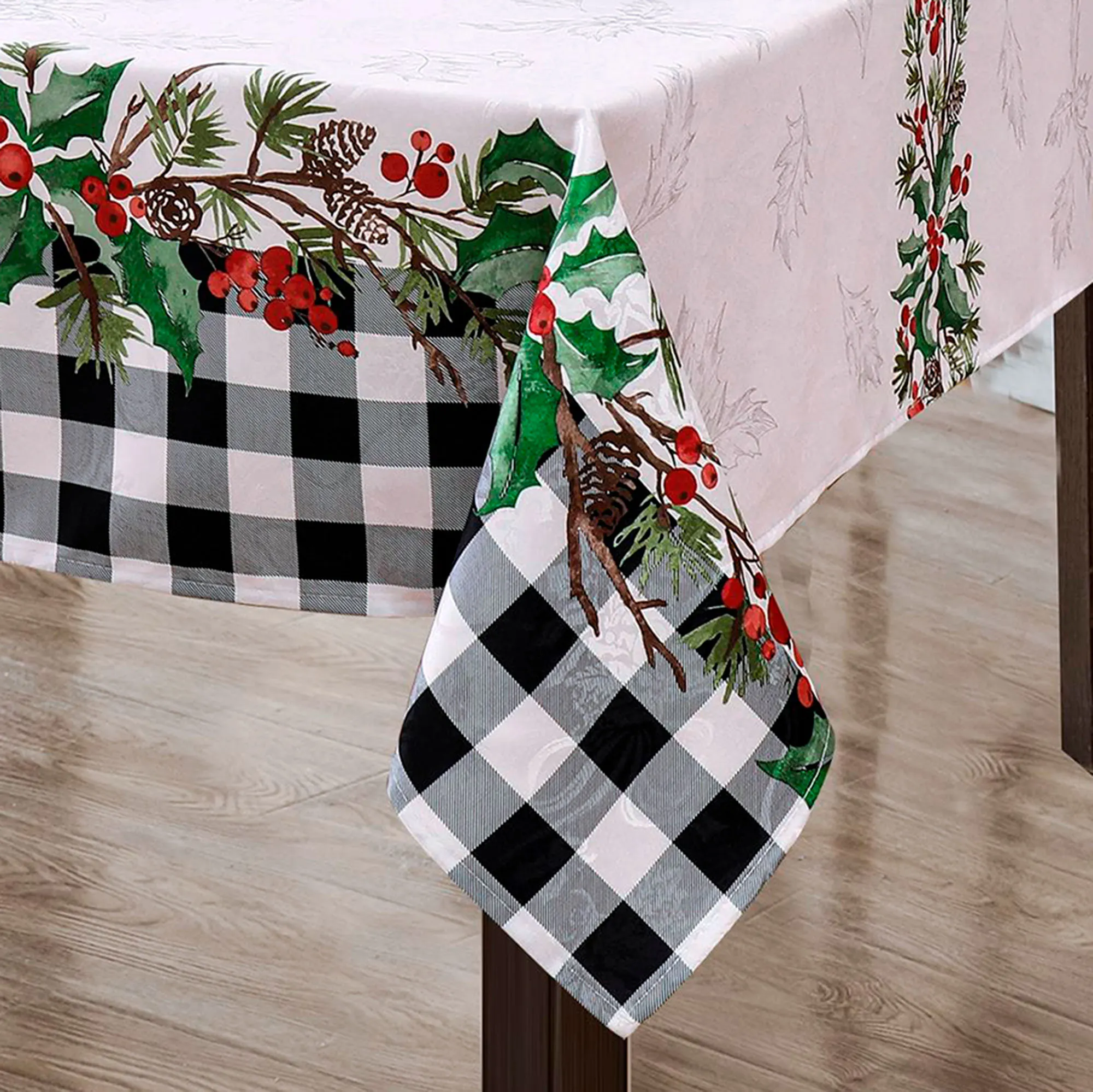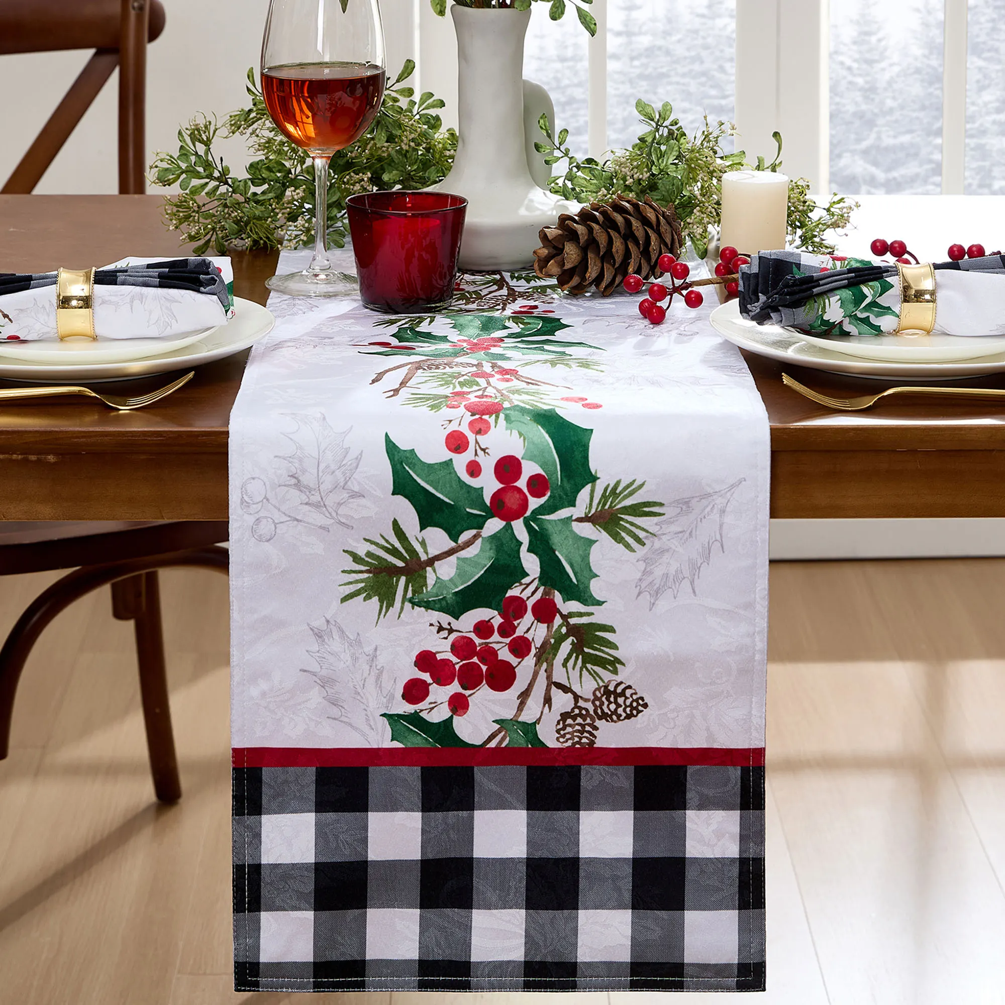 Foliage from the Holly Ridge completes your tablescape with classic winter beauty. In a printed design, each tailored white polyester table linen features black and white buffalo plaid frames and garland designs filled with pine boughs, green holly leaves, and red berries. Tone-on-tone holly and ribbon motifs decorate the white ground. Tablecloths also have a center band of greenery. Table Runner features a red accent band at each plaid end. Choose Rectangle Tablecloth, Round Tablecloth, Table Runner, Placemat Set of 4, or Napkin Set of 4. Machine washable. Imported.