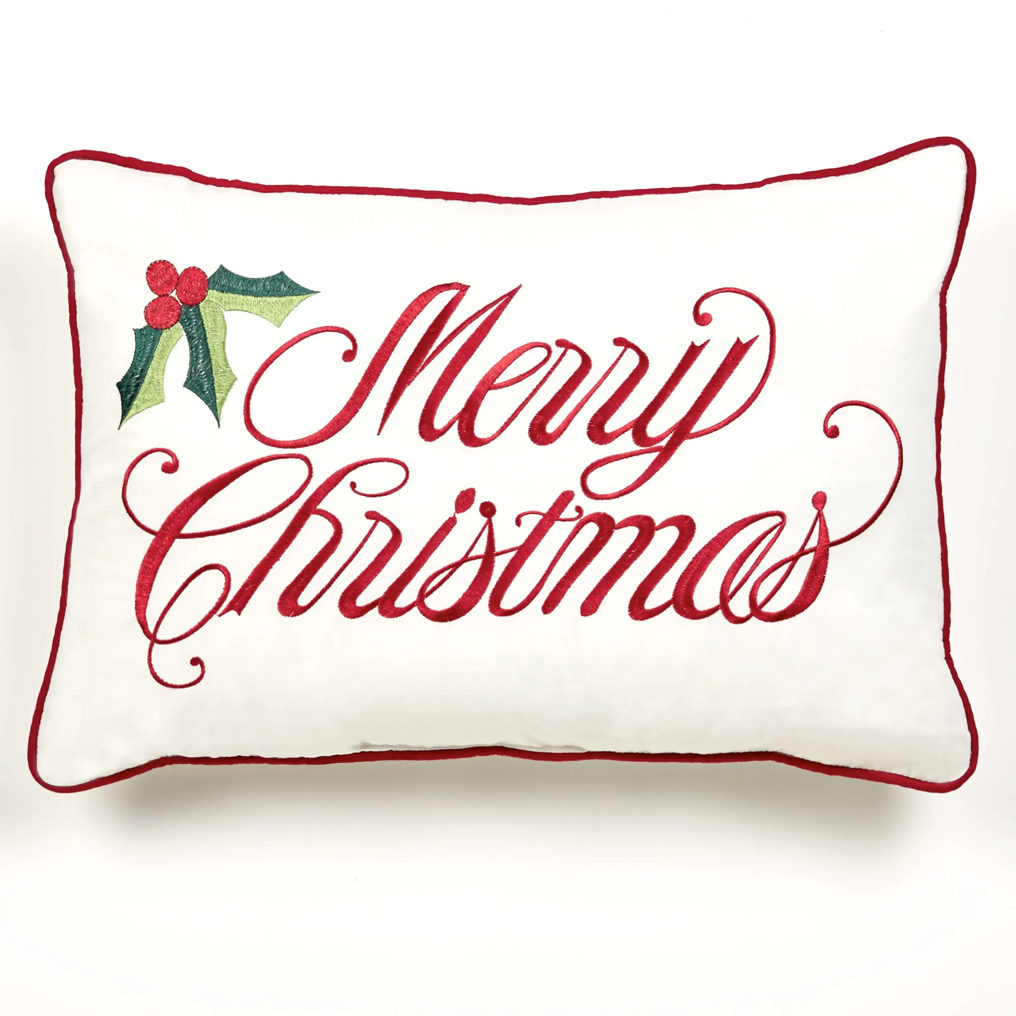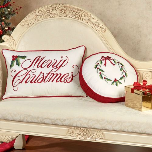 Make any area of the home look fabulously festive with the Holly Wreath Holiday Decorative Pillows. Piped, cotton/polyester pillows feature embroidered accents in red and green. Rectangle Pillow, 14"x20", has "Merry Christmas" and holly leaves/berries embroidered on ivory. Round Pillow, 14", has an embroidered wreath with bow on ivory and 2" red shirred side gusset. Fill is polyester. Spot clean. Imported.