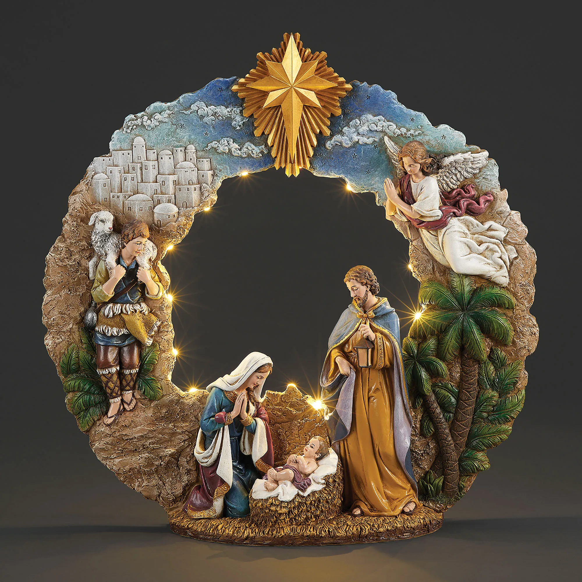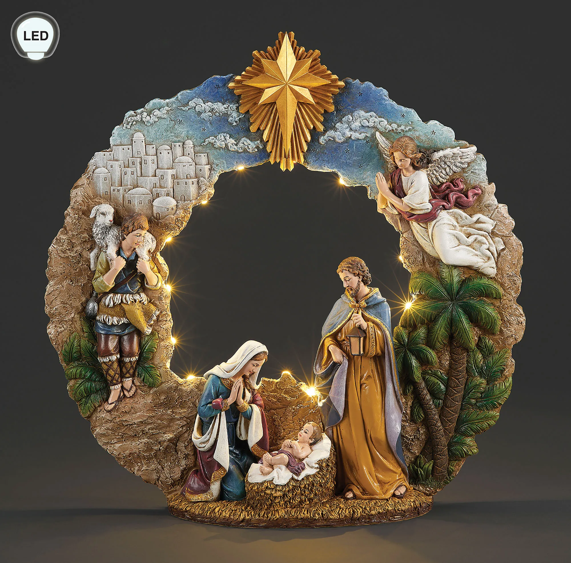 The Holy Family Lighted Sculpture, from Joseph's Studio(R), exclusively by Roman, Inc., displays the sentiment of the season. Made of resin, this religious table sculpture resembles a wreath and features baby Jesus, Mary, Joseph, an angel, and a shepherd with his sheep. The Christmas sculpture also has the town of Bethlehem and palm trees in the background, along with a gold star accent on the top. Colors include shades of blue, brown, green, gold, purple, and ivory. The interior of the circle is lit with LED lights. Requires two AA batteries, not included; the on/off switch is located on the bottom. Measures 17.5"Wx4"Dx17"H.