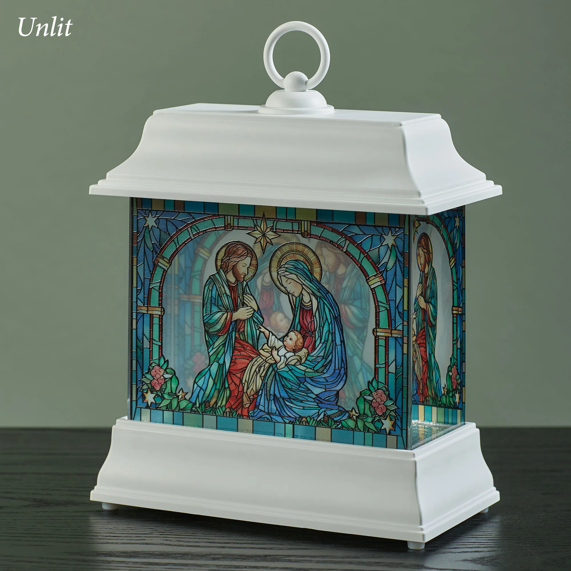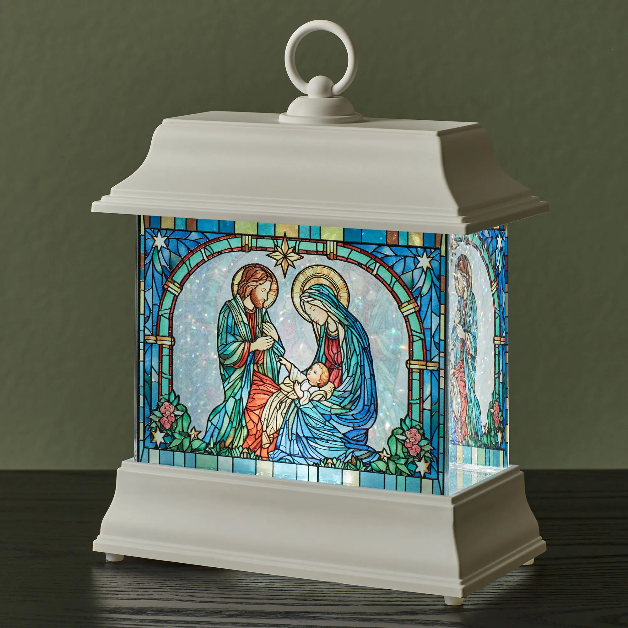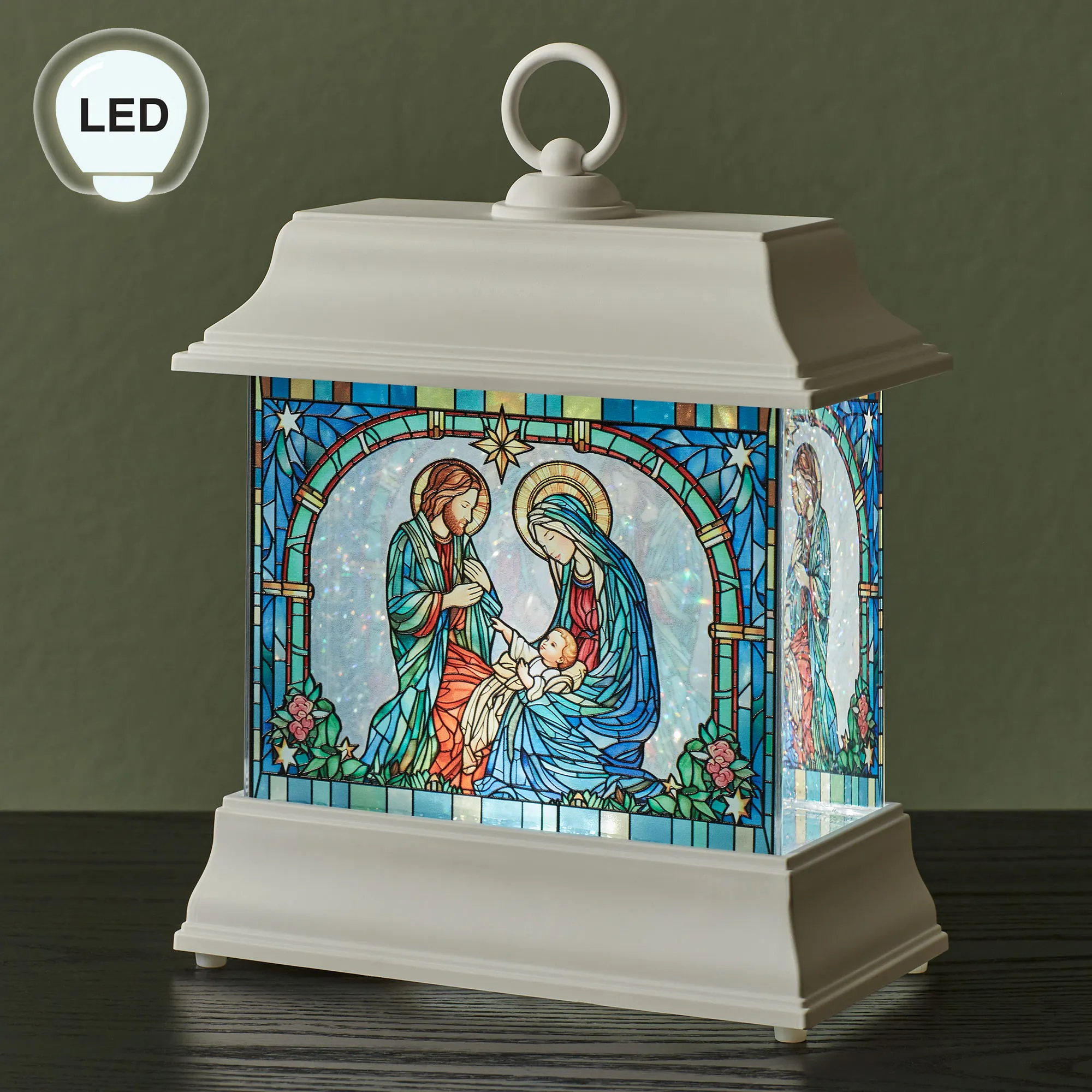 Holy Family Faux Stained Glass Swirl LED Lighted Lantern Glitter Globe