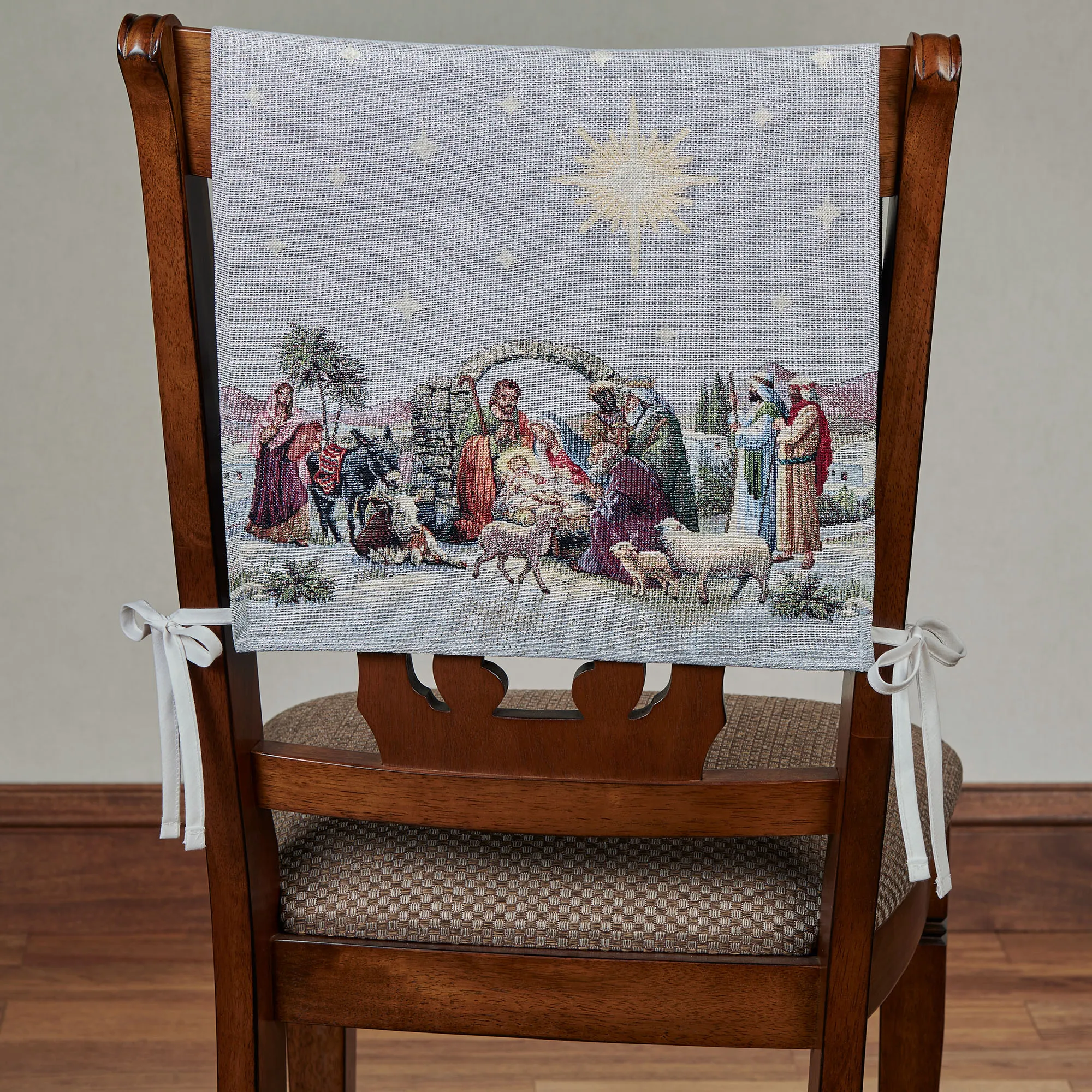 The Holy Night Religious Christmas Chair Cover Set is a joyous sight. Accented with shimmering silver lurex threads, each tapestry-woven, polyester-blend chair cover features a detailed nativity scene filled with people, animals, and scenery beneath a platinum sky dotted with stars. Each dual-sided chair cover measures 15"Wx15"L, with 13"L ties when styled on a chair; sold as a set of two. Machine washable. Made in Spain.