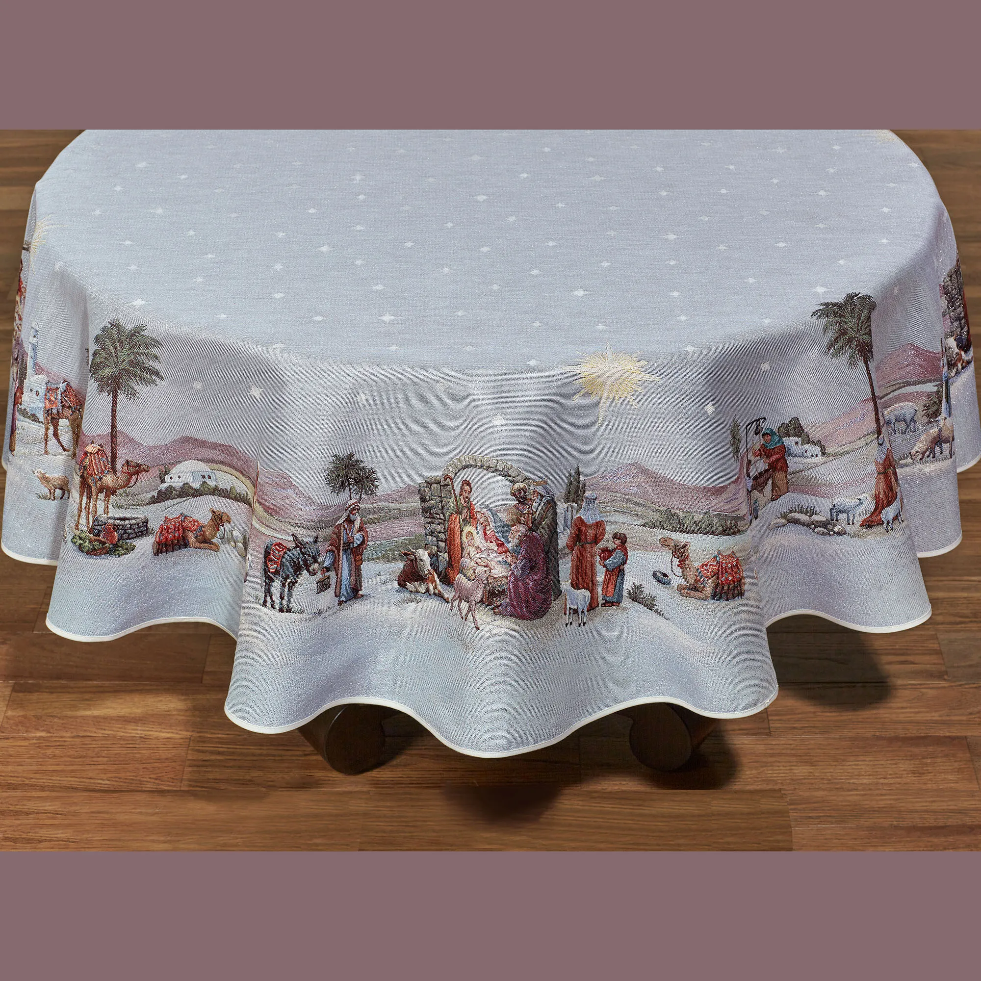 The Holy Night Religious Christmas Woven Table Linens are a joyous sight. Accented with shimmering silver lurex thread, each tapestry-woven polyester-blend design features a detailed nativity scene filled with people, animals, and scenery beneath a platinum sky dotted with stars. Specify Oblong Tablecloth, Round Tablecloth, Table Runner, or Placemat Set of 4. Tablecloth has a continuous border design. Oblong Tablecloth is 63"W. Round Tablecloth is 65" dia. Table Runner has a scene at each end; measures 15"x70". Placemats are 20"x15" each; sold as a 4-piece set. Machine washable. Made in Spain.