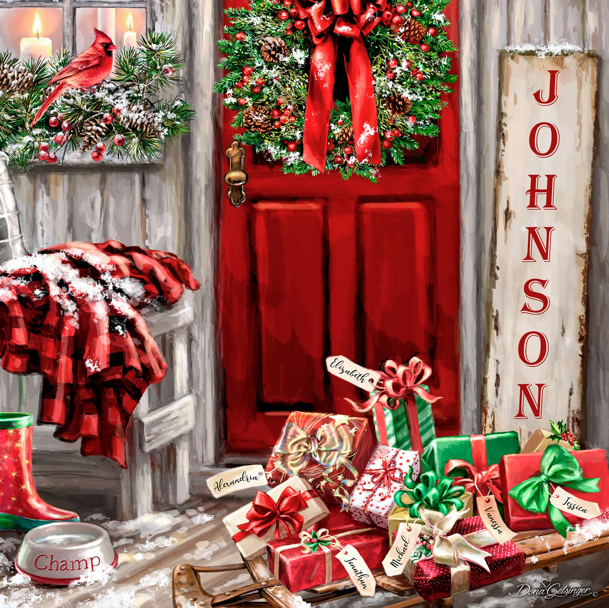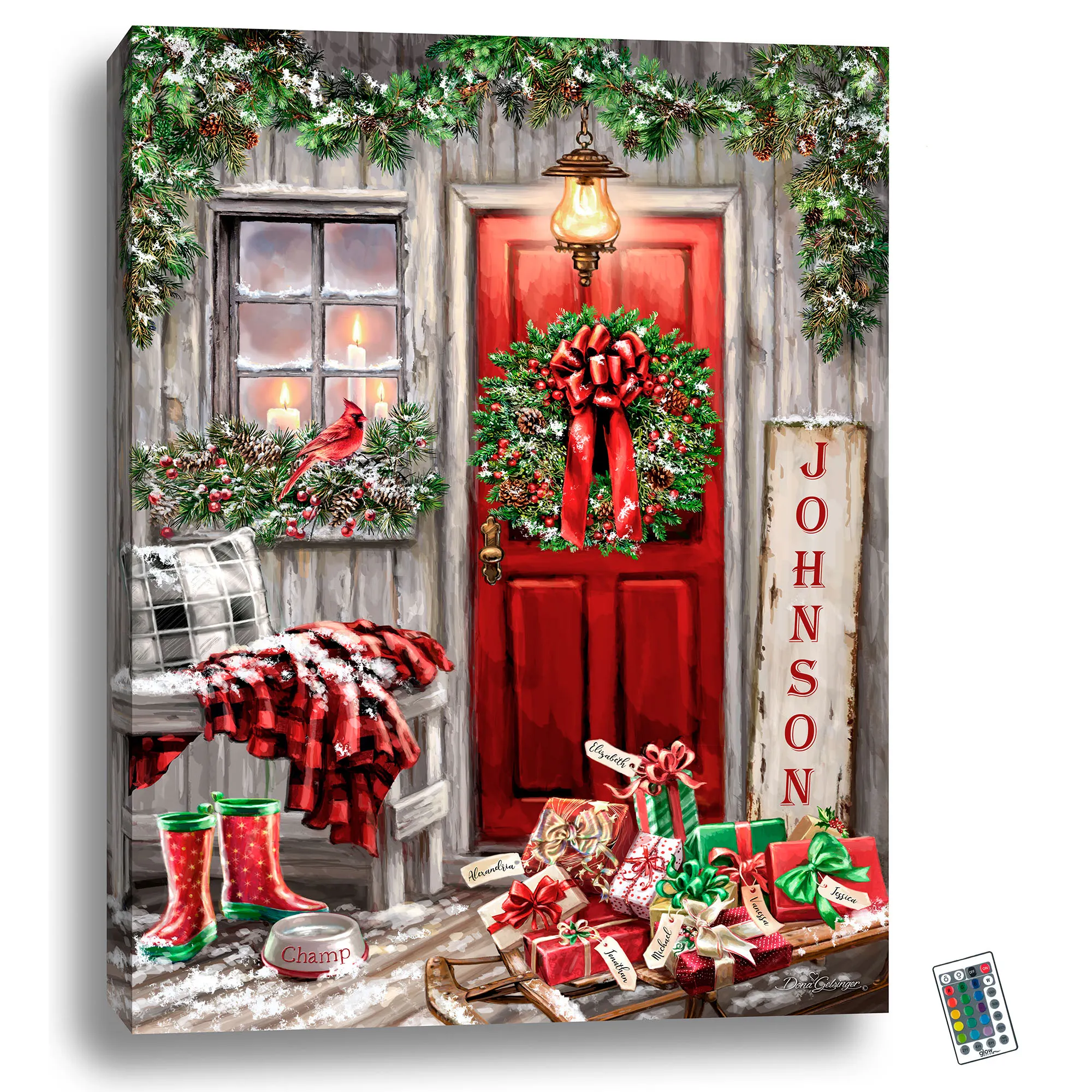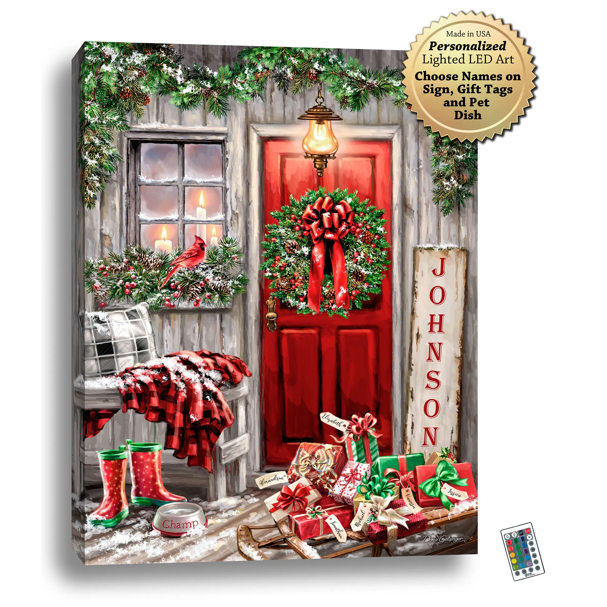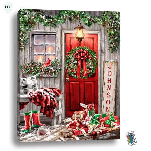 With everyone Home for Christmas, Santa has quite the haul to drop off, but personalized accents make sure no one in the family is missed. From artwork originally by (C)Dona Gelsinger, the lighted wall art features a decorated front porch. The leaning porch sign can be personalized with your last name, up to 10 characters. The pet bowl can read your furry friend's name, up to 12 characters. The wrapped presents on the sled can be labeled with your family's names, up to 8 names with 10 characters each. Fully illuminated by LED lights, the Glow Decor(R) printed artwork features a silky satin cloth gallery-wrapped around a wood frame. Requires three of your AA batteries or your power adapter for use with the included USB cord. The included multifunctional remote, battery also included, offers built-in two-, four-, or six-hour timer options; brightness control; various all-over color selections; and multiple glow modes. Wall art measures 18"Wx2"Dx24"H.