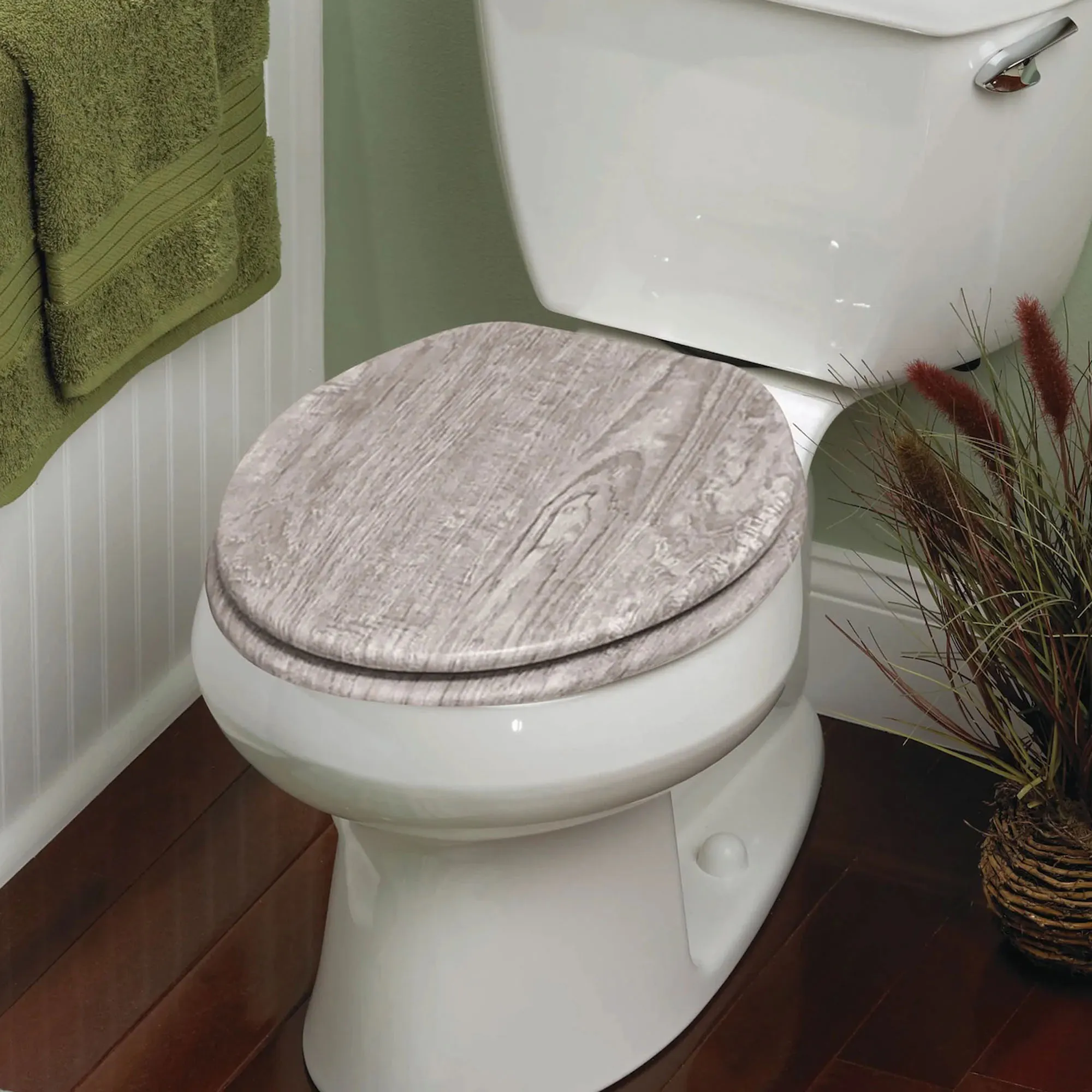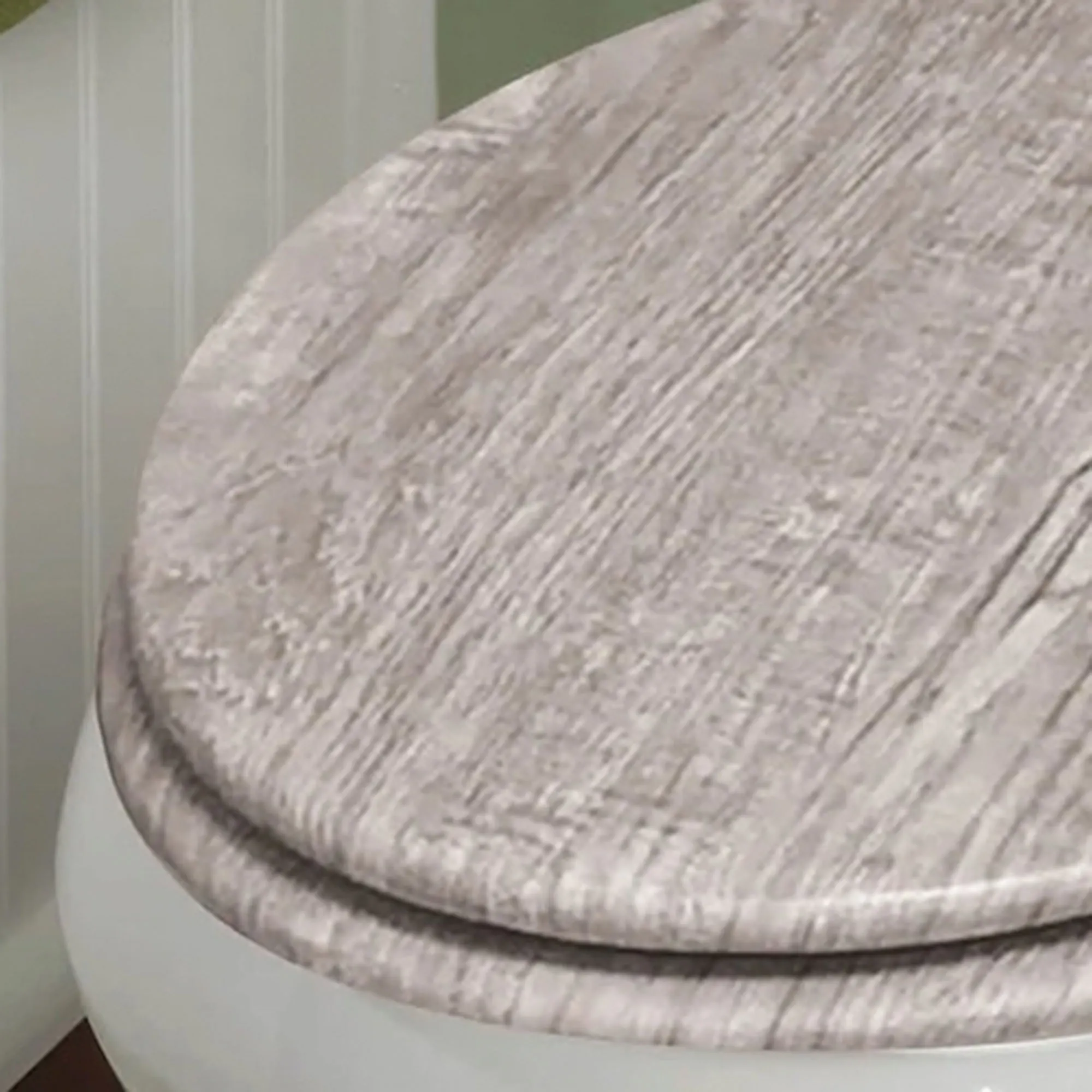 • Durable, gray wood toilet seat