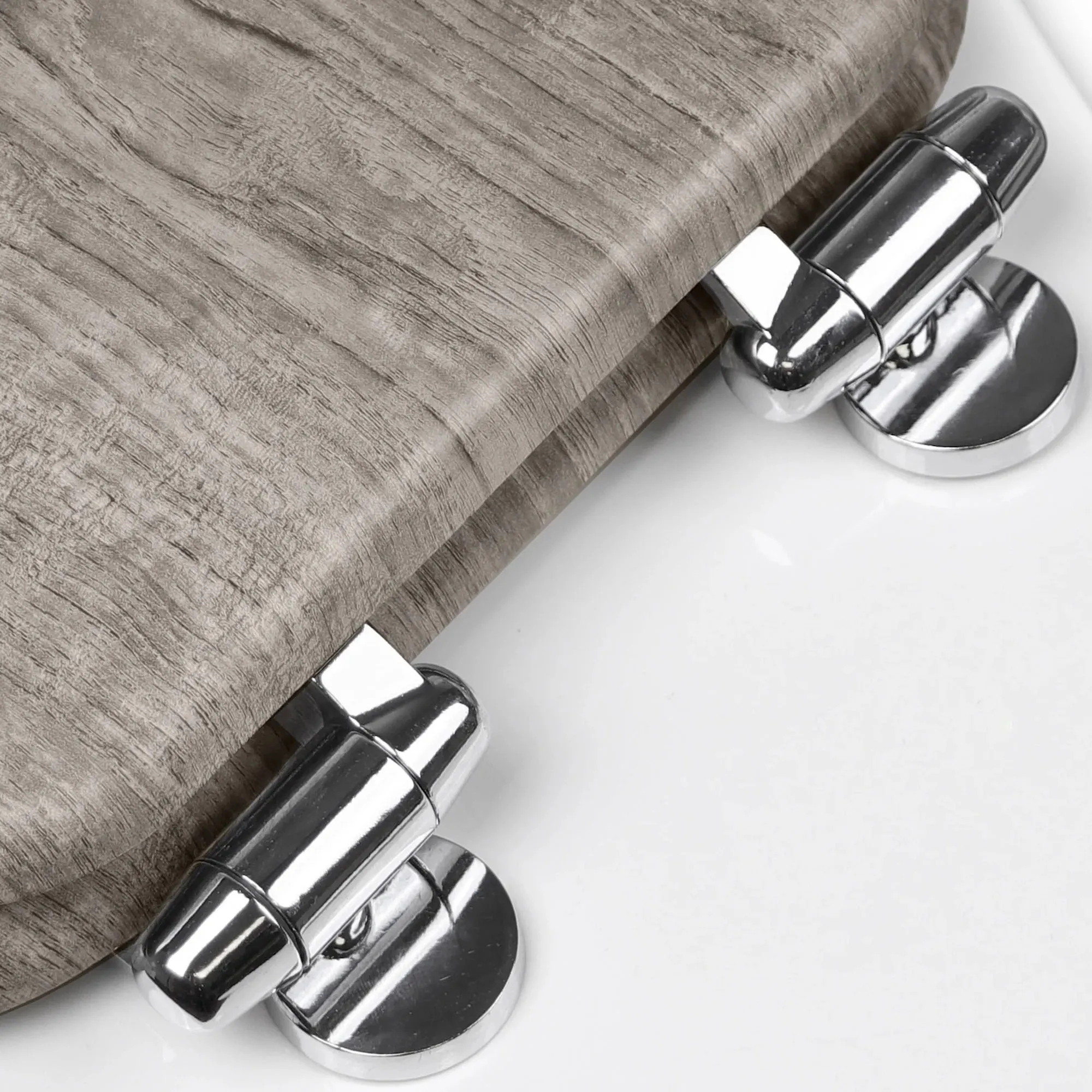 The Home Solutions Elongated Toilet Seat has an aesthetic appeal for any modern bathroom. This durable, gray wood toilet seat has a distressed wood look, a slow-close lid and seat, and chrome-plated metal hinges. Hardware is included. Distance between bolts is 5.5". Measures 14.5"Wx17"L. Clean with a soft, damp cloth using mild detergent. Do not use abrasive cleaners.