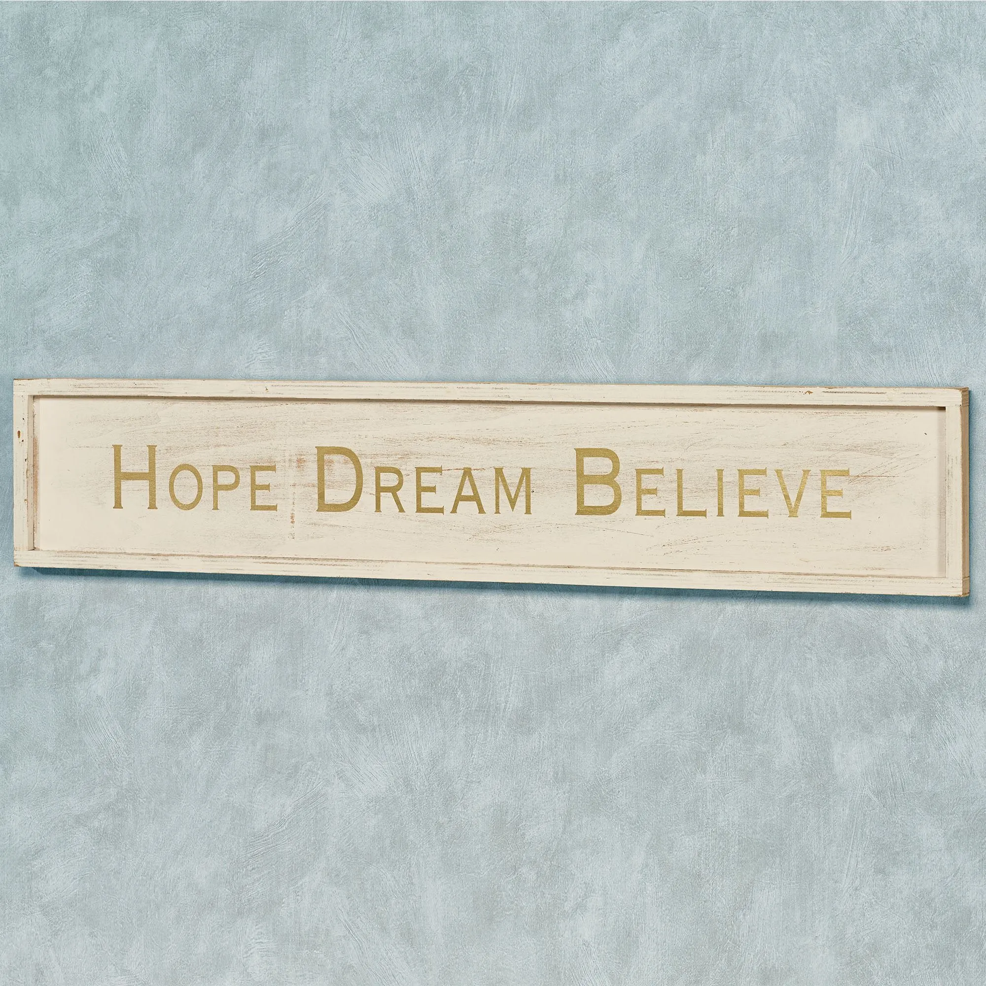 If you're in need of constant inspiration, the Hope Dream Believe Wall Plaque Sign provides a simple reminder with an elegant design. Finished in a washed light cream, the wood shadow box-style wall plaque features "Hope Dream Believe" in golden metallic words. Measures 40"Wx1.5"Dx7.5"H.
