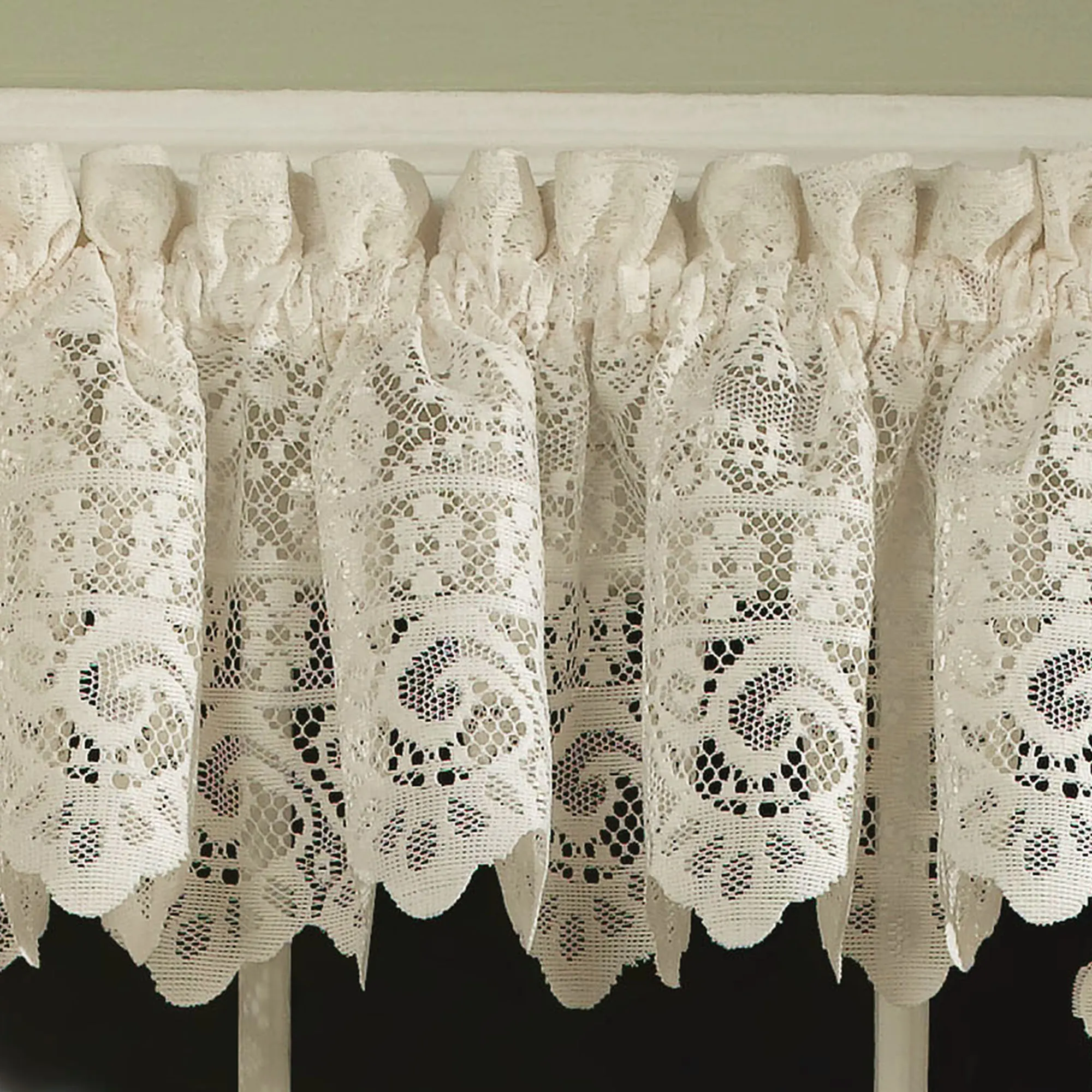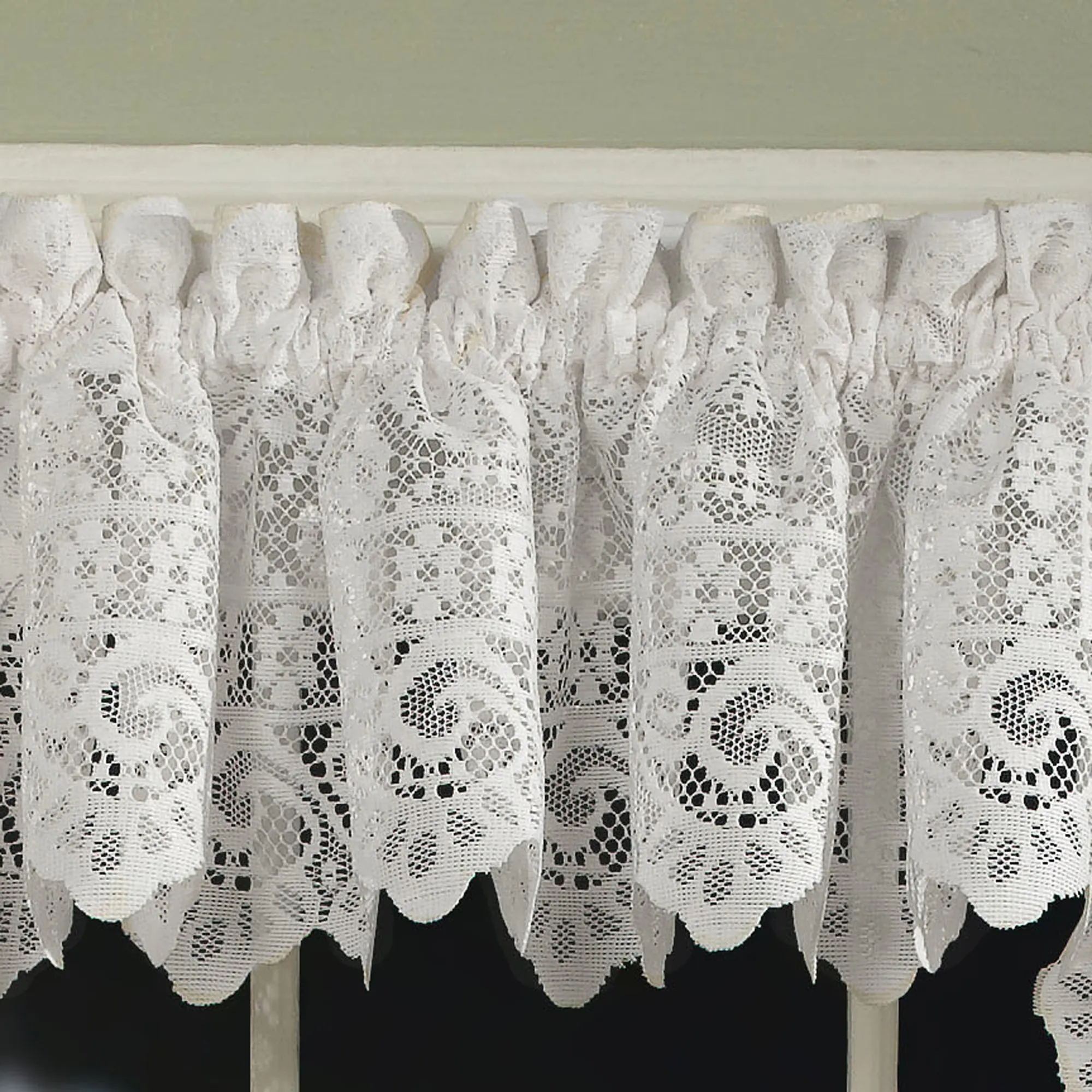 Love these lace curtains in white! So pretty through the sunlight. Brightens my kitchen. Had to order valance also. Frames my window without obstructing the view. ❤️
