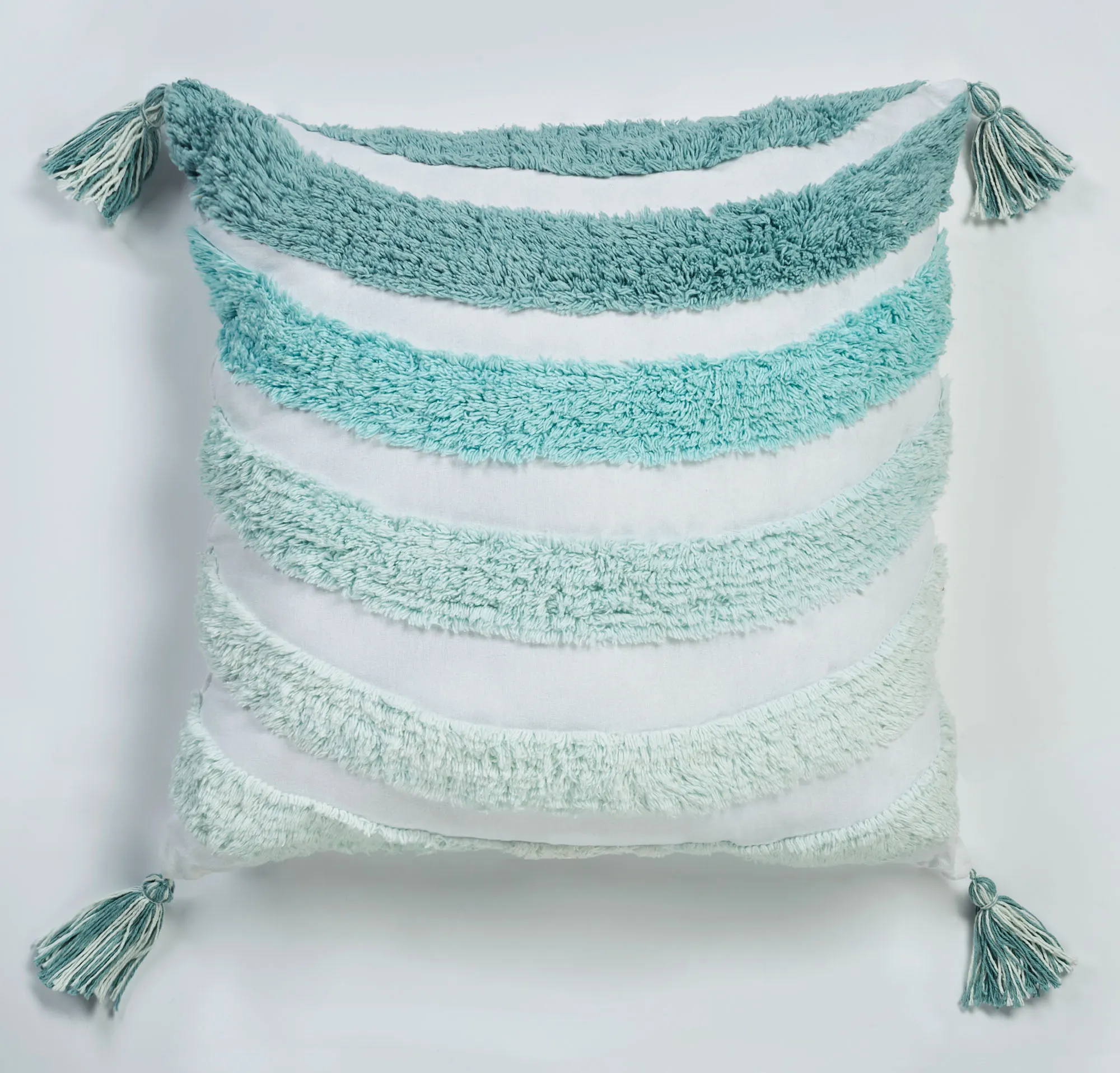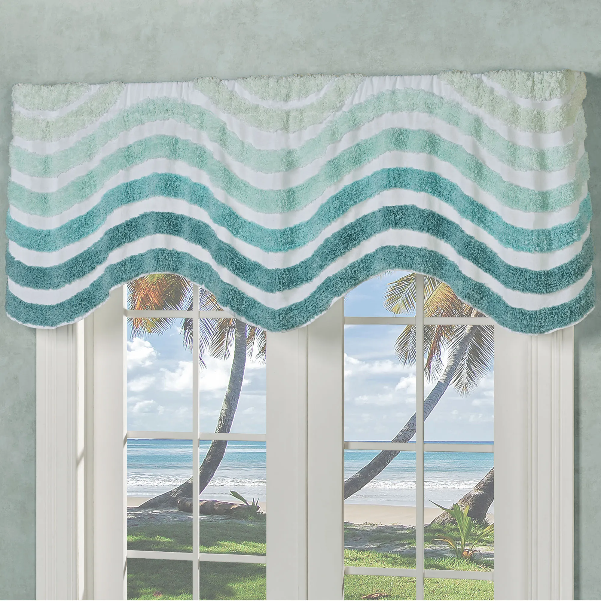 Cast your eyes to the Horizon Aqua Bedding and take in the coastal simplicity. In a tufted design, waves of aqua, teal, turquoise, and pale green fill the white cotton/polyester blend ground.