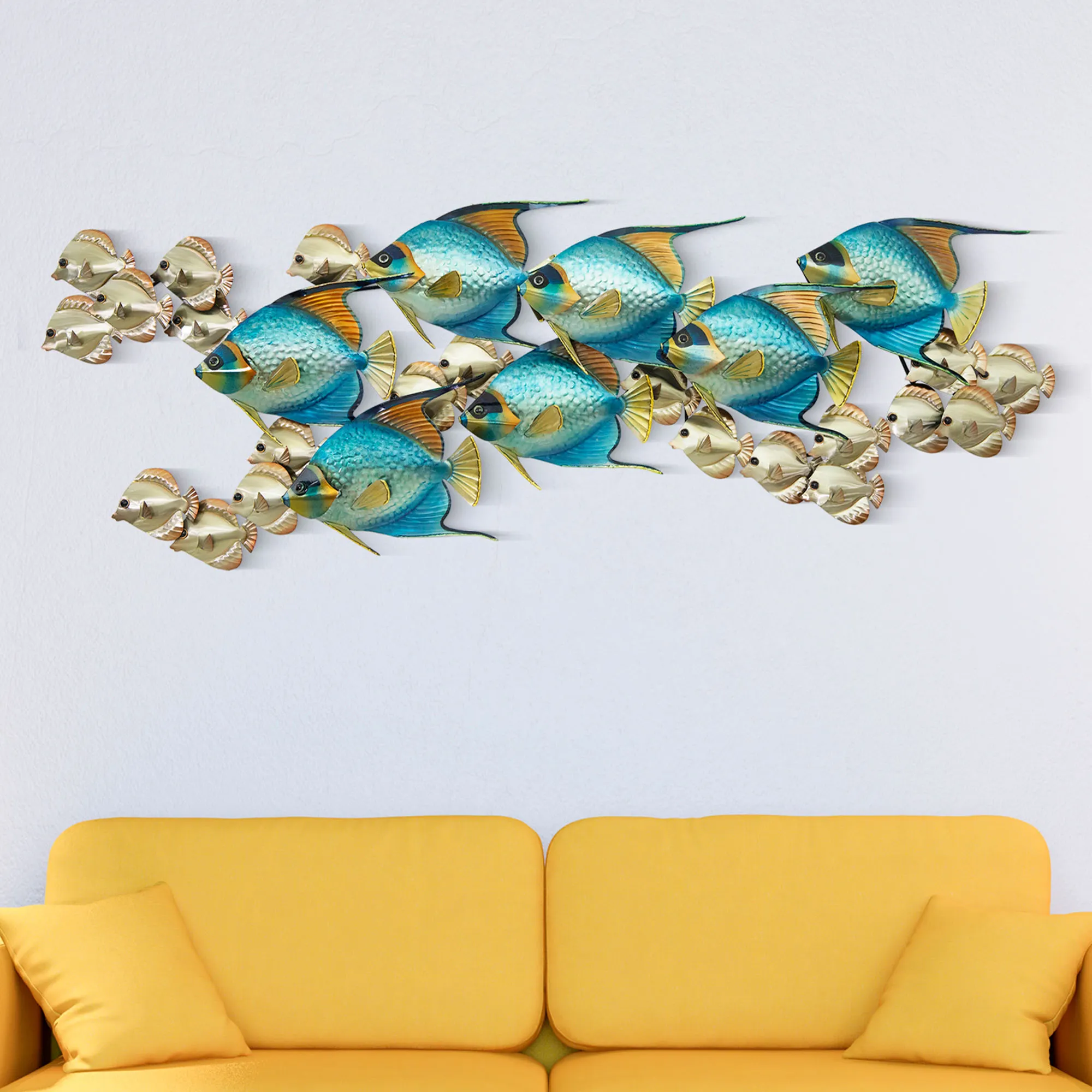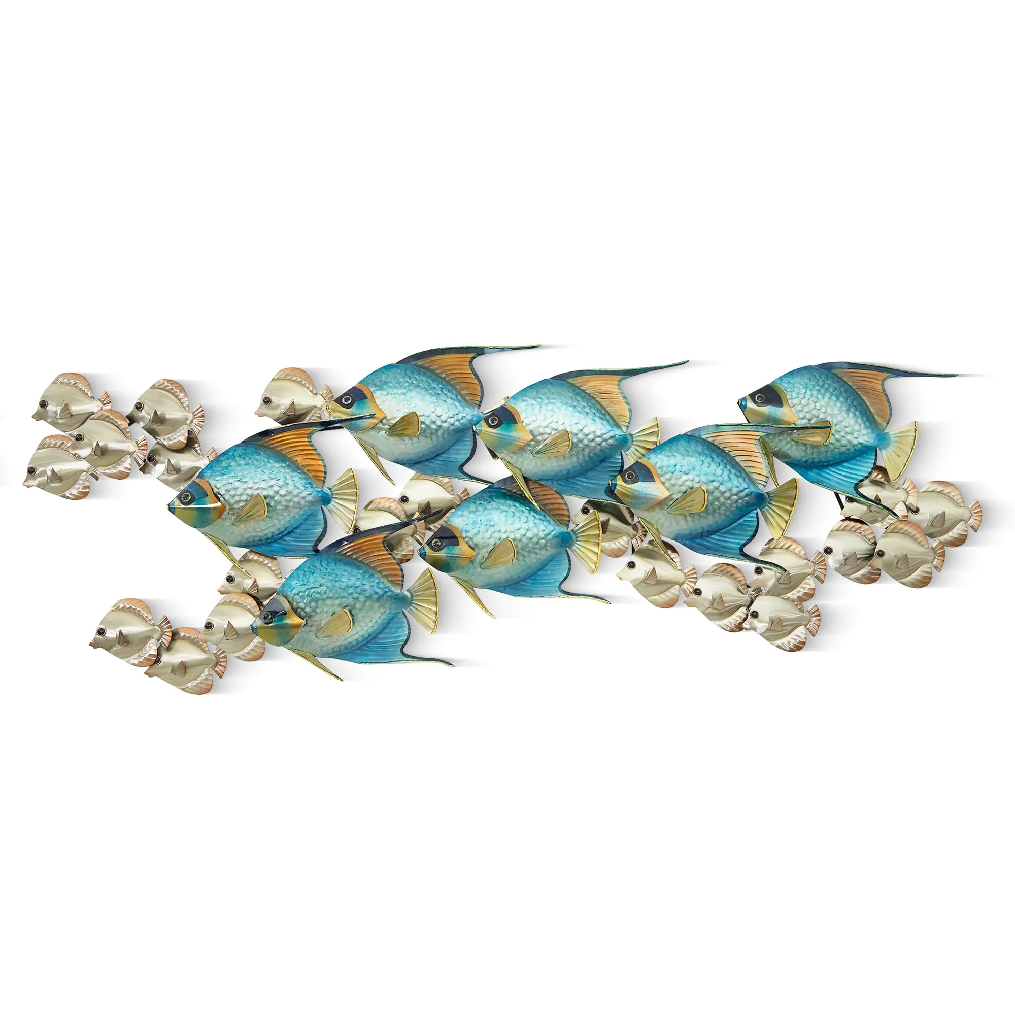 Horizontal Blue Angelfish School with Tangs Indoor Outdoor Metal Wall Sculpture