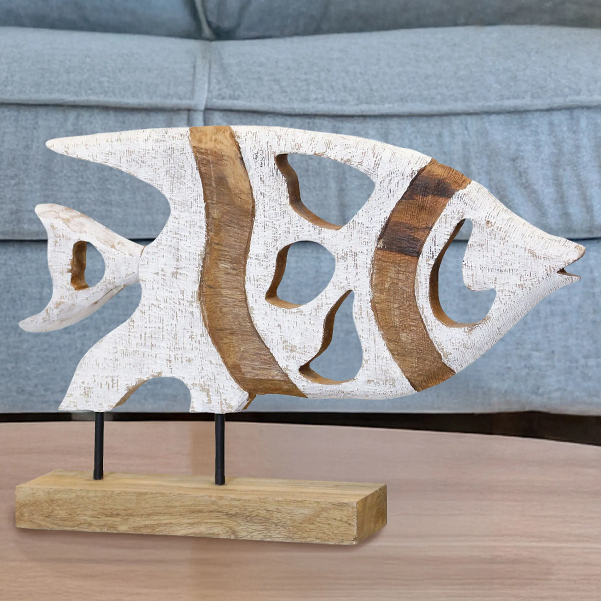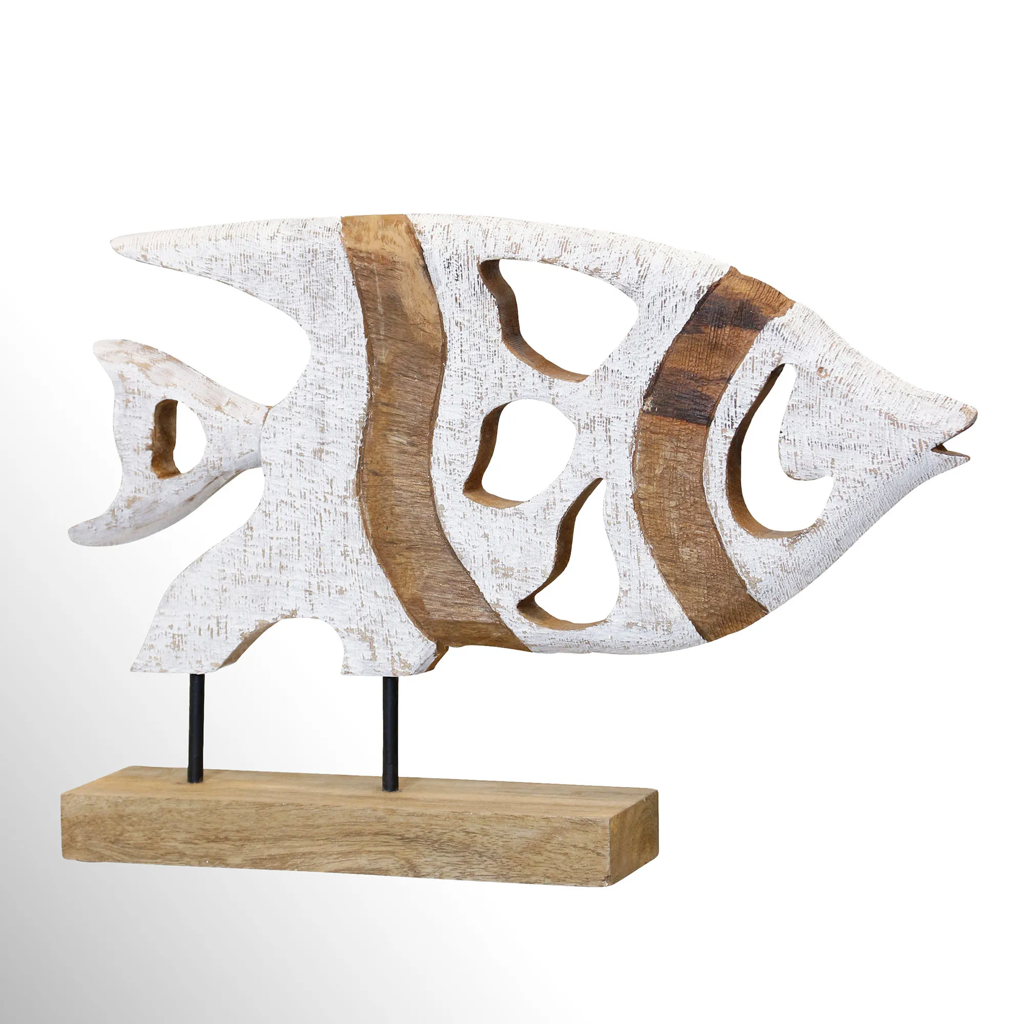 Search the sea for this adorable Horizontal Angelfish Sculpture. Made of wood, this fish has cocoa brown and white stripe designs, openwork detailing, a cute face, and a rectangular base. The horizontal fish sculpture is 19"Wx4"Dx12"H; weighs 16 lbs.
