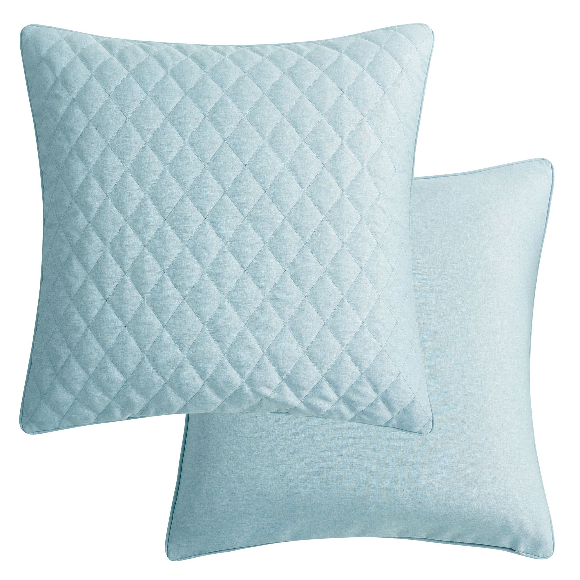 The piped European Sham has diamond quilting, reverses to mingled light blue and white, and has a zipper closure.