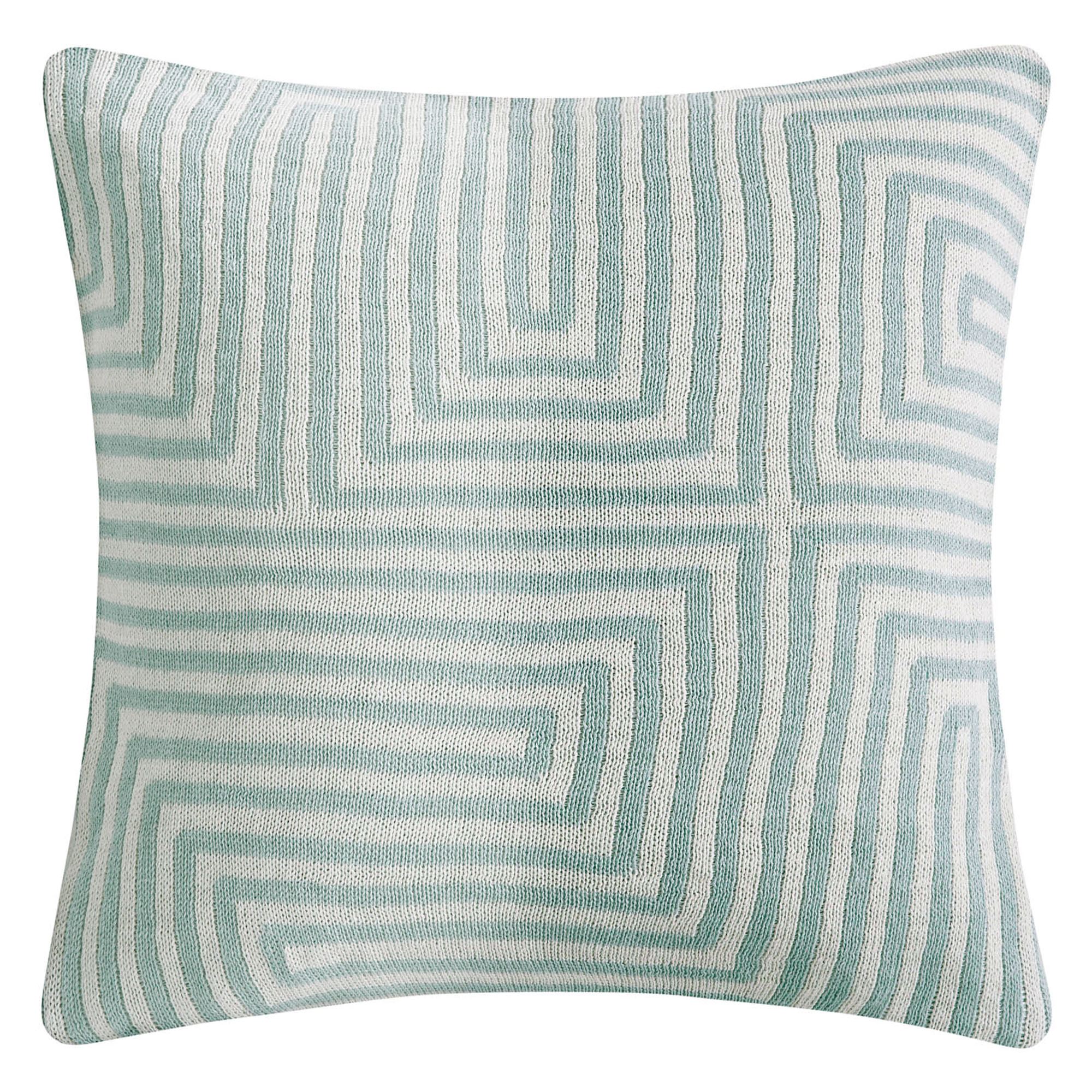 Tailored Pillows have zipper closures. Spot clean. The silk/cotton aqua Rectangle has diagonal pleat accents. The aqua and ivory Square has a geometric pattern on a cotton knit face and is reversible.