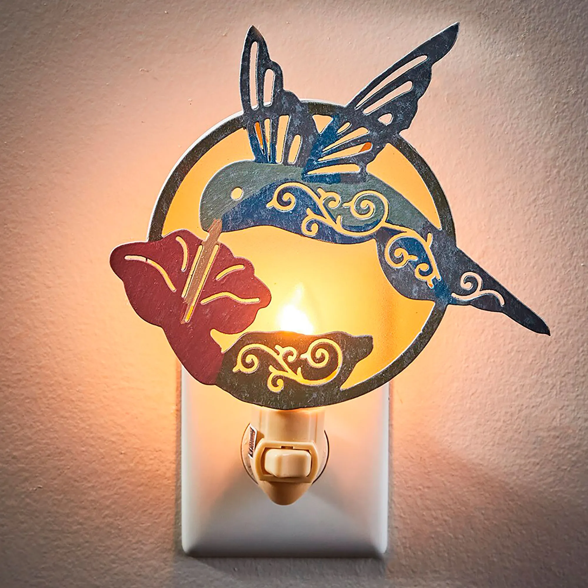 Hummingbird and Flower Glass and Laser Cut Metal Plug In Nightlight