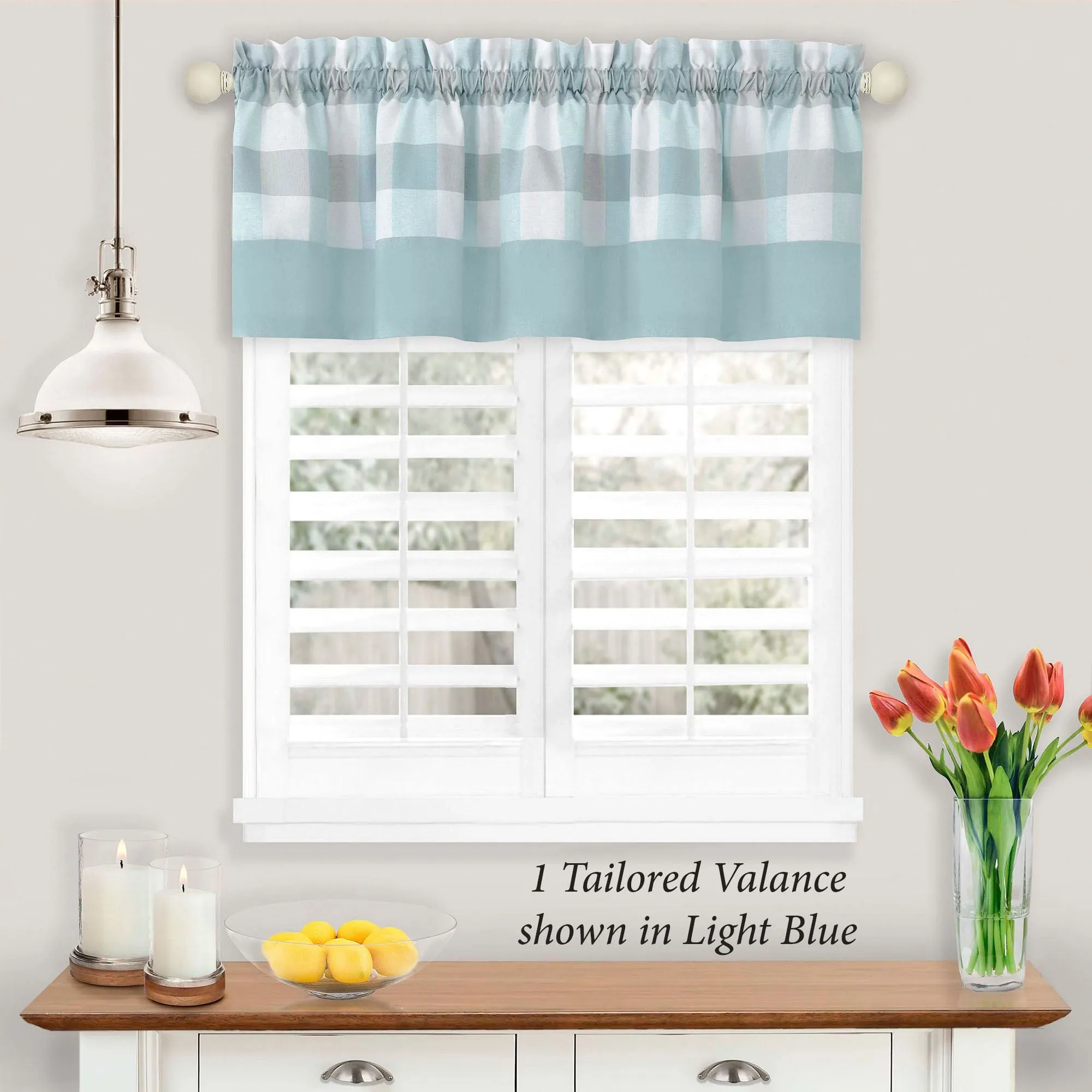 The Hutton Window Treatment trims your view with classic style. Each polyester/cotton window treatment features a buffalo plaid design that hangs via a 1.5" rod pocket. Each item is finished with a coordinating solid band. The Tier/Valance Set includes one valance, 58"Wx14"L; and one tier pair, 57"W. Valance is also available separately. Machine washable. Imported.
