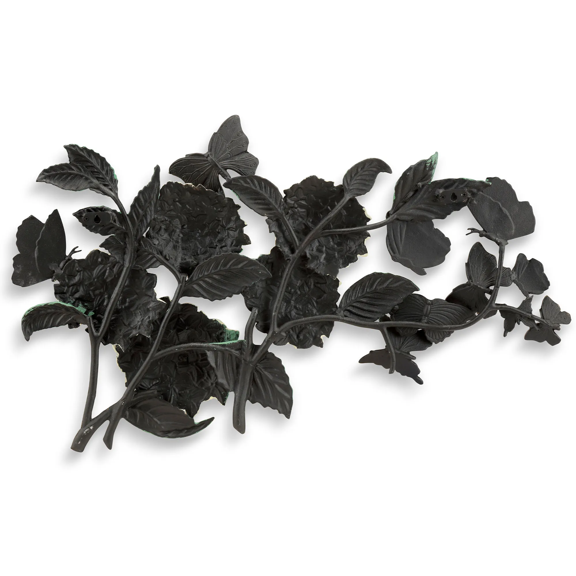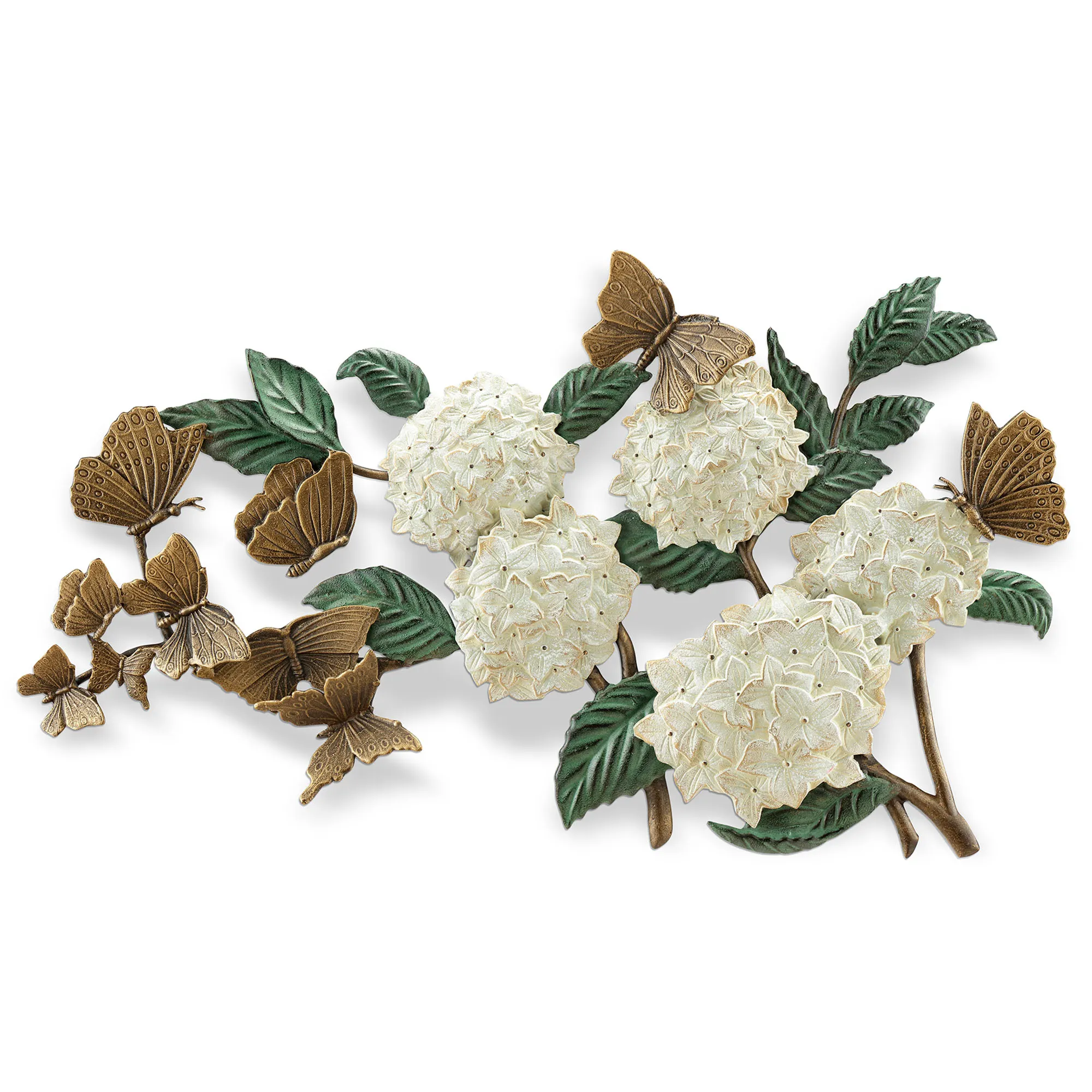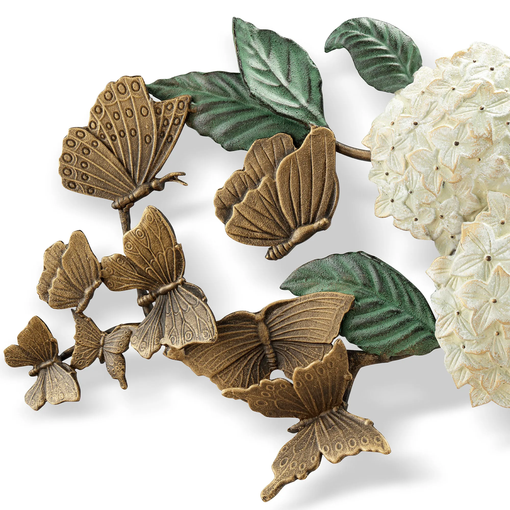 The Hydrangea and Butterfly Indoor/Outdoor Wall Art flourishes with the sweetness of nature's beauty. This hand-cast aluminum wall art is beautifully finished by hand and features intricate hydrangea blooms in ivory, green leaves, and dimensional antique gold butterflies. Indoor or outdoor year-round use. Measures 25"Wx2"Dx17"H.