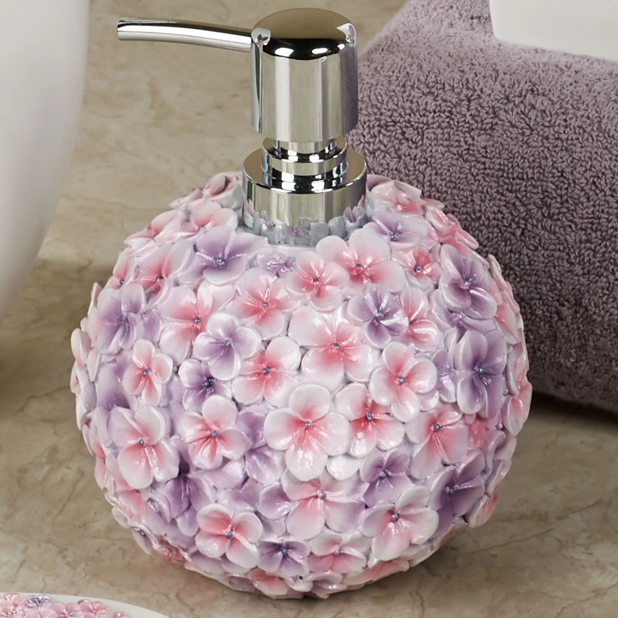 The Hydrangea Bloom Floral Bath Accessories are resin.