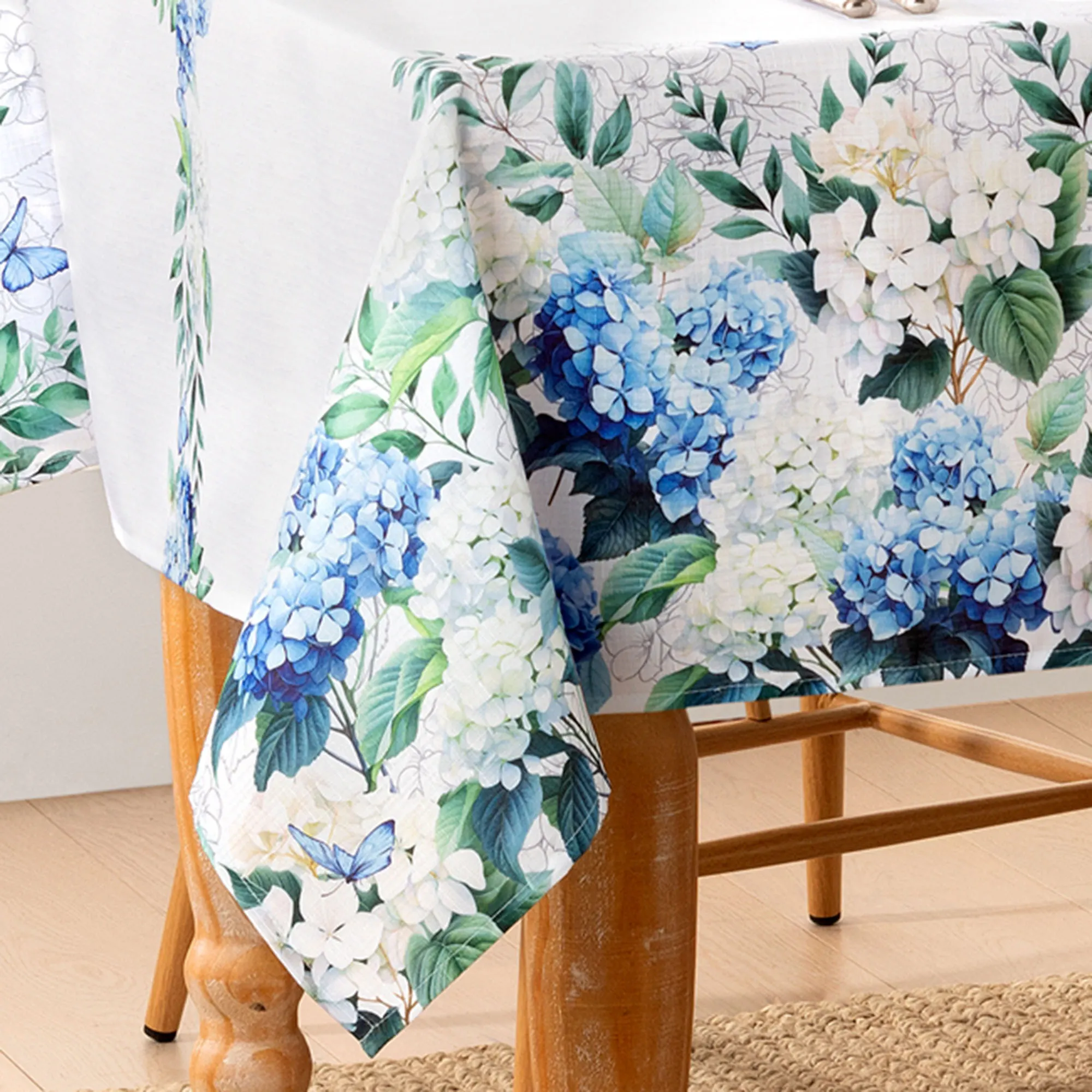 Transform every meal into a Hydrangea Garden party with bold floral table linens. Enticing blue butterfly visitors; beautiful printed navy, light blue, and white hydrangeas; and sage green leaves decorate the edges of each white polyester table accent. More flower and leaf designs decorate the center of each Tablecloth. Specify Round Tablecloth, Rectangle Tablecloth, or Napkin Set of 4. Machine washable. Imported.