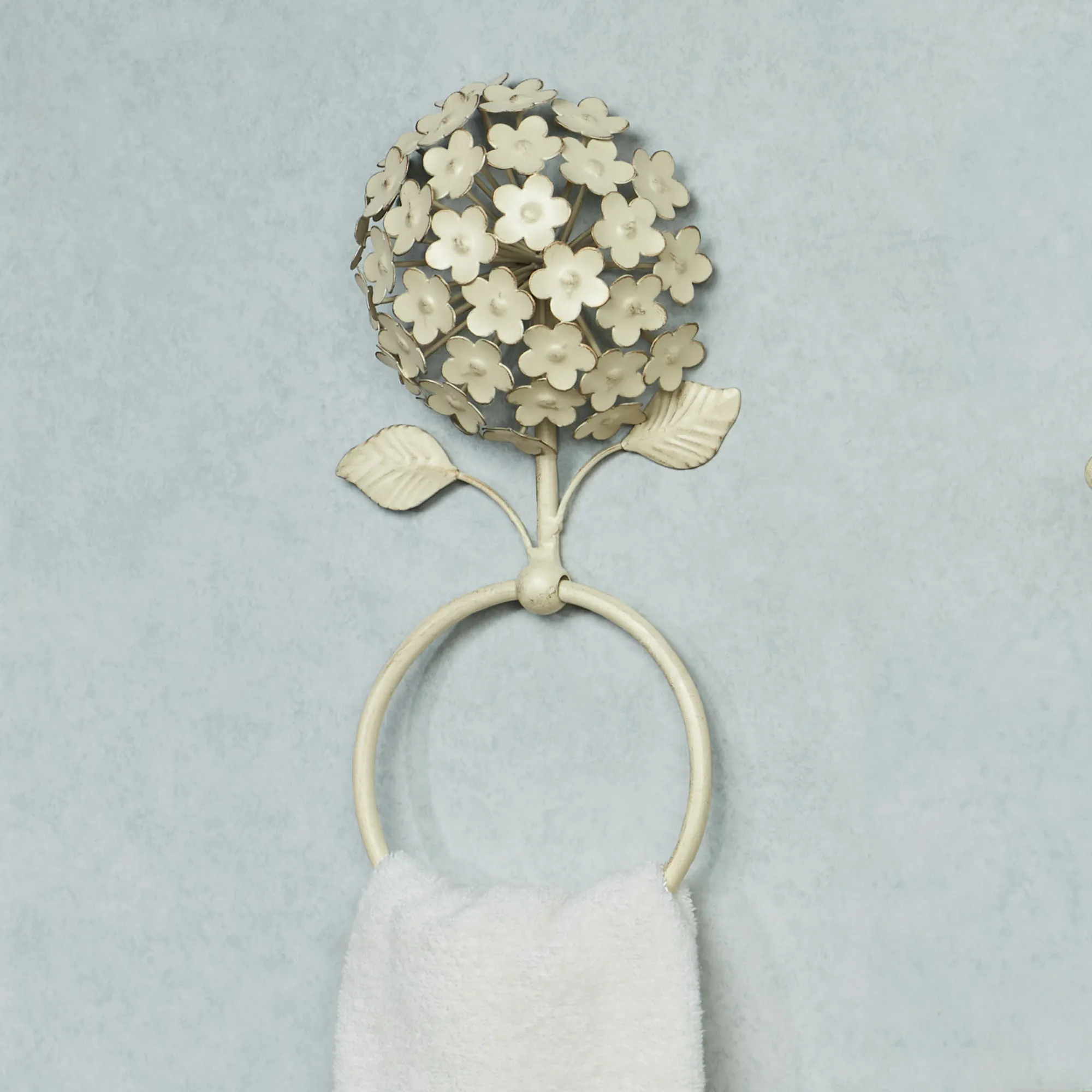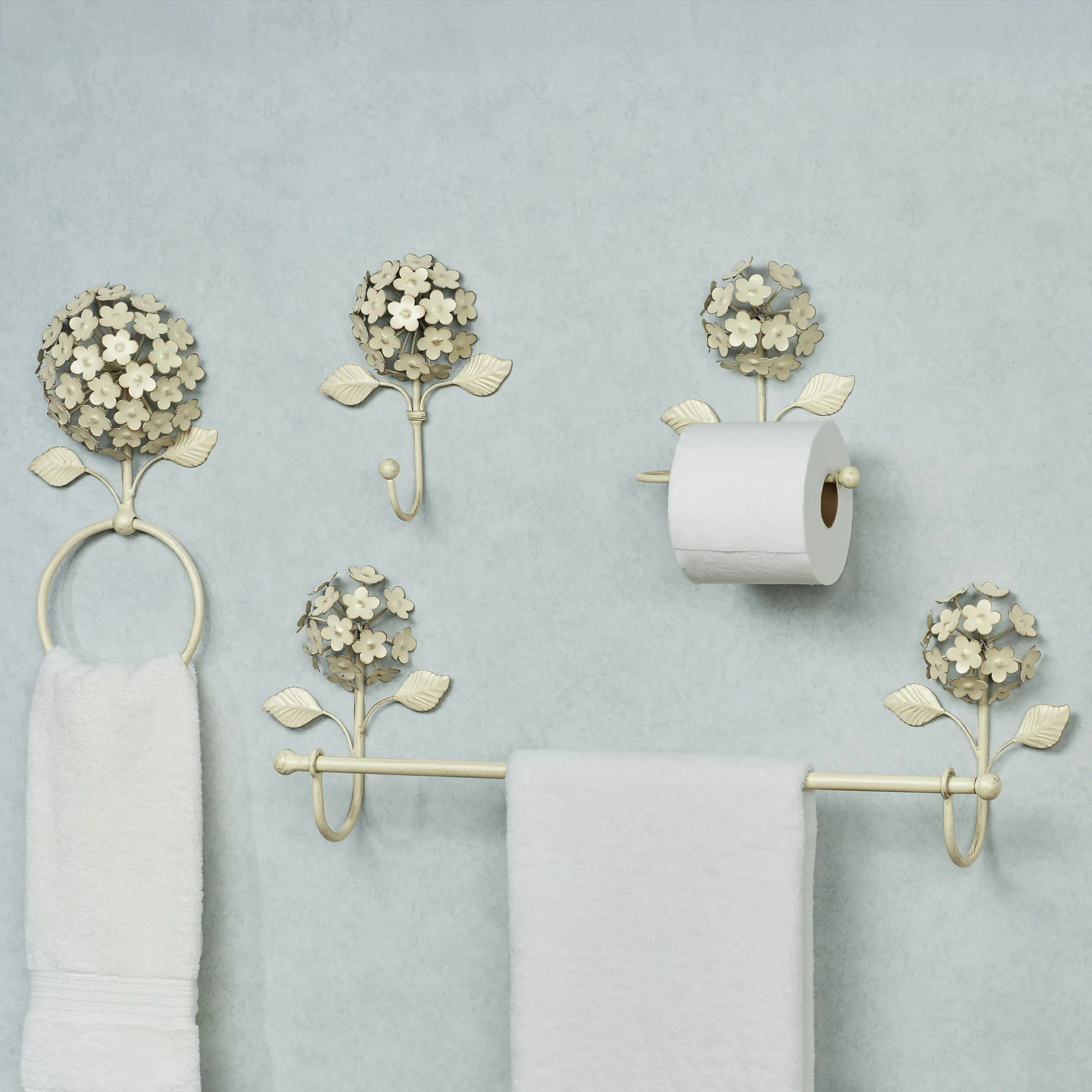 Delicate pom-like clusters create the beautiful look of Hydrangea blossoms. Handcrafted of metal, these floral bath wall fixtures have a creamy gold powder-coat finish with handpainted embellishments. Specify Towel Bar, Wall Hook, Wall Toilet Paper Holder, or Towel Ring. Towel Bar has a 22"W space for towels. Wall Hook has a single hook with a ball finial. Wall Toilet Paper Holder can hold up to one mega roll. Click on the Sizes tab for full measurements.