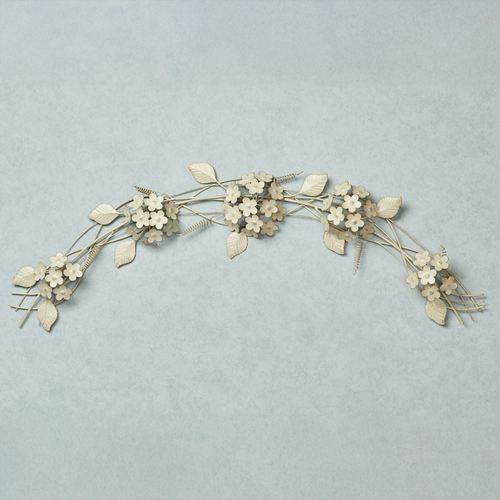 Delicate pom-like clusters create the beautiful look of Hydrangea blossoms. Handcrafted of metal, this wall topper features a swag of branches and blooms and has a creamy gold powder-coat finish with stunning handpainted accents. Measures 31"Wx2"Dx10"H.
